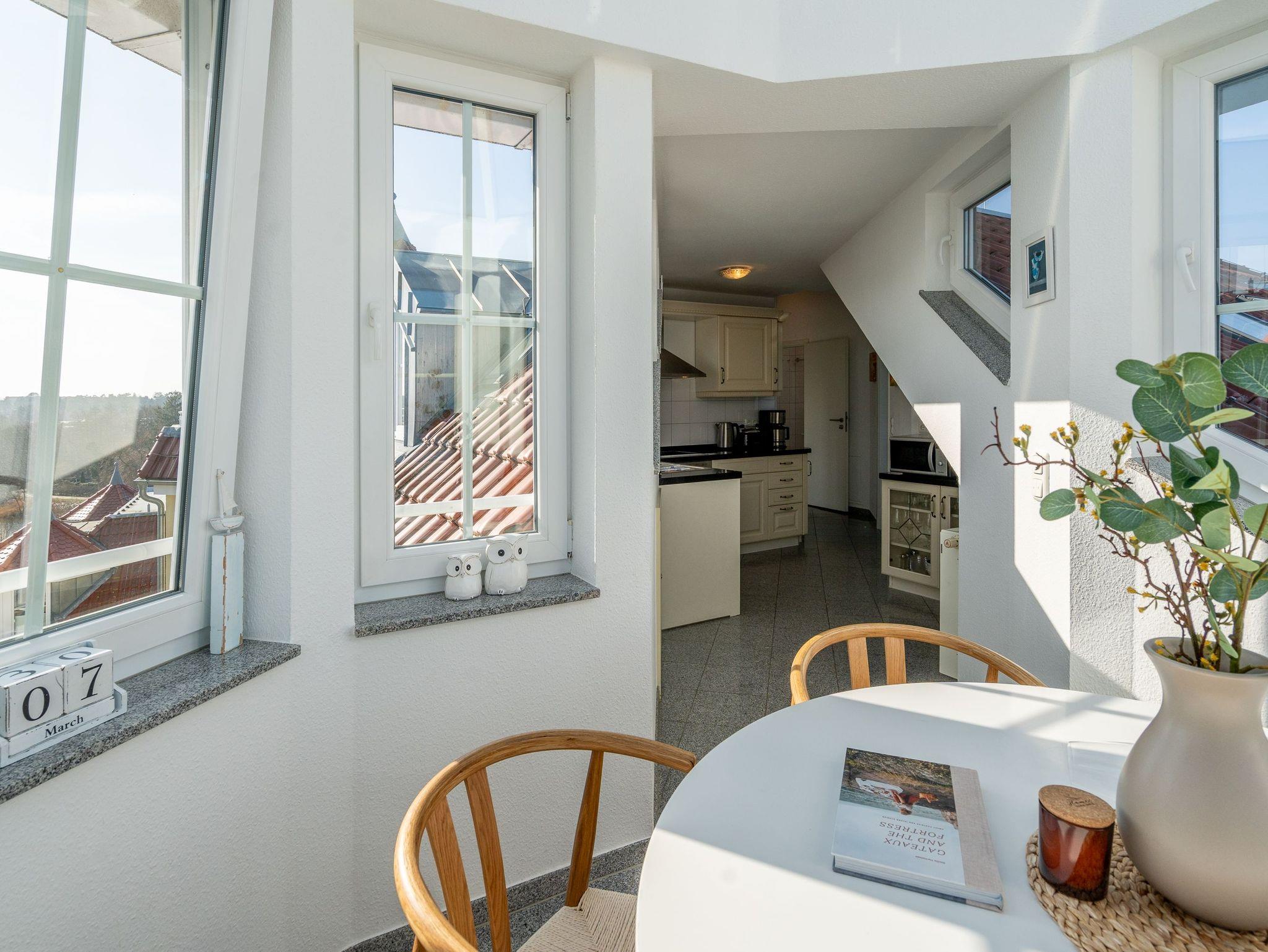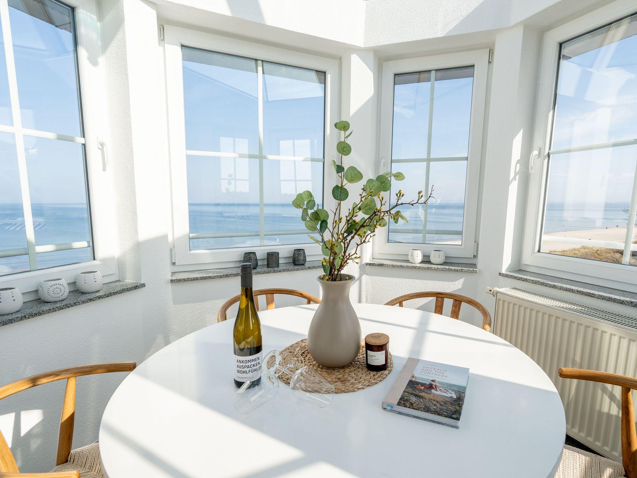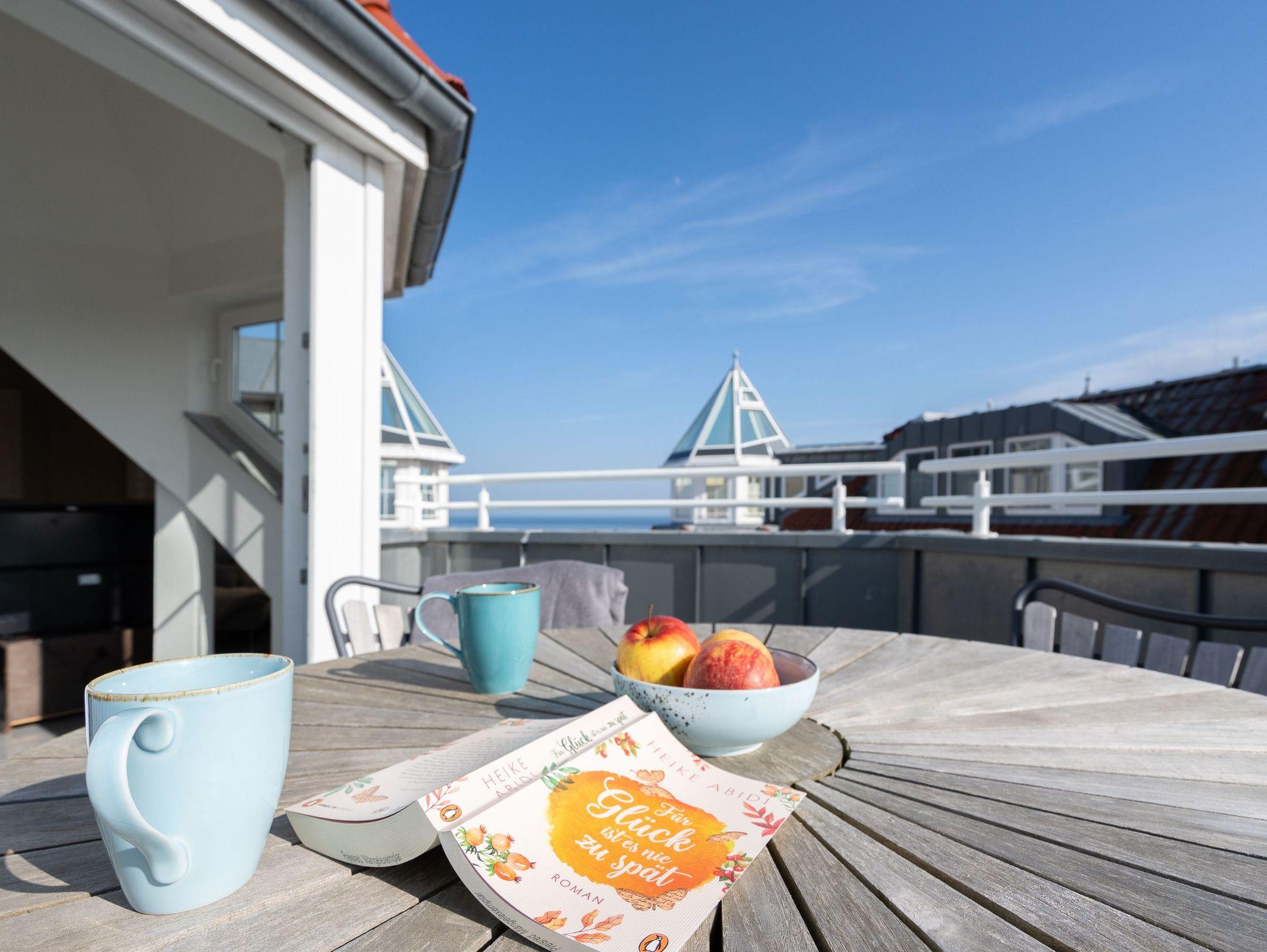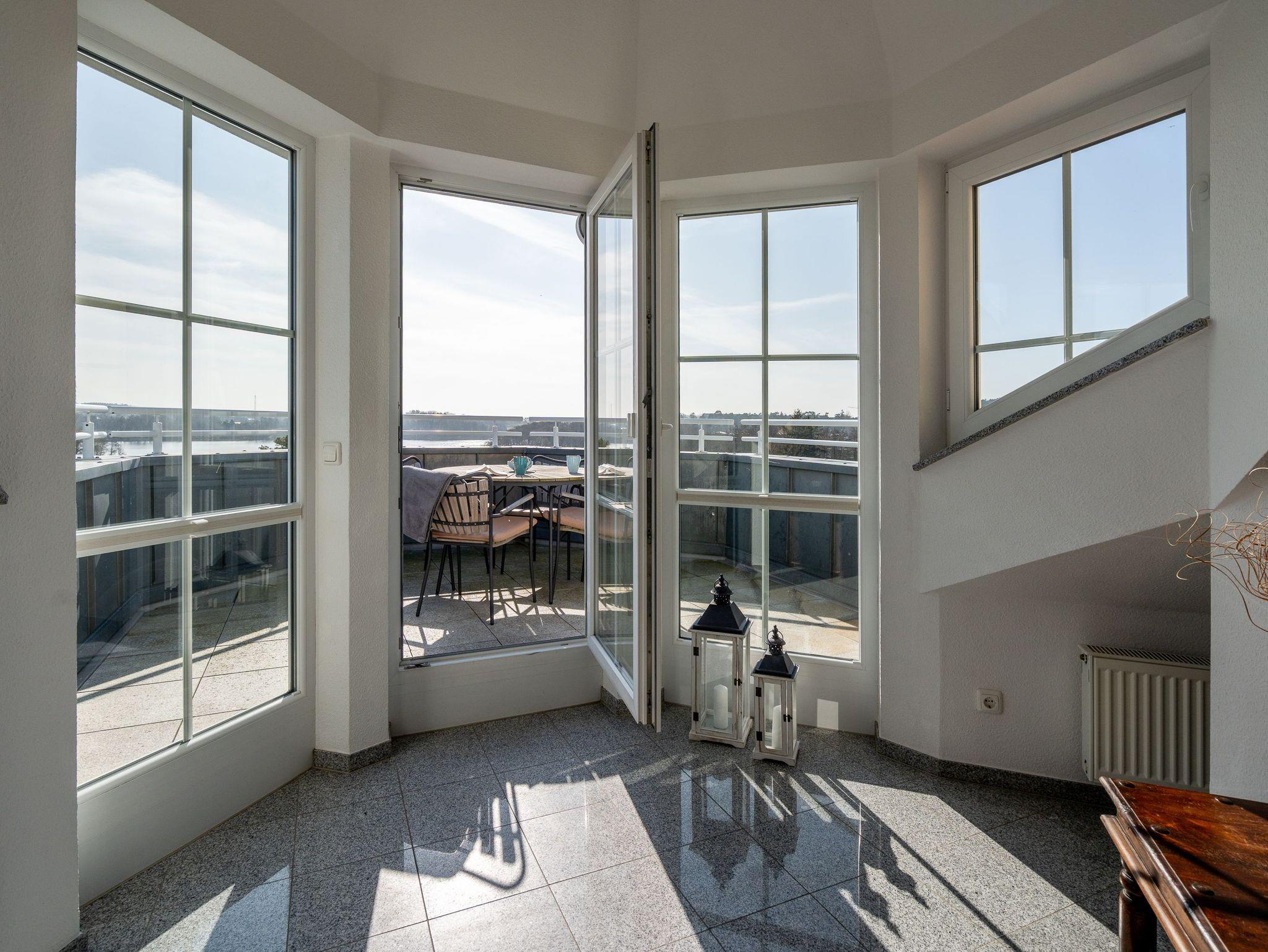 Genießen Sie den einzigartigen Ausblick auf das Meer aus unserer stilvoll und modern eingerichteten 3-Raum-Ferienwohnung in der Dünenresidenz. Die 75 m² große Dachgeschosswohnung bietet höchsten Komfort und ist bequem mit dem Aufzug erreichbar. Zwei gemütliche Schlafzimmer mit Doppelbetten ( Boxspringbett 1,60m x 2,00m / Doppelbett 1,80m x 2,00m), ein modernes Duschbad sowie eine voll ausgestattete Küche lassen keine Wünsche offen. Der lichtdurchflutete Essbereich im Glasturm schafft eine besondere Atmosphäre ? hier speisen Sie mit direktem Blick auf die Wellen. Der großzügige Wohnbereich öffnet sich zu einem Balkon, von dem aus Sie den Blick auf den Schloonsee und auch das Rauschen des Meeres genießen können. Die Wohnung bietet Platz für bis zu 4 Personen sowie ein Kleinkind bis 3 Jahre im Kinderreisebett. Auf Wunsch stellen wir Ihnen gern ein Kinderreisebett (ohne zusätzliche Matratze [&] Bettzeug) sowie einen Kinderhochstuhl (gegen Aufpreis) zur Verfügung. Für Ihren PKW steht Ihnen ein fester Stellplatz in der Tiefgarage zur Verfügung. Erleben Sie Erholung pur mit grandiosem Meerblick ? ein erholsamer Aufenthalt erwartet Sie!