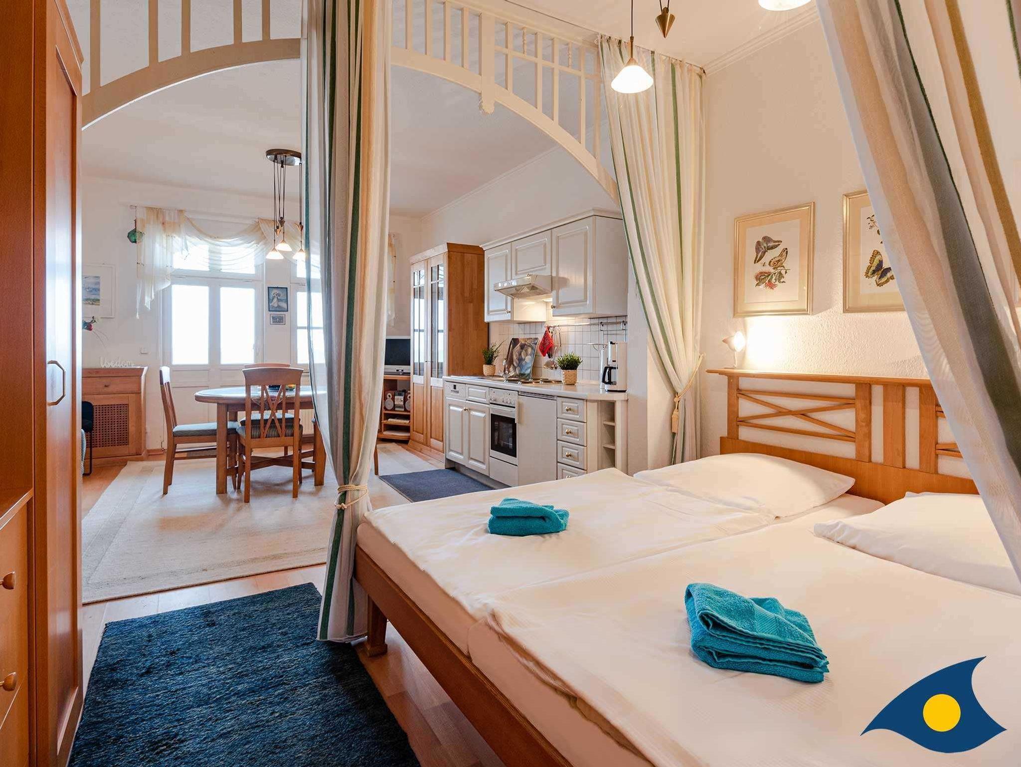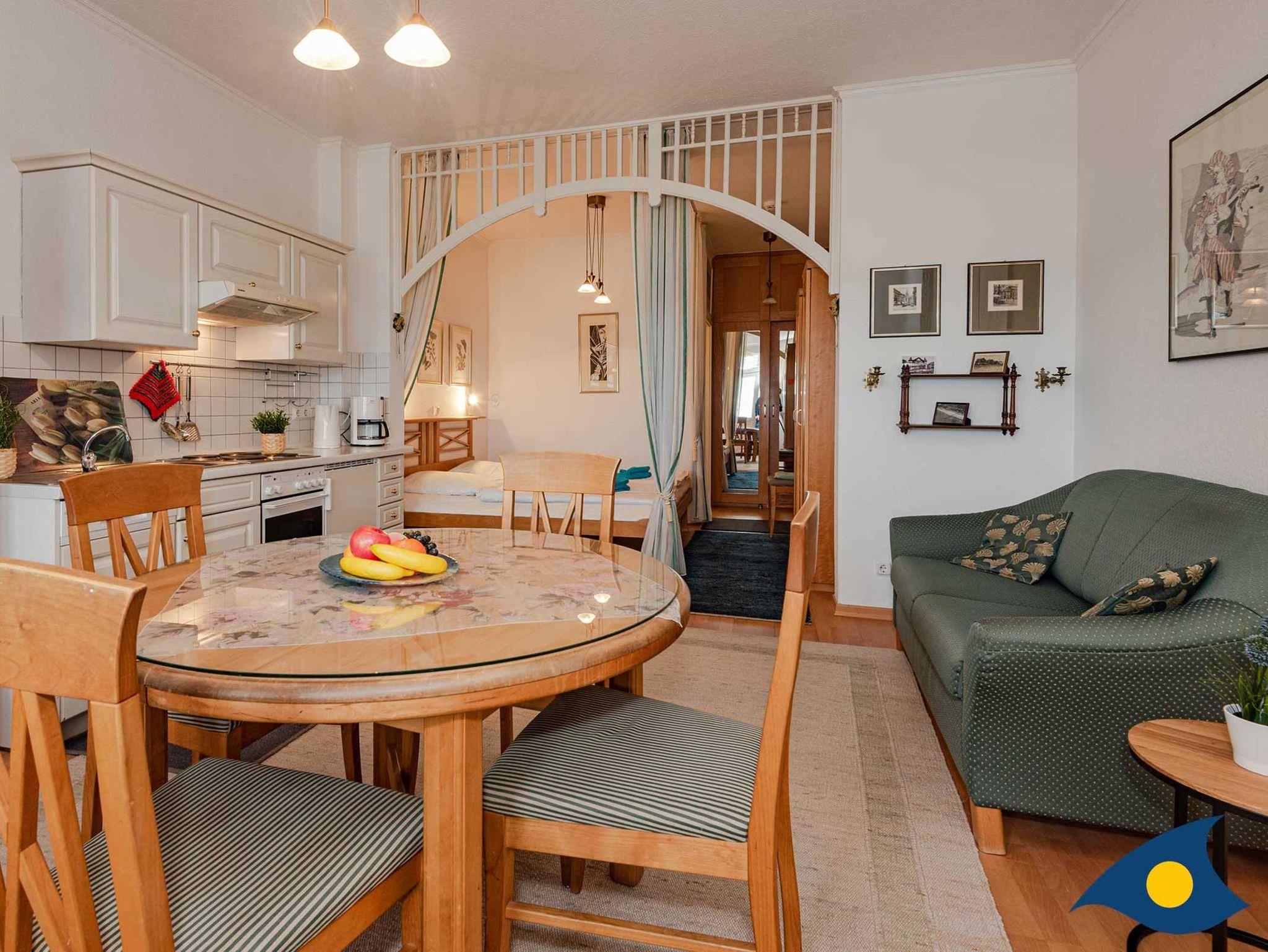 Das bequeme Sofa, schöne Bilder sowie der original erhaltene Rundbogen sorgen für ein gemütliches Ambiente. Der durch Vorhang abtrennbare Schlafbereich ist sehr komfortabel und praktisch angeordnet. Die Küche Küchenzeile mit Backofen, 4-Plattenherd, Kühlschrank und Spülmaschine ist vollständig ausgestattet.