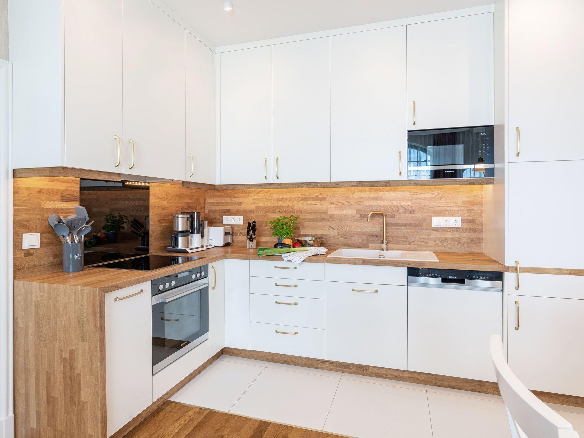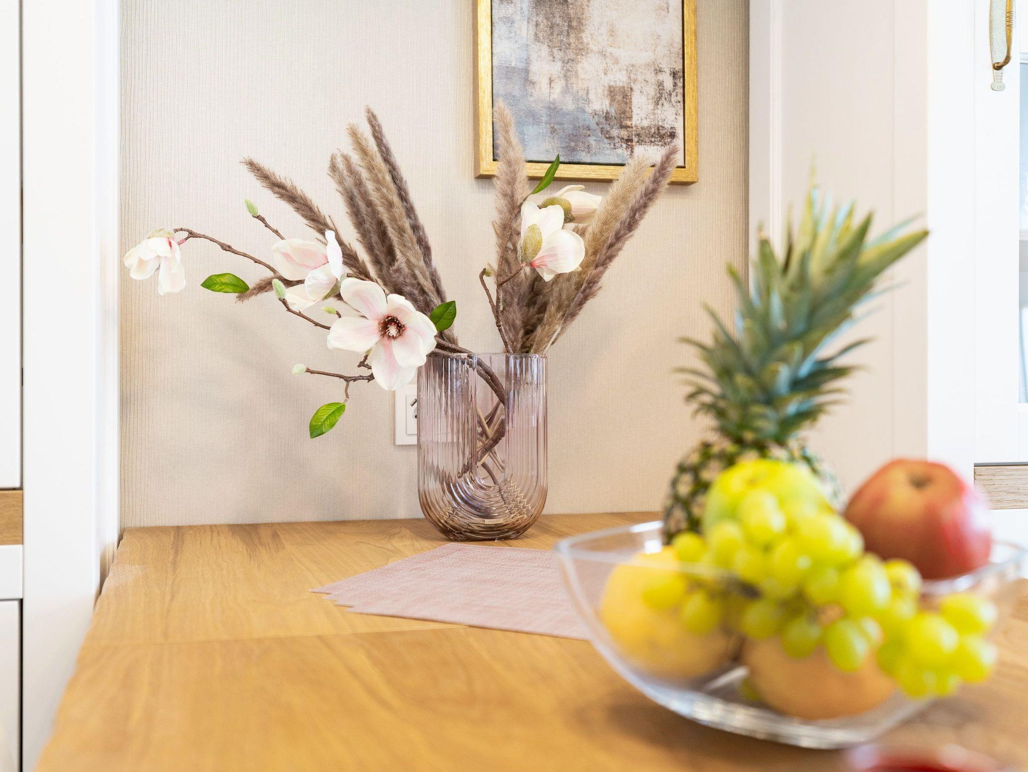 Die voll ausgestattete Küche, individuell von einem regionalen Tischler gefertigt, ist ideal auf Familien abgestimmt. Backofen, Mikrowelle, Kühlschrank mit Gefrierfach, Toaster, Wasserkocher und Kaffeemaschine stehen zur Verfügung. Der große Essplatz für bis zu sechs Personen mit Blick in den grünen Park lädt zu ausgedehnten Frühstücken, gemeinsamen Mahlzeiten und fröhlichen Familienmomenten ein. Hochwertiges Echtholzparkett und langlebige Designer-Tapeten aus den USA unterstreichen den exklusiven Charakter des Appartements.