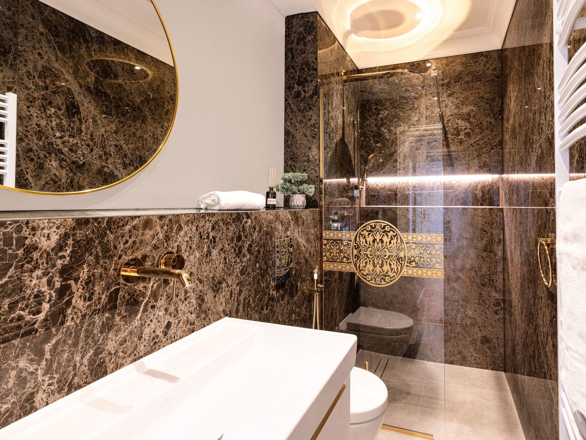Das modern gestaltete Badezimmer überzeugt mit einer stilvollen Kombination aus großformatigen dunklen Natursteinfliesen, heller Badkeramik sowie eleganten Messing-Armaturen. Die bodengleiche Dusche rundet den hohen Wohnkomfort ab und macht den Start in den Tag besonders angenehm.