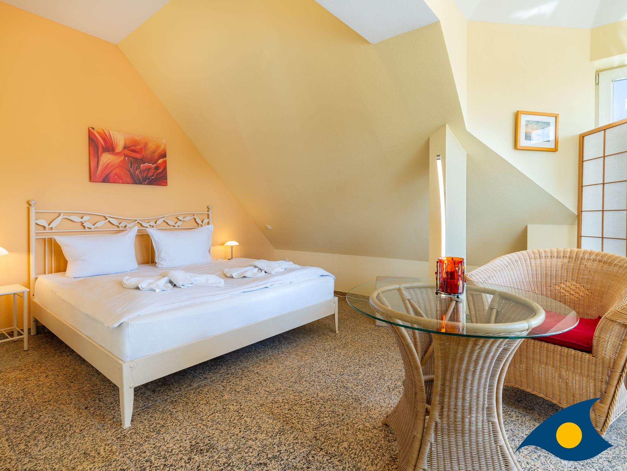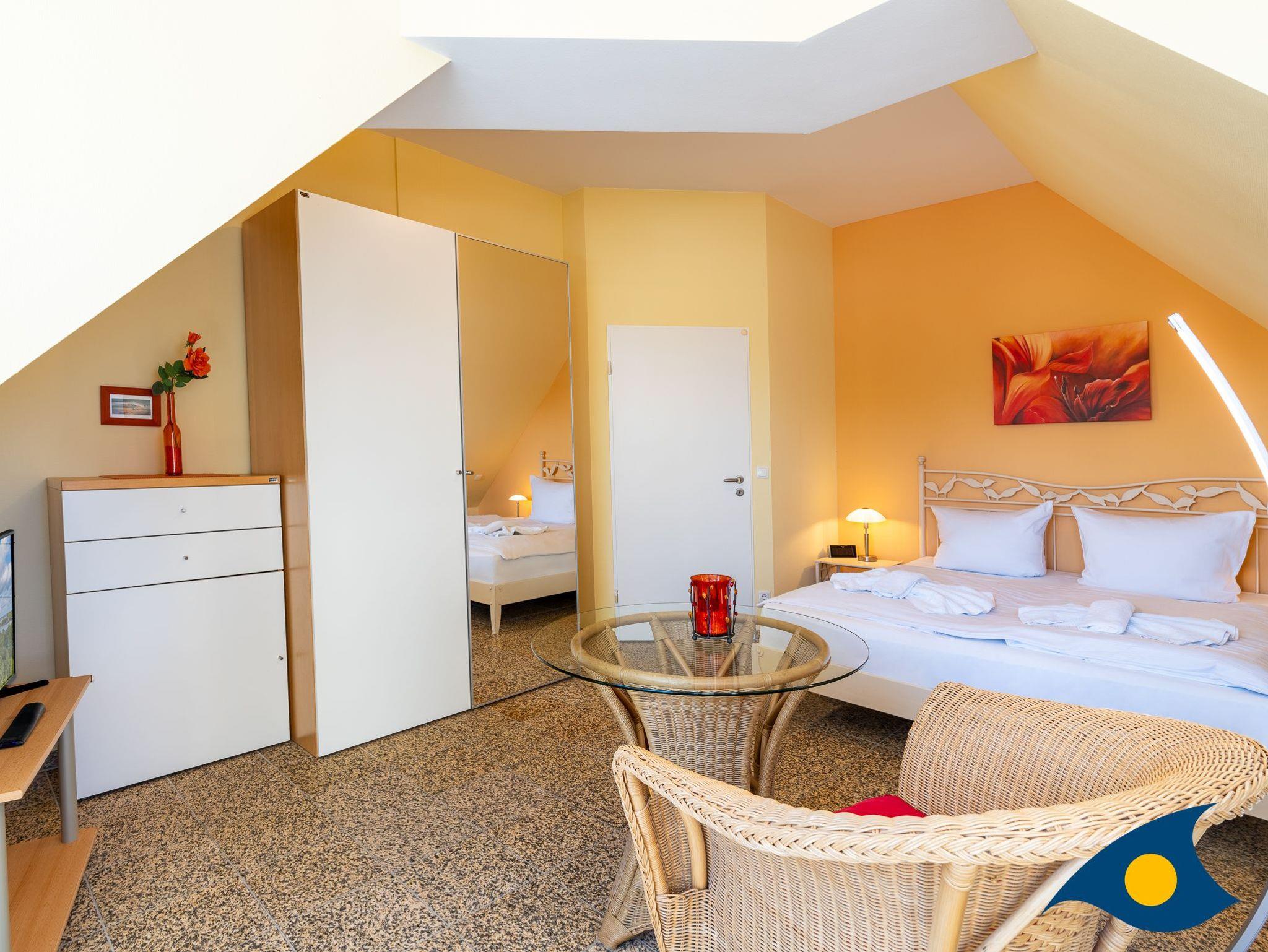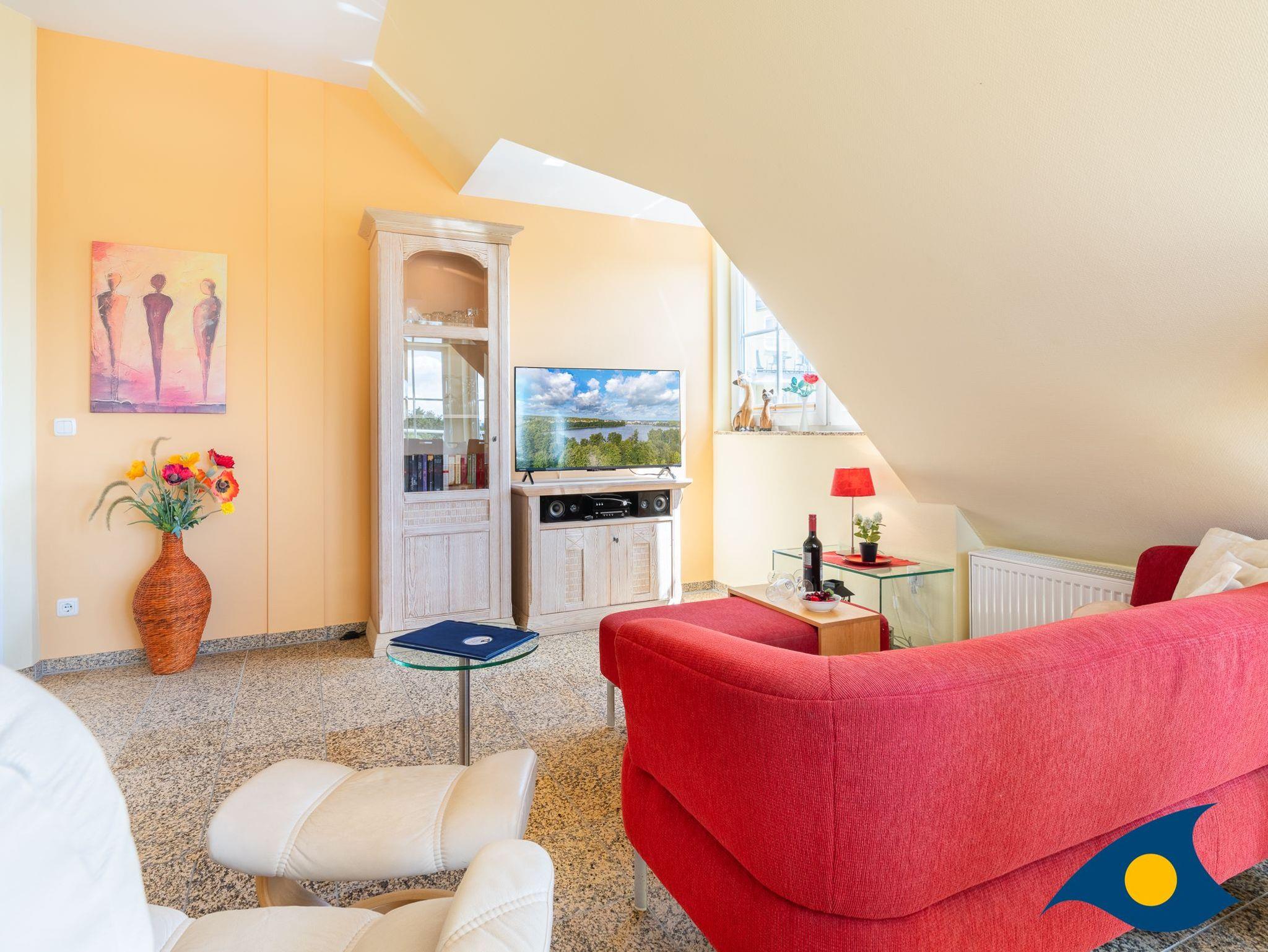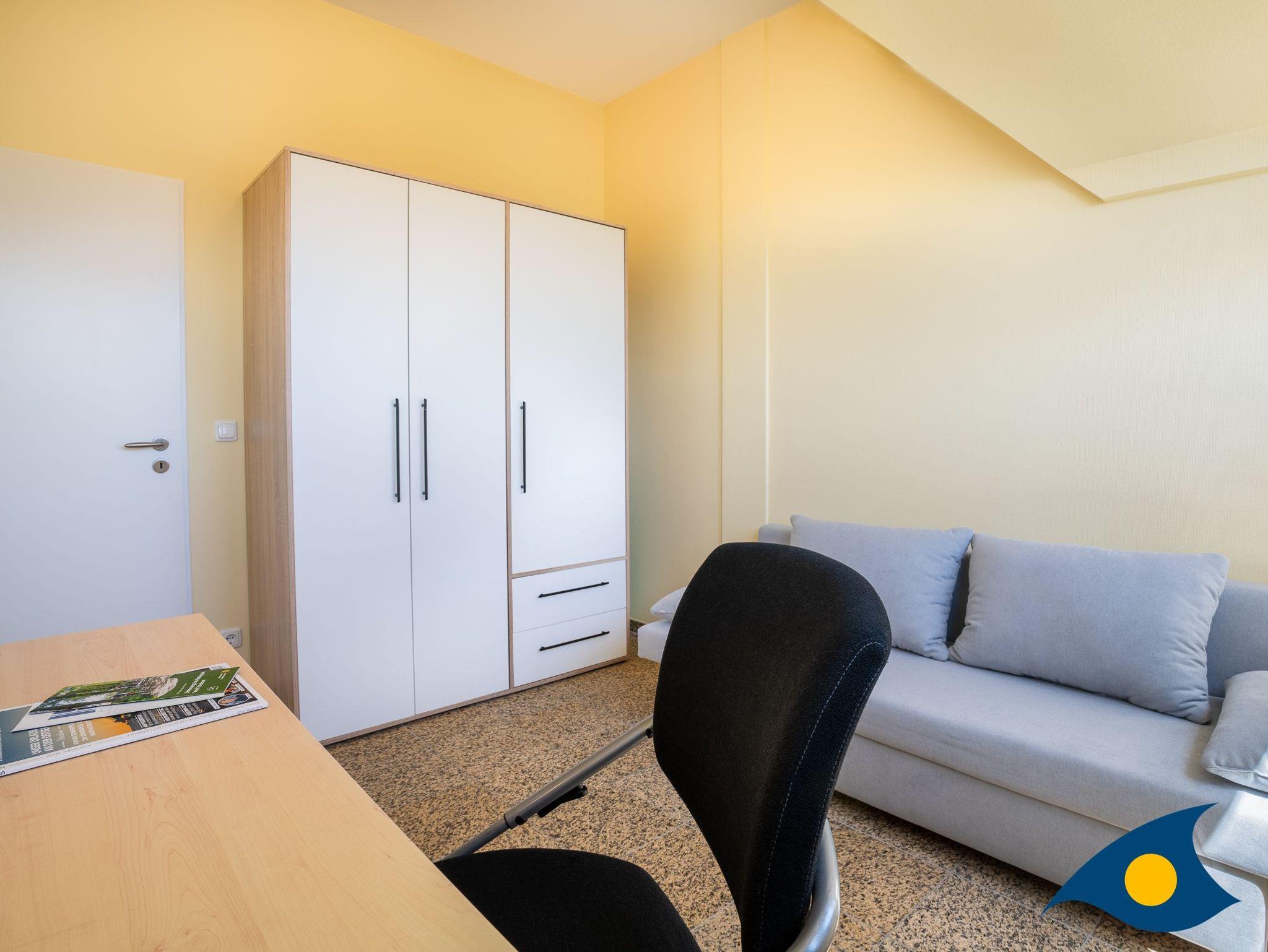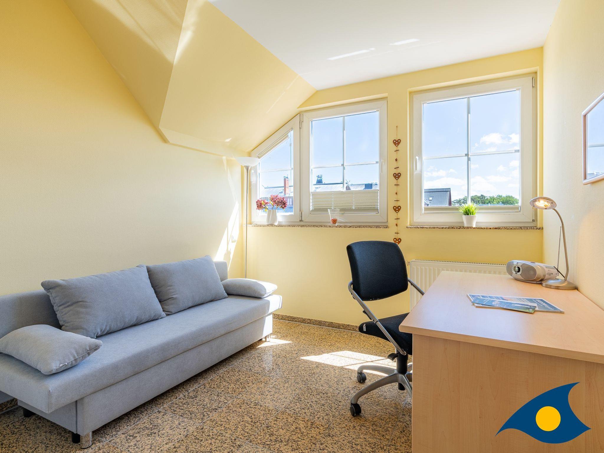 Im zweiten Erkertürmchen im großen Schlafzimmer steht außer einem gemütlichen Doppelbett ein bequemer Lese-Sessel sowie ein zweiter Fernseher. Aus dem Schlafzimmer gelangen Sie auf die zweite Terrasse mit Blick auf die Ostsee. Ein drittes, kleineres Zimmer mit einem Schreibtisch und einer Schlafcouch (1,80 X 1,40) bietet Platz für eine dritte Person.