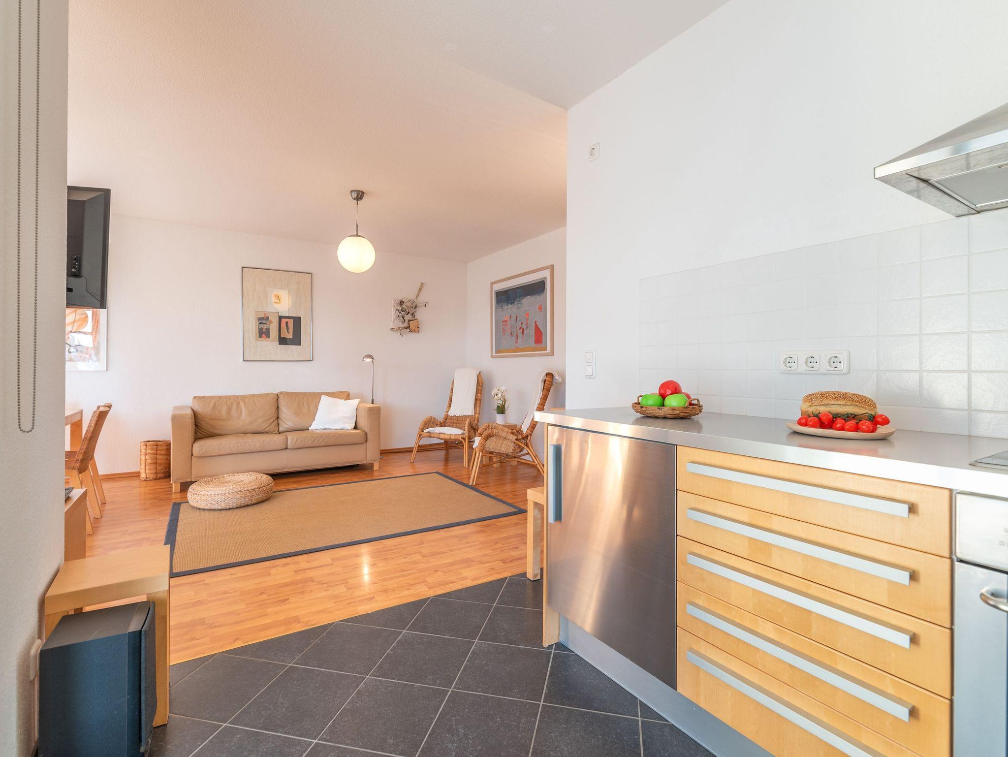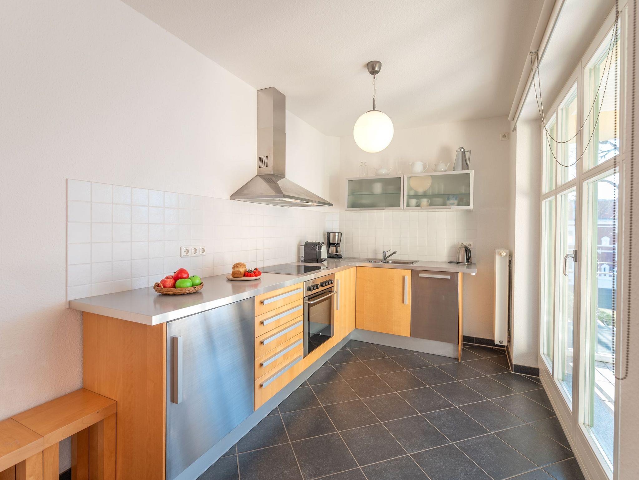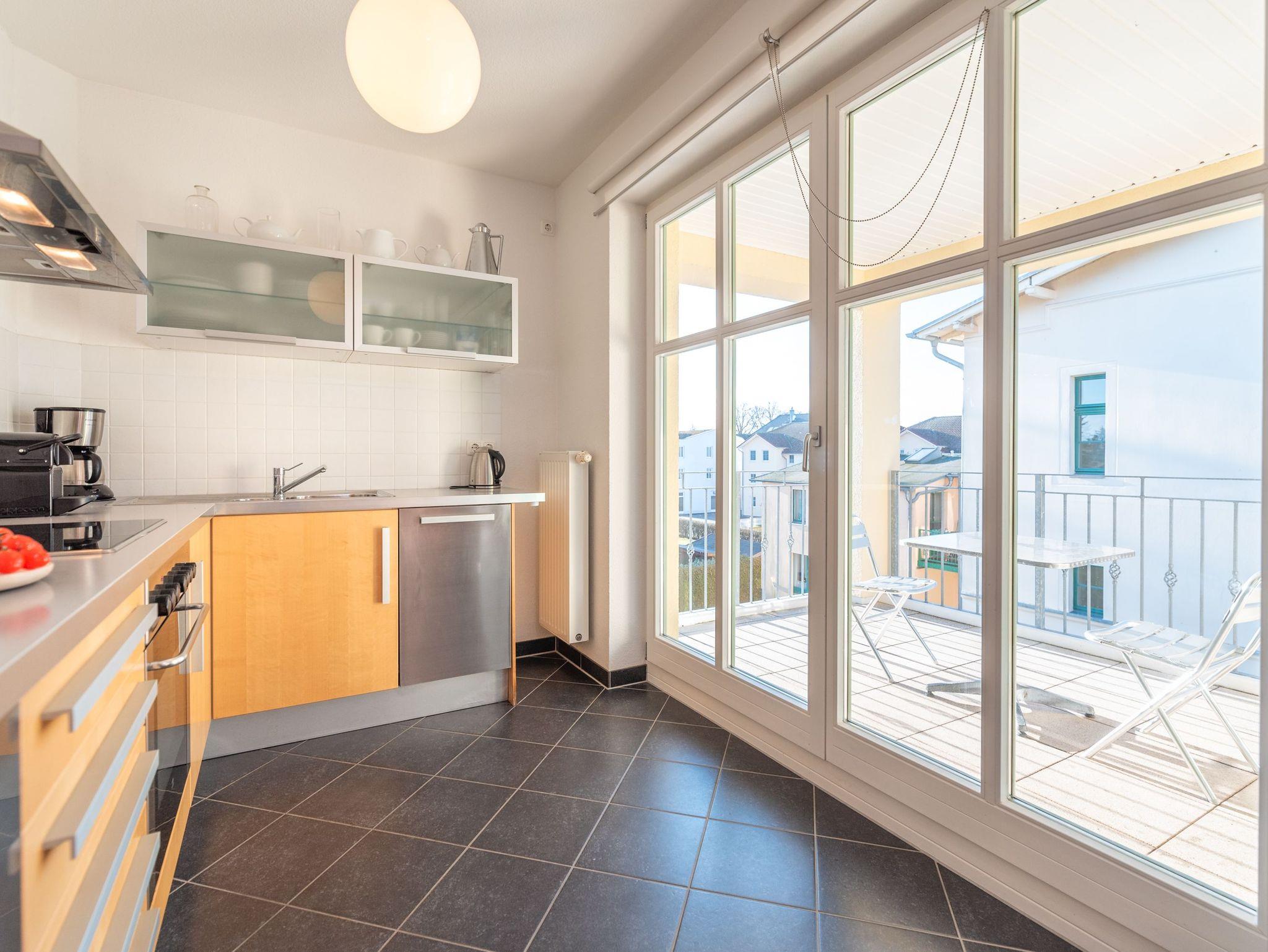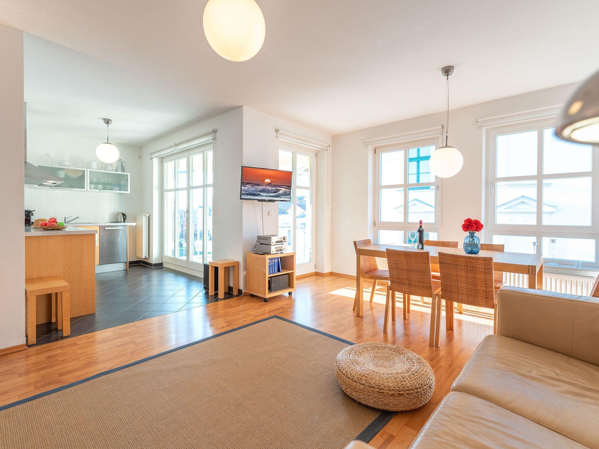 Der lichtdurchflutete Wohn- und Essbereich lädt mit einer gemütlichen Couch sowie einem Esstisch für sechs Personen zu entspannten Stunden ein. Für Unterhaltung sorgen ein TV und eine Musikanlage. Die moderne Küche ist voll ausgestattet mit Spülmaschine, Kaffeemaschine, Kühlschrank und einem Elektroherd ? perfekt für Selbstversorger.