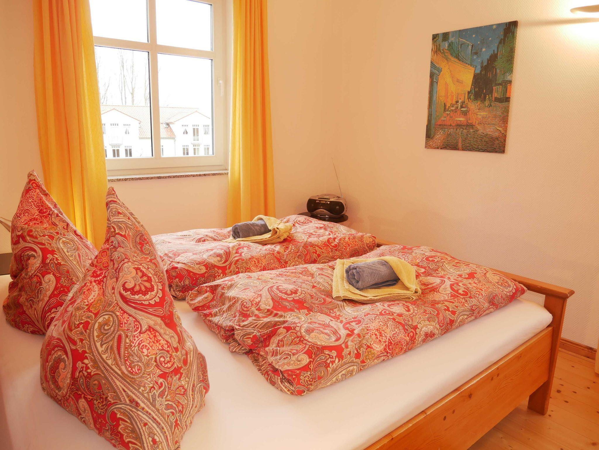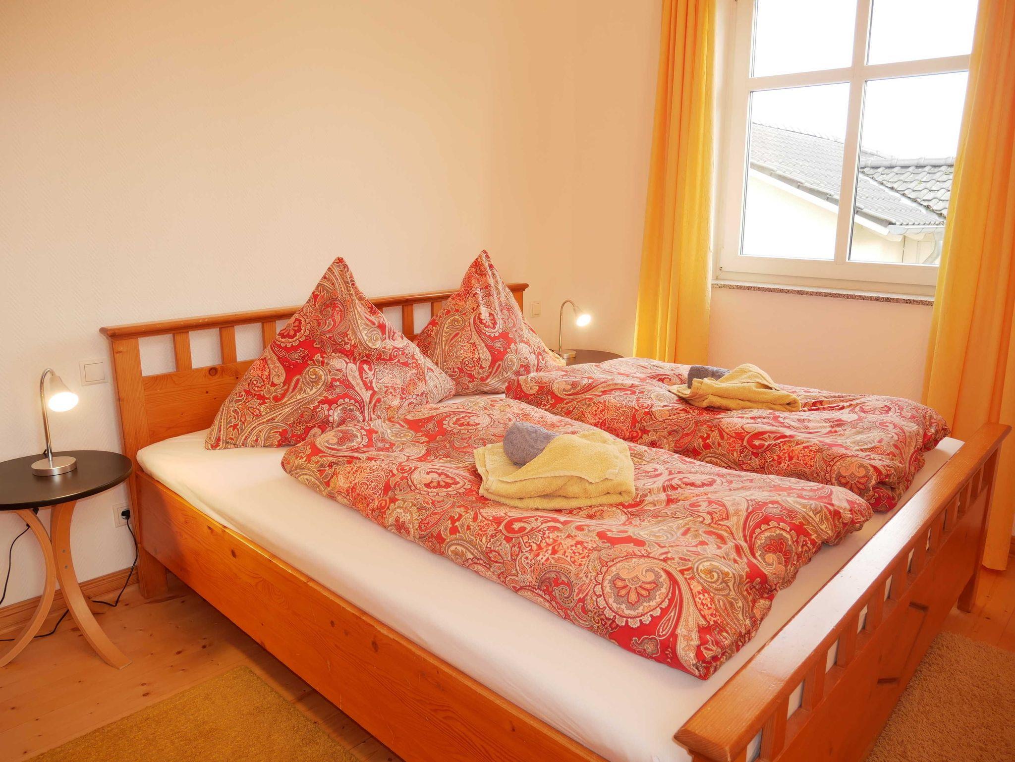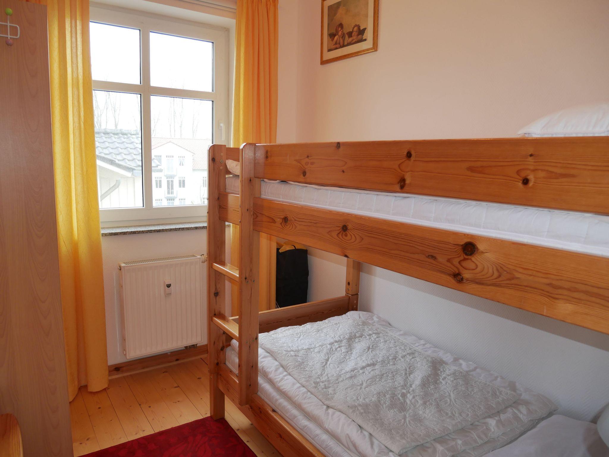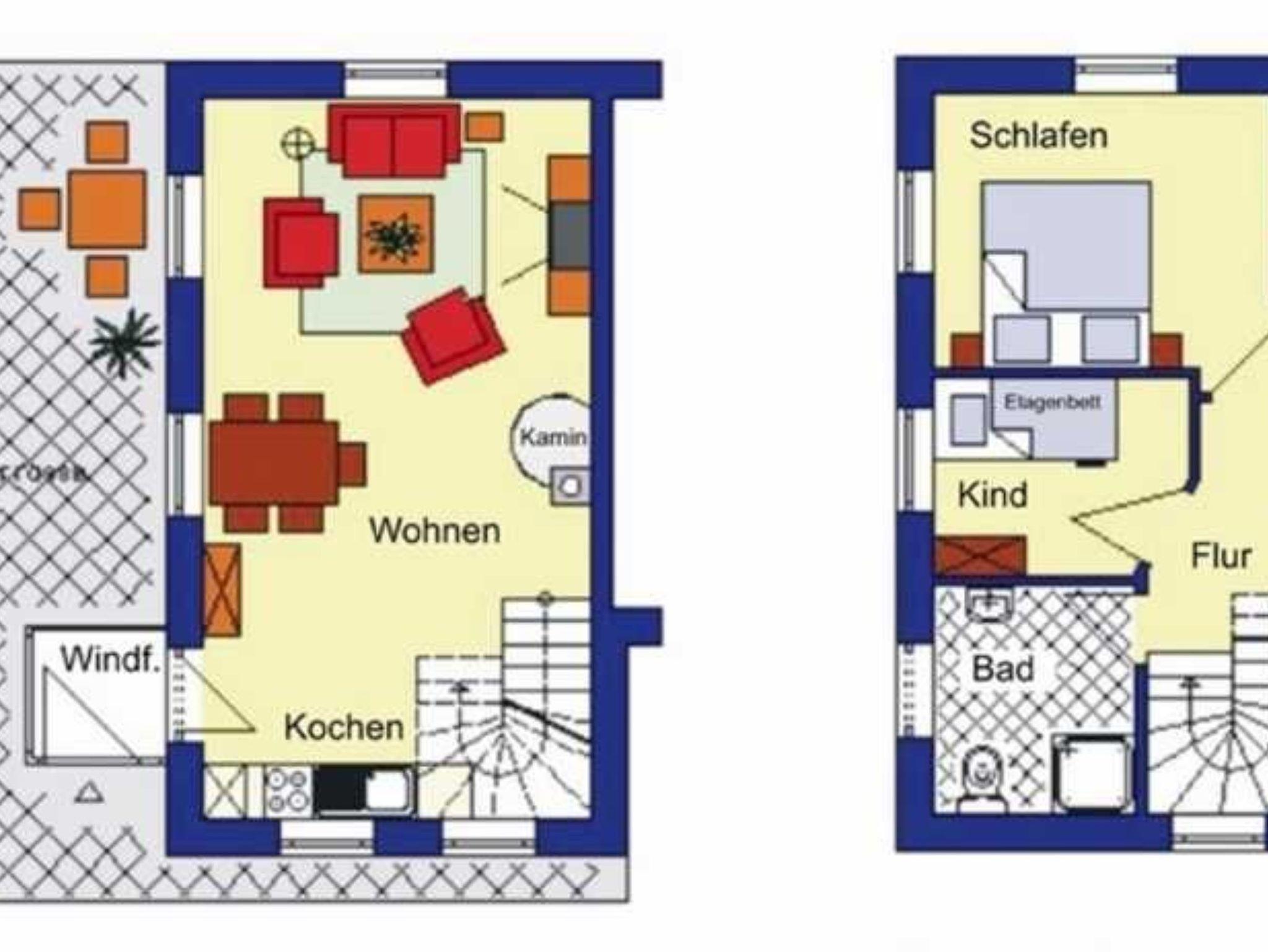 Zur Wohnung gehört eine überdachte Terrasse mit Sitzmöbeln und Blick in den Innenhof. Im 1. Obergeschoß befinden sich zwei Schlafräume mit 1 x Doppelbett, 1 x gr. Etagenbett (2 m lang x je 1 m breit) sowie ein Bad mit DU/WC. Die Erstausstattung Bettwäsche und Handtücher sind nicht im Gesamtpreis enthalten. Bei Bedarf können diese gegen Gebühr zugebucht werden.