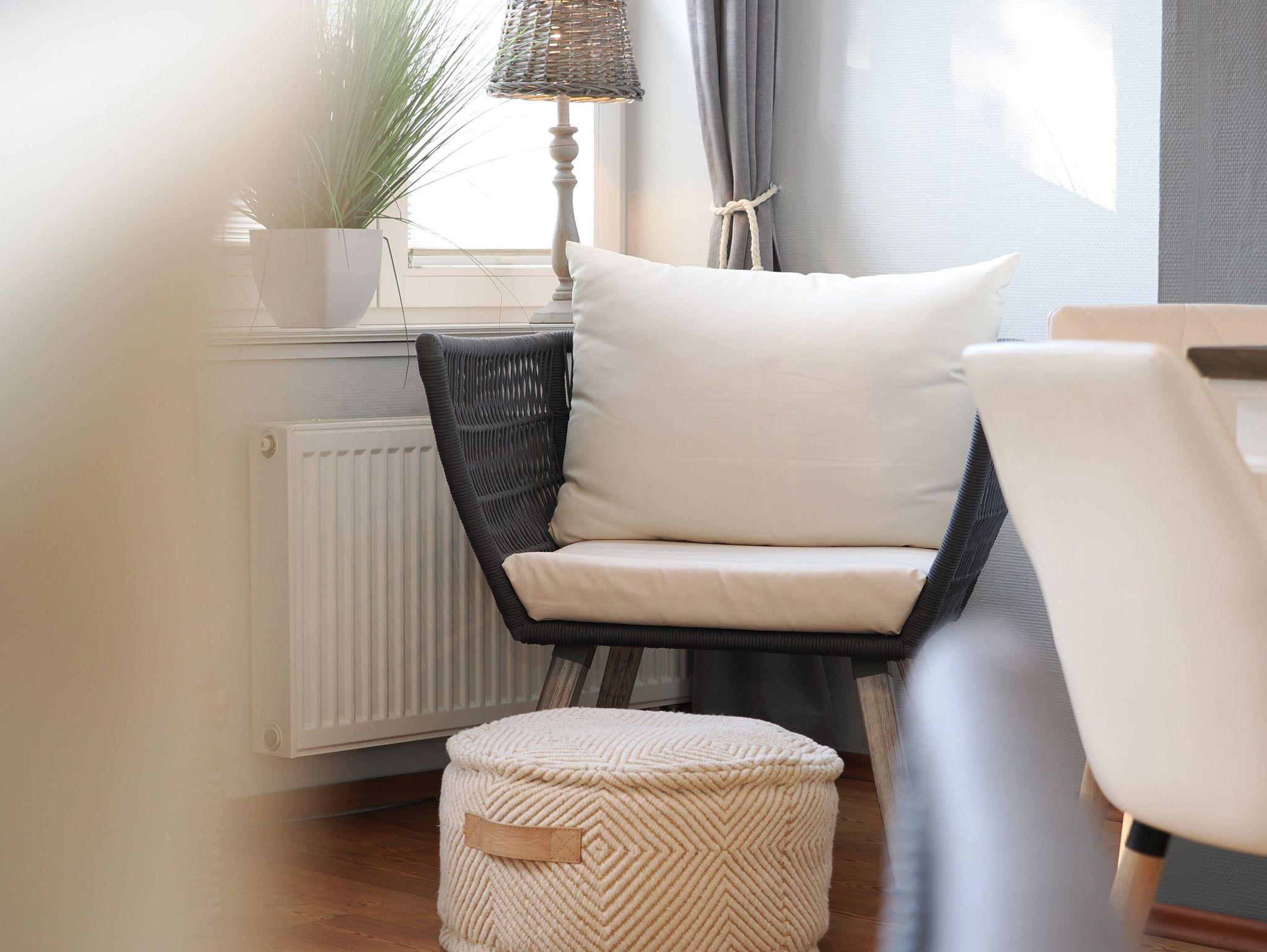 Die Terrassenwohnung überzeugt mit einem geräumigen Wohnzimmer, das mit einem bequemen Zweisitzer und zwei Sesseln ? einer davon mit Fußhocker ? zum Entspannen einlädt.