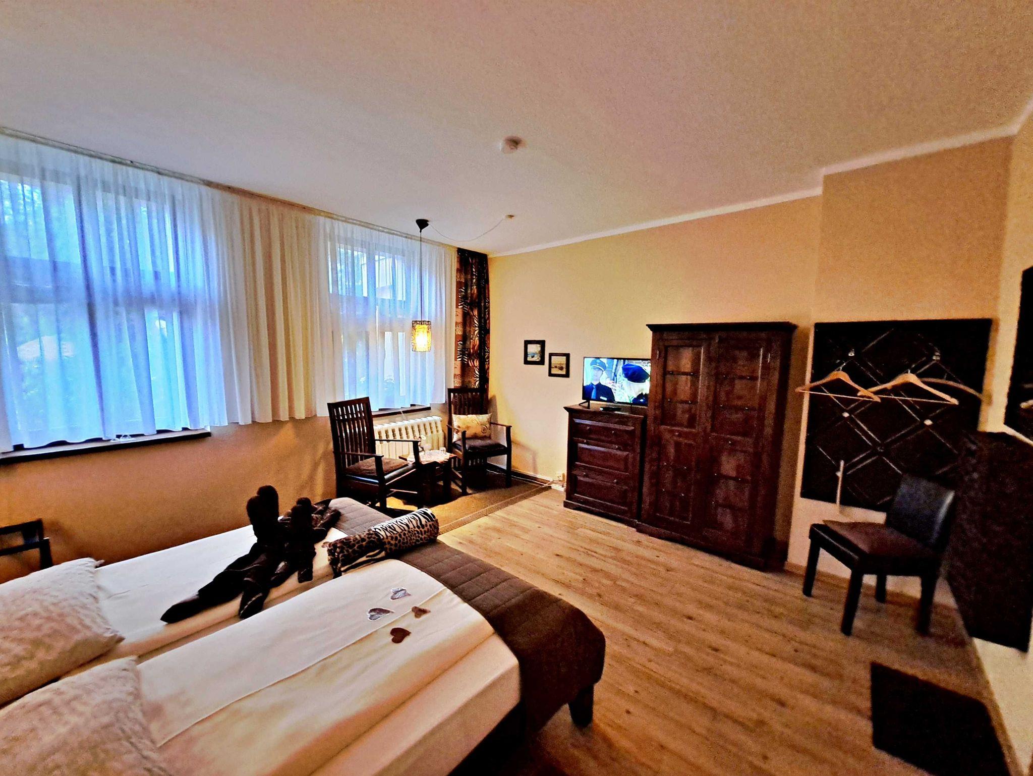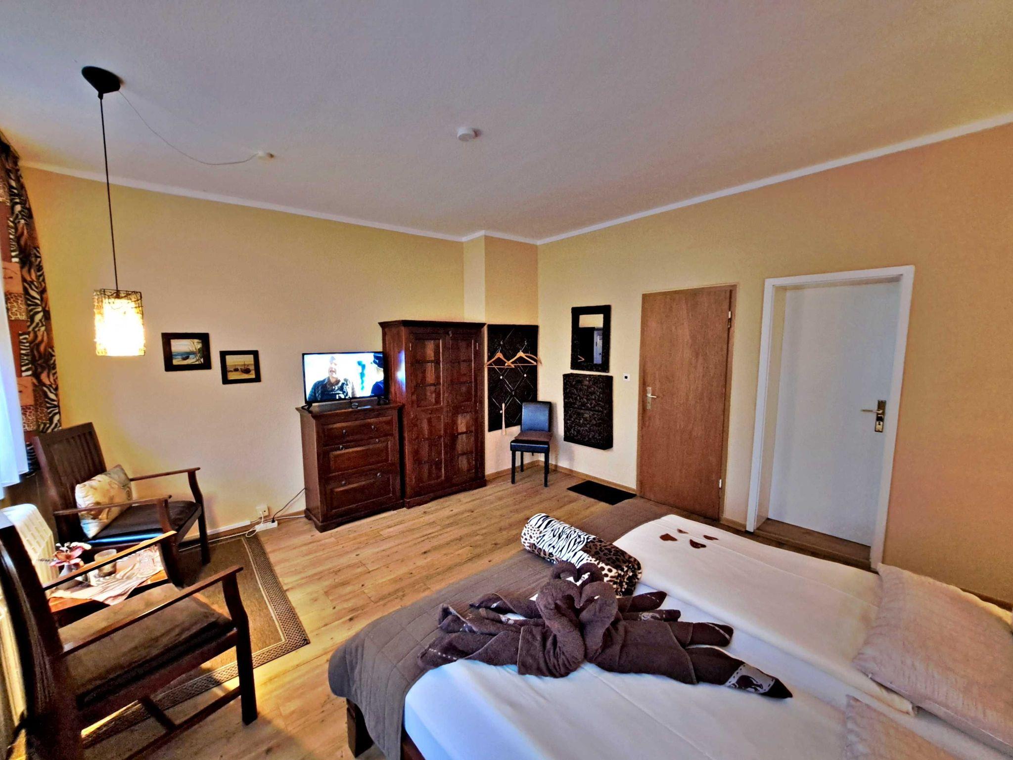 Herzlich willkommen in unserem geräumigen Doppelzimmer im Erdgeschoss der Pension! Hier erwartet Sie eine angenehme Atmosphäre, die durch die stilvollen Akazienholzmöbel ein leicht afrikanisches Urlaubsgefühl vermittelt. Das Zimmer ist komfortabel ausgestattet mit einem gemütlichen Doppelbett, einladenden Sitzgelegenheiten und einem Flachbild-TV, damit Sie sich rundum wohlfühlen können. Das angrenzende Tageslicht-Bad bietet Ihnen eine erfrischende Dusche, WC und einen Fön für Ihre Komfort. Für Ihren Aufenthalt steht Ihnen unser kostenloses W-LAN zur Verfügung, sodass Sie jederzeit online sein können. Zudem ist ein kostenfreier Pkw-Stellplatz für Sie inklusive.