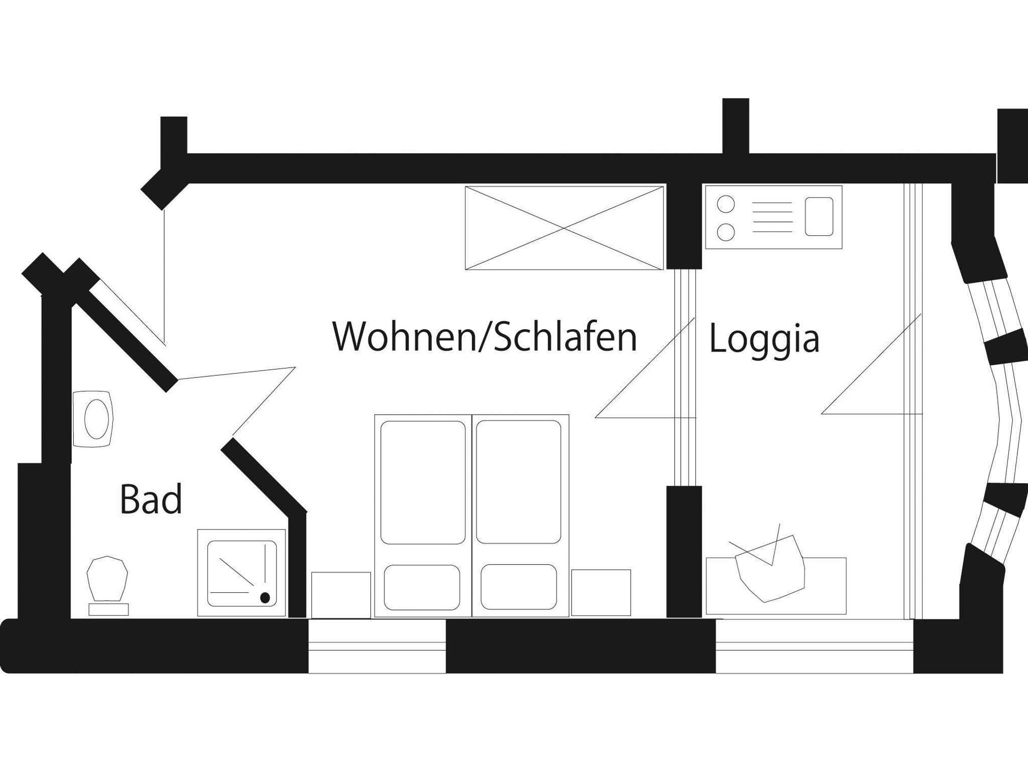 Für 1-2 Personen, 26 qm, Mini-Küche, DU/WC, 1./2. OG mit Meerblick und Loggia, teilweise Balkon.