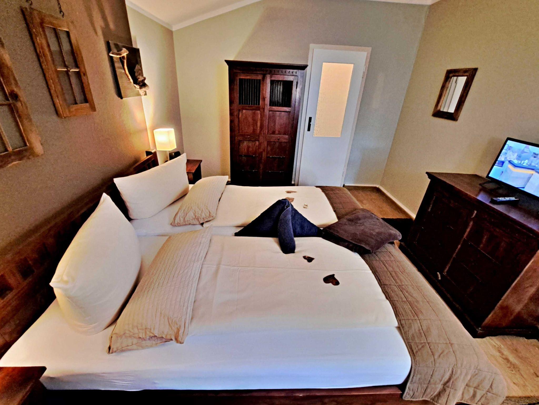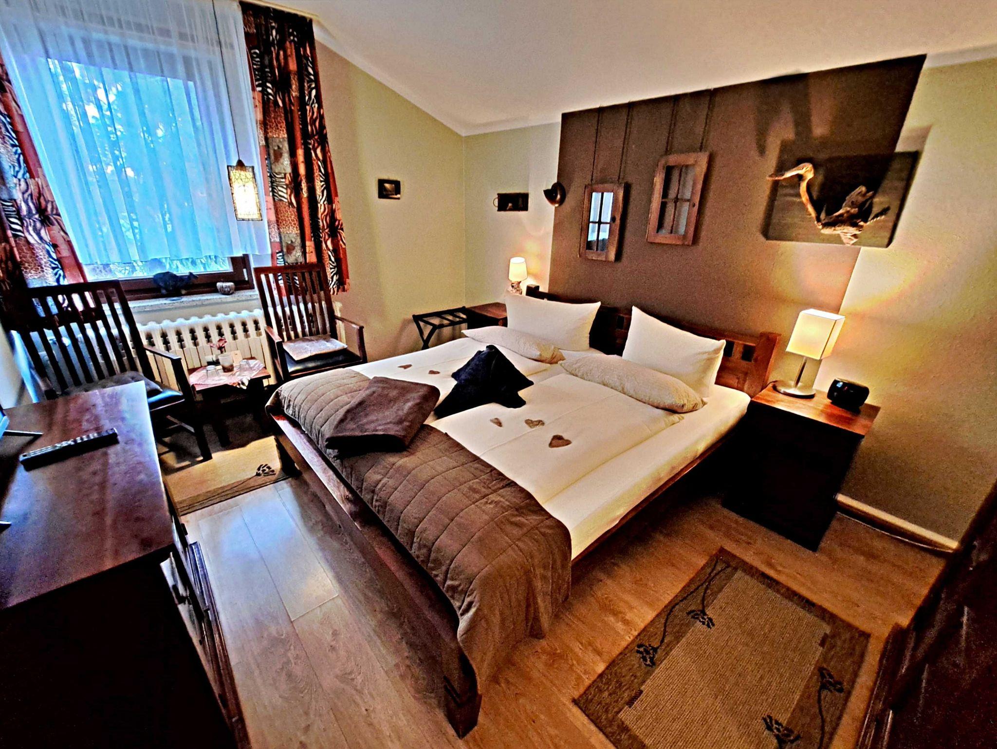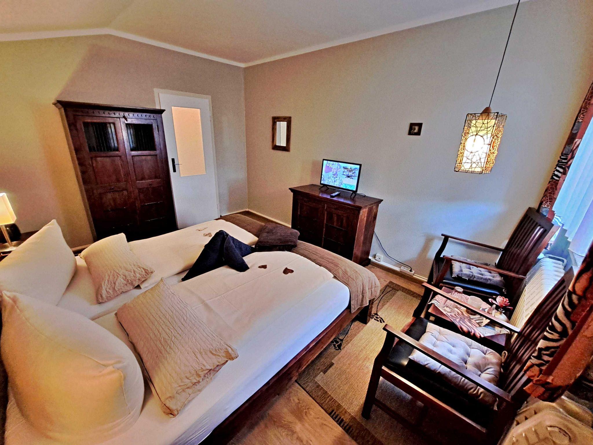 Herzlich willkommen in unserem liebevoll eingerichteten Doppelzimmer im ersten Obergeschoss der Pension! Hier erwartet Sie eine gemütliche Atmosphäre, die durch die warmen Akazienholzmöbel ein leicht afrikanisches Urlaubsgefühl vermittelt. Das Zimmer ist mit einem komfortablen Doppelbett, einladenden Sitzgelegenheiten, einem TV sowie einem modernen Bad mit Dusche/WC und Fön ausgestattet. Für Ihren Aufenthalt steht Ihnen unser kostenloses W-LAN zur Verfügung, sodass Sie jederzeit online sein können. Zudem ist ein kostenfreier Pkw-Stellplatz für Sie inklusive.