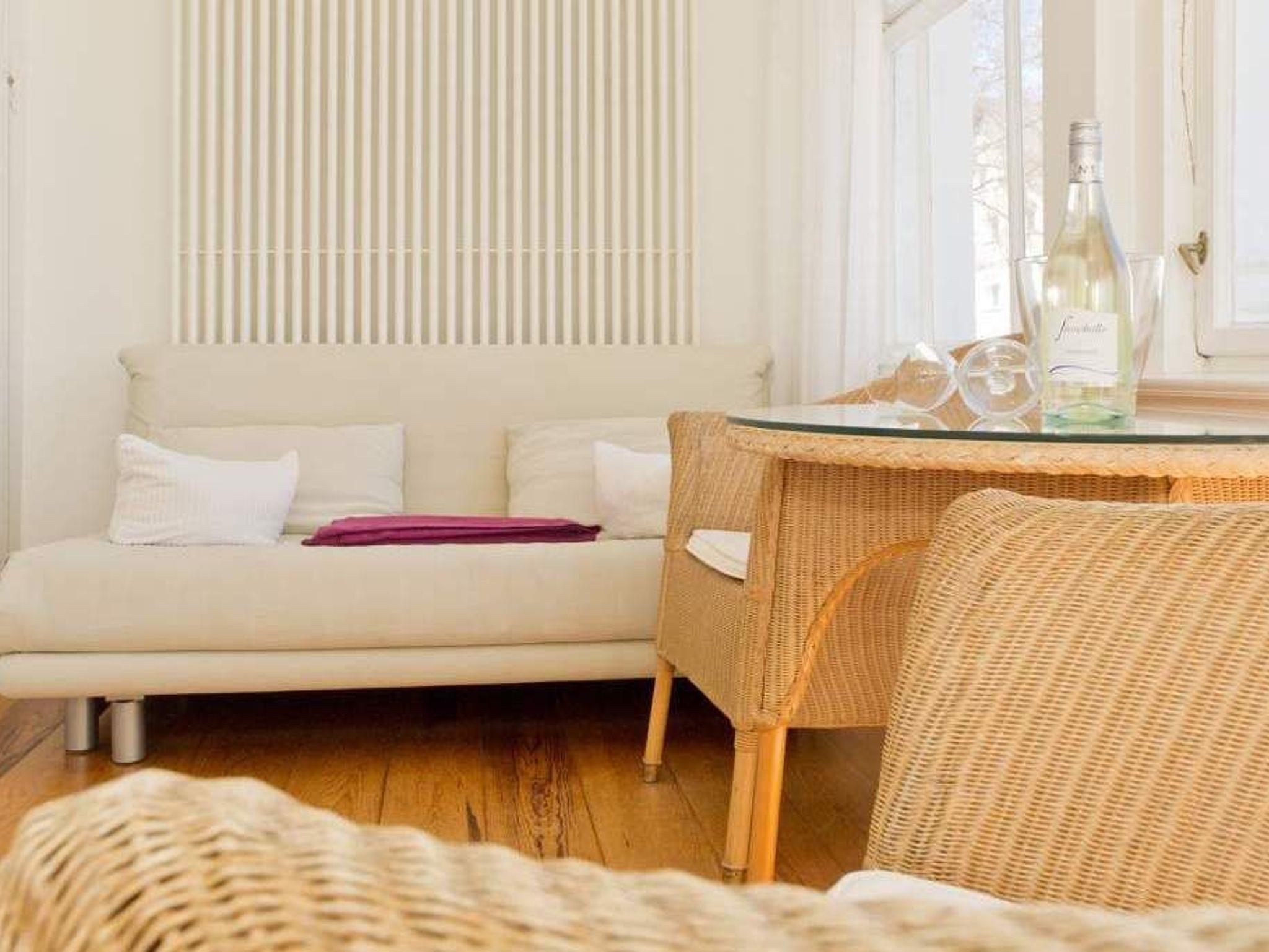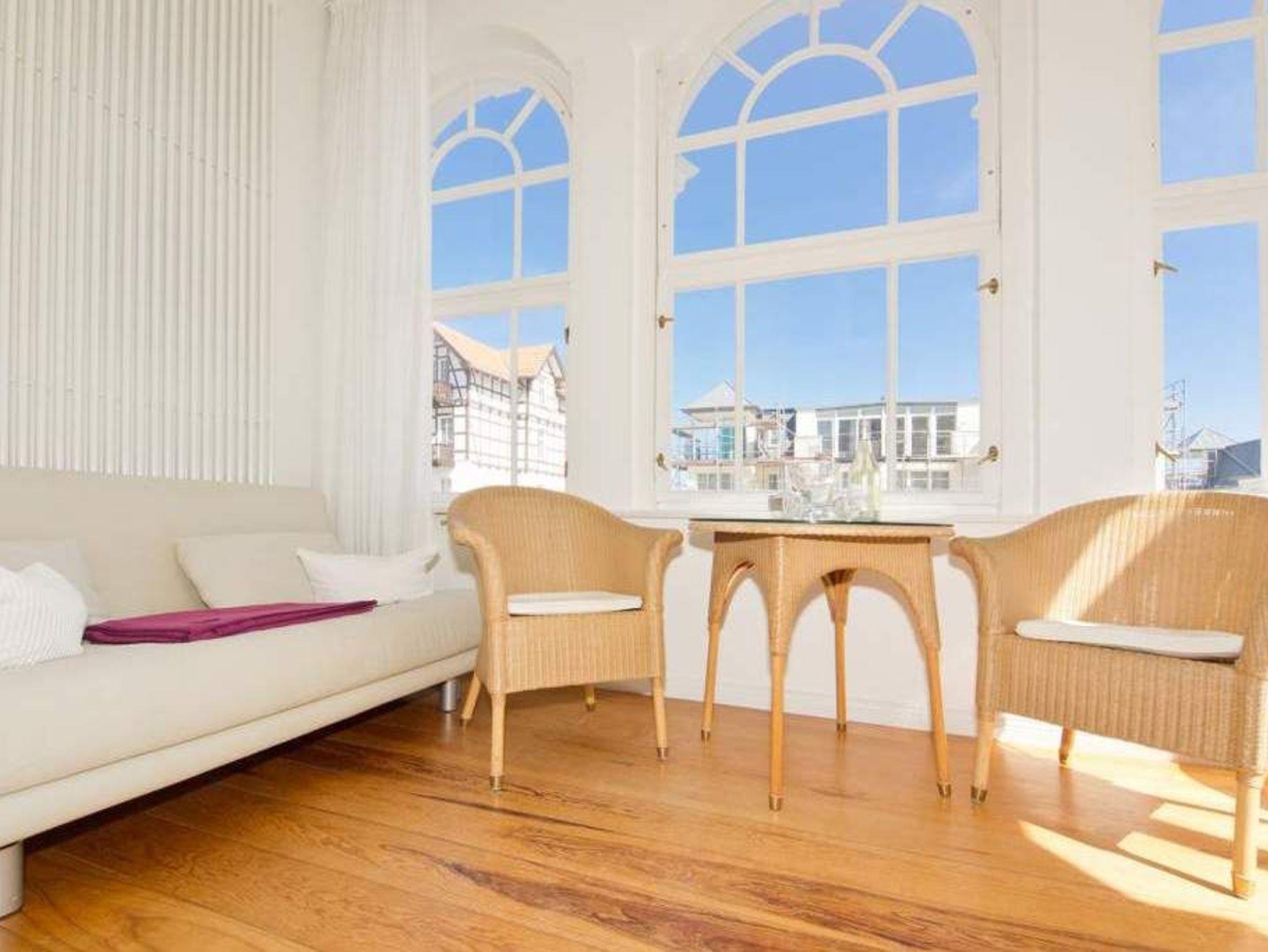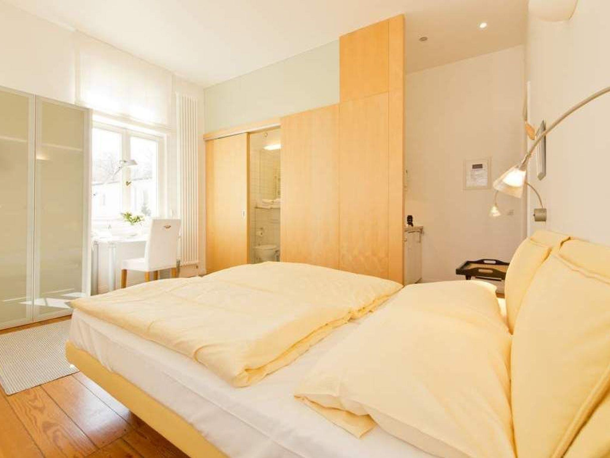 Durch fünf Fenster erhellt das klare Licht des Nordens diese Räume. Die Ostsee ist von fast jedem Platz in der Wohnung zu sehen, am schönsten jedoch ohne Frage von der Veranda aus, denn hier kann man es sich so richtig gemütlich machen. Vom Teetisch oder auch vom Sofa lässt es sich hier herrlich versonnen auf das Meer blicken. Im Schlaf- und Wohnzimmer gibt es einen Schreibtisch mit Arbeitslampe und ein geräumiges Doppelbett. Die kleine Küchenzeile komplettiert das Appartement. Die Wohnungen Köln, Düsseldorf [&] Lüneburg verfügen zusätzlich über einen Safe. Ein DVD-Player kann Ihnen auf Anfrage zur Verfügung gestellt werden.