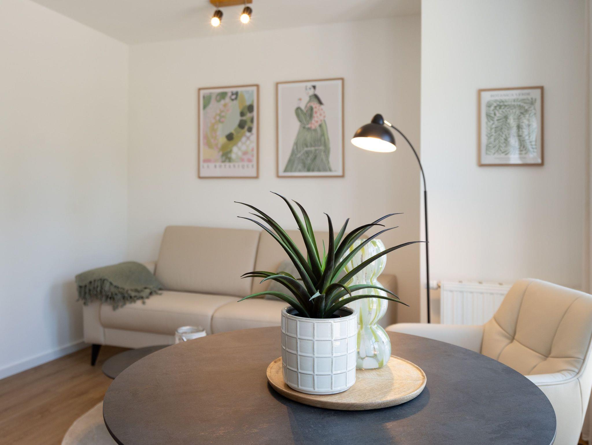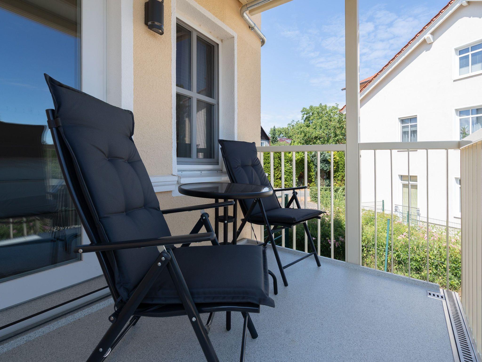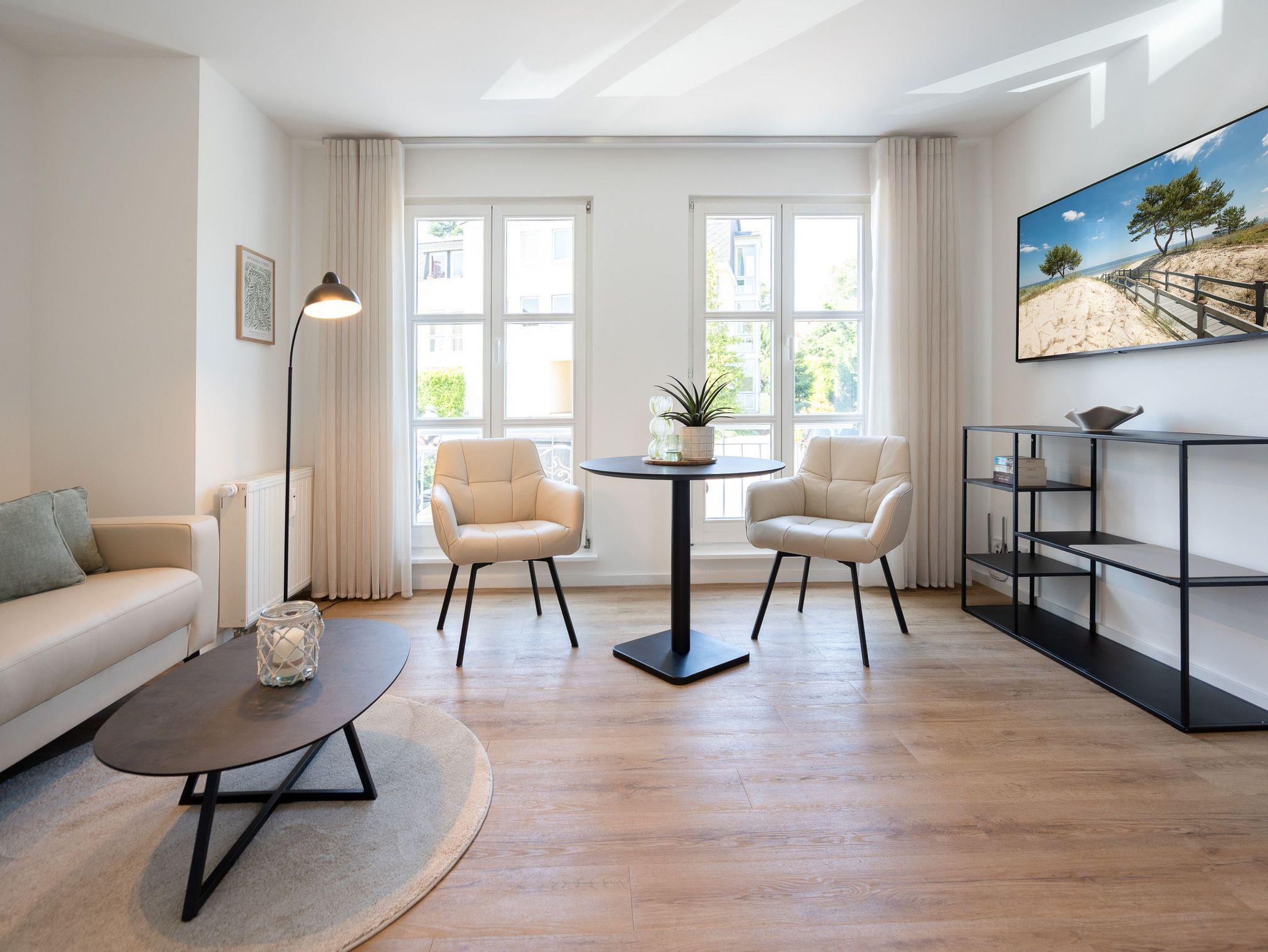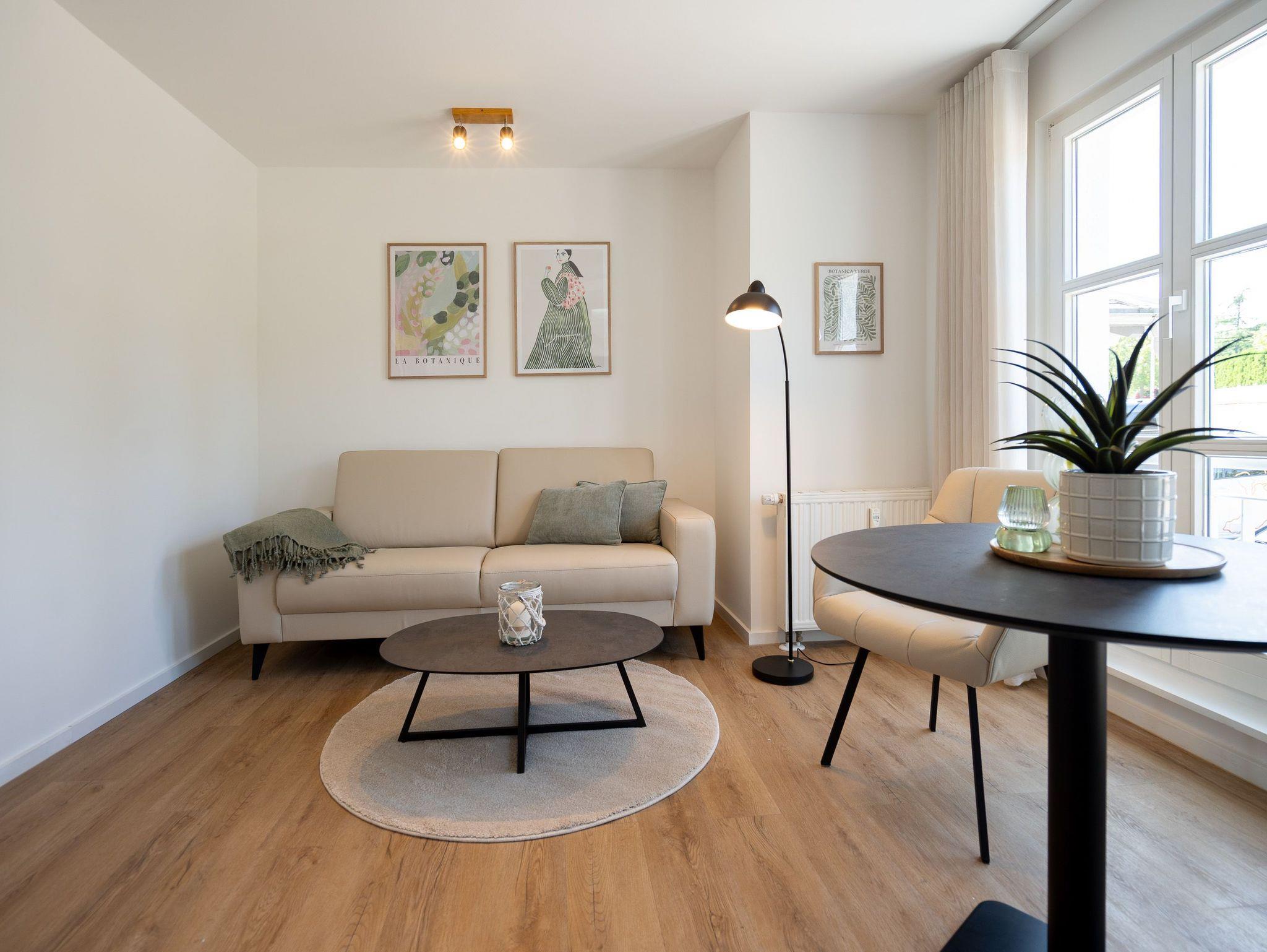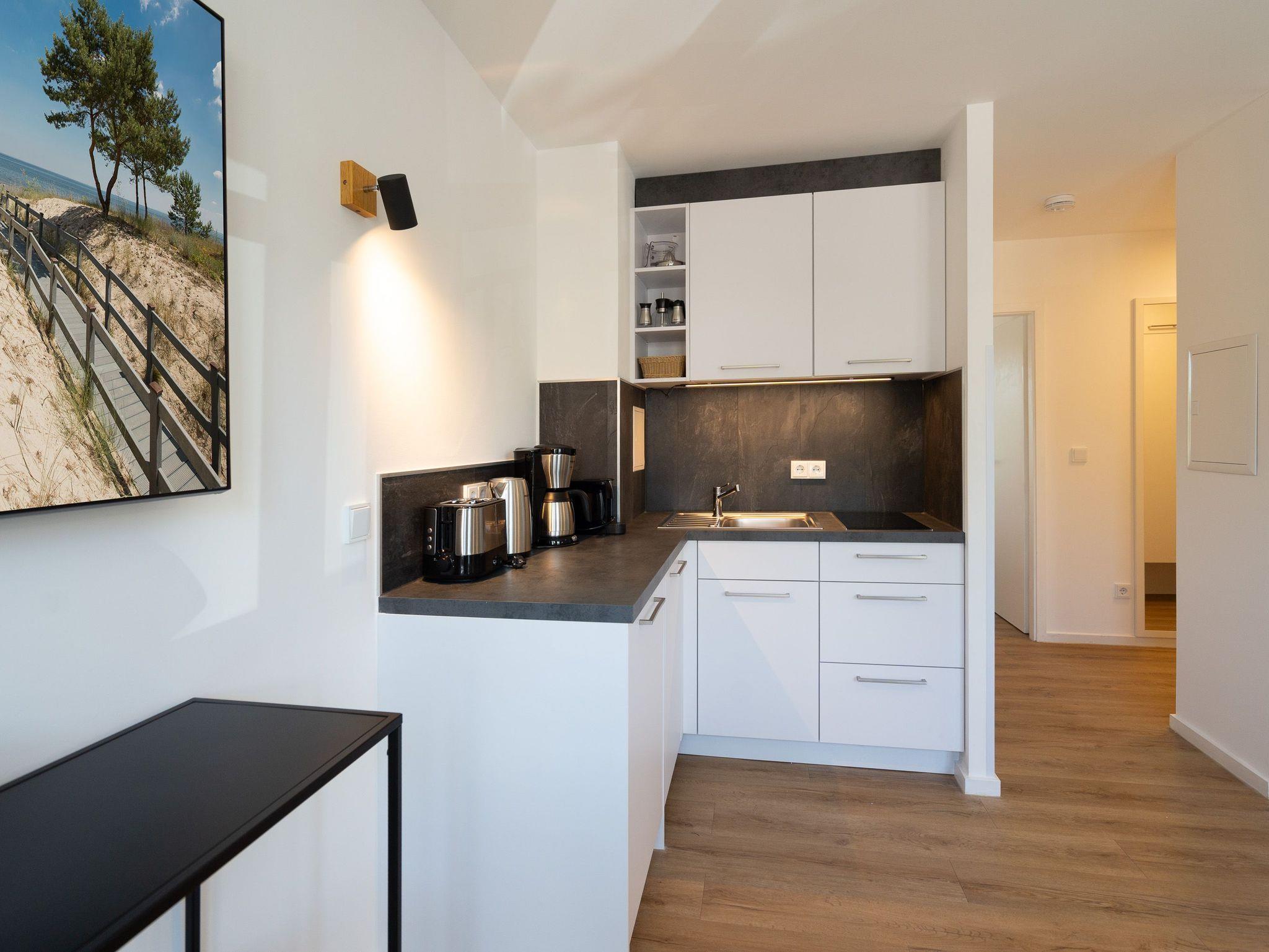 Helles 2-Raum-Appartement mit Balkon ? entspannt wohnen im Hochparterre. Das 2-Raum-Appartement Nr.?1 im Hochparterre der Villa Elisabeth bietet auf 33?m² alles, was Sie für einen erholsamen Aufenthalt zu zweit brauchen ? durchdacht eingerichtet, freundlich und komfortabel. Der offene Wohnbereich überzeugt mit einer modernen Küchenzeile inklusive 2-Platten-Cerankochfeld, Spülmaschine, Kühlschrank mit Gefrierfach und Nespresso-Kapselmaschine. Am Esstisch für zwei genießen Sie Ihre Mahlzeiten in angenehmer Atmosphäre. Nach einem Tag am Strand lädt das bequeme Sofa zum Ausruhen ein ? für Unterhaltung sorgt ein 55-Zoll-Flat-TV. Im separaten Schlafzimmer erwartet Sie ein komfortables Boxspringbett (1,80?m x 1,95?m). Von hier aus haben Sie direkten Zugang zum sonnigen Süd-Ost-Balkon (ca. 5?m²) ? ideal für ein Frühstück im Freien oder eine entspannte Auszeit an der frischen Luft. Ein geräumiger Kleiderschrank steht Ihnen im Flur zur Verfügung. Das moderne Tageslichtbad ist ausgestattet mit Dusche (85?cm x 70?cm), Waschtisch und WC ? kompakt, gepflegt, funktional. Ein eigener PKW-Stellplatz (Nr.?1) befindet sich direkt vor dem Haus. WLAN steht selbstverständlich kostenfrei zur Verfügung.