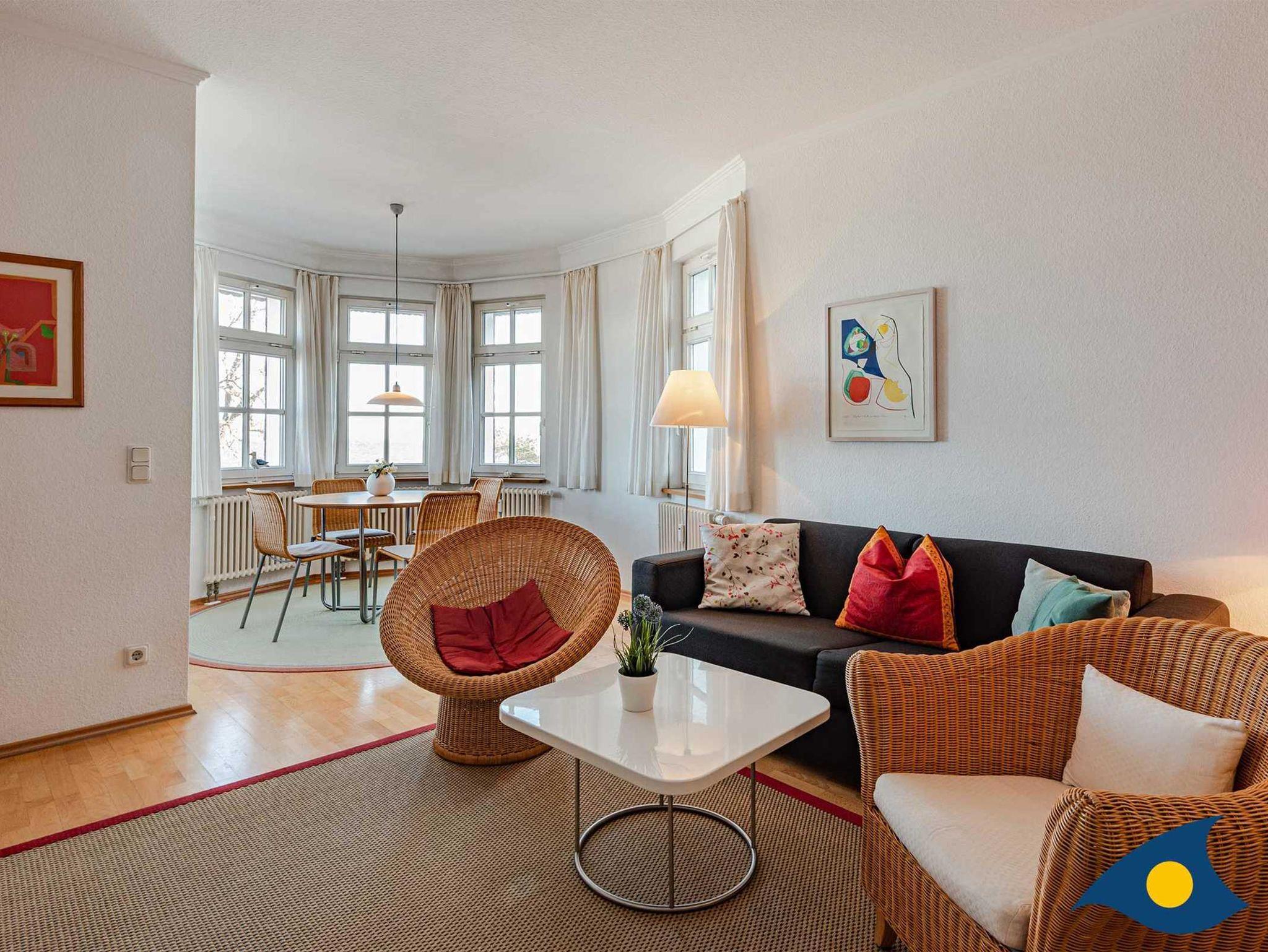 Die Wohnung 14 im 1. OG ist hochwertig und individuell eingerichtet. Vom romantischen Erker bietet sich ein traumhafter Blick über den Strand und die Ostsee. Die Wohnung besteht aus einem großen Wohnraum mit freiem Blick auf das Meer sowie einer offenen Küche mit Theke. Das Schlafzimmer ist hell und freundlich eingerichtet. Im Bad (mit Tageslicht) steht eine ebenfalls hochwertige Ausstattung inklusive einer Runddusche zur Verfügung.
