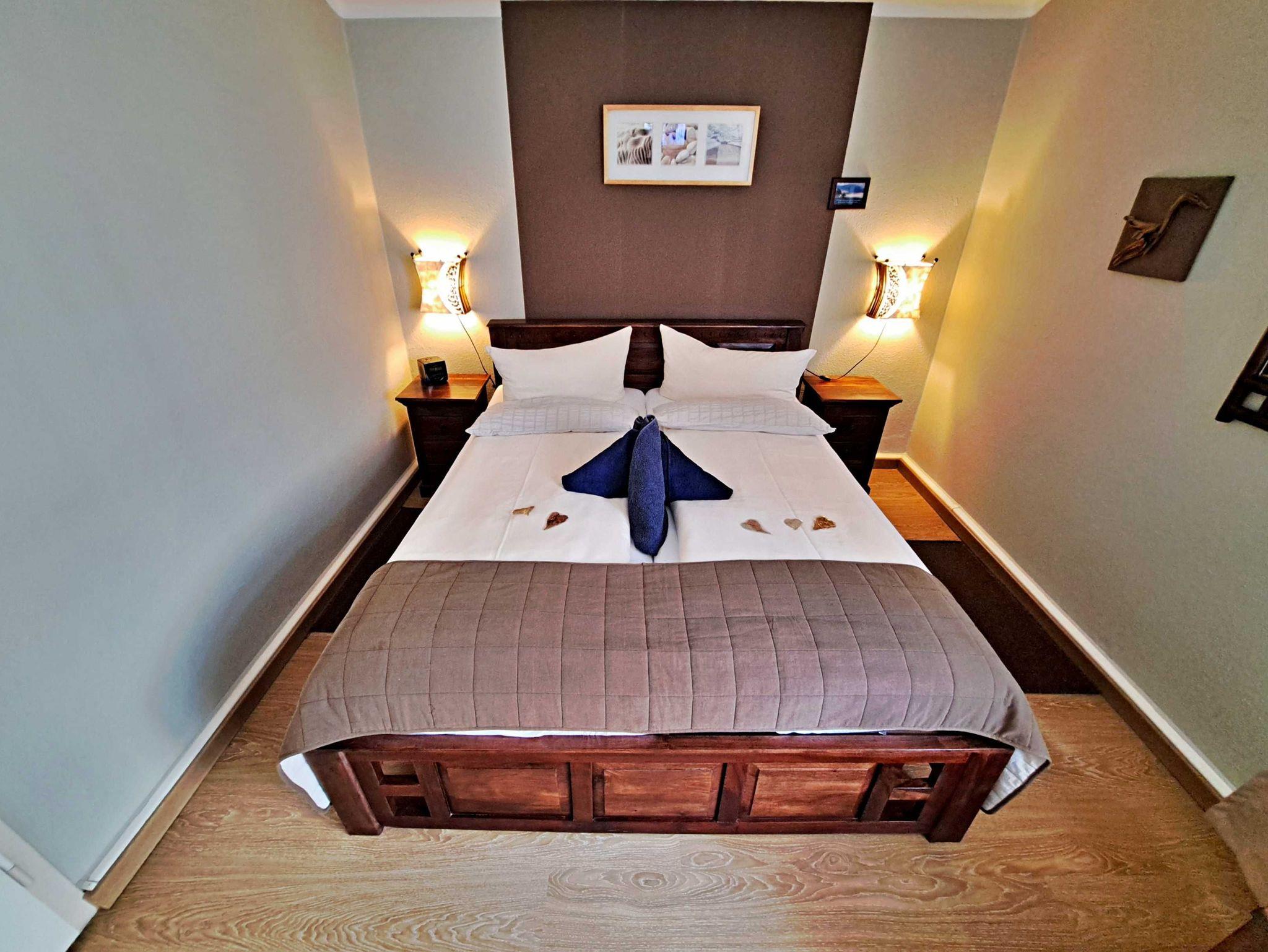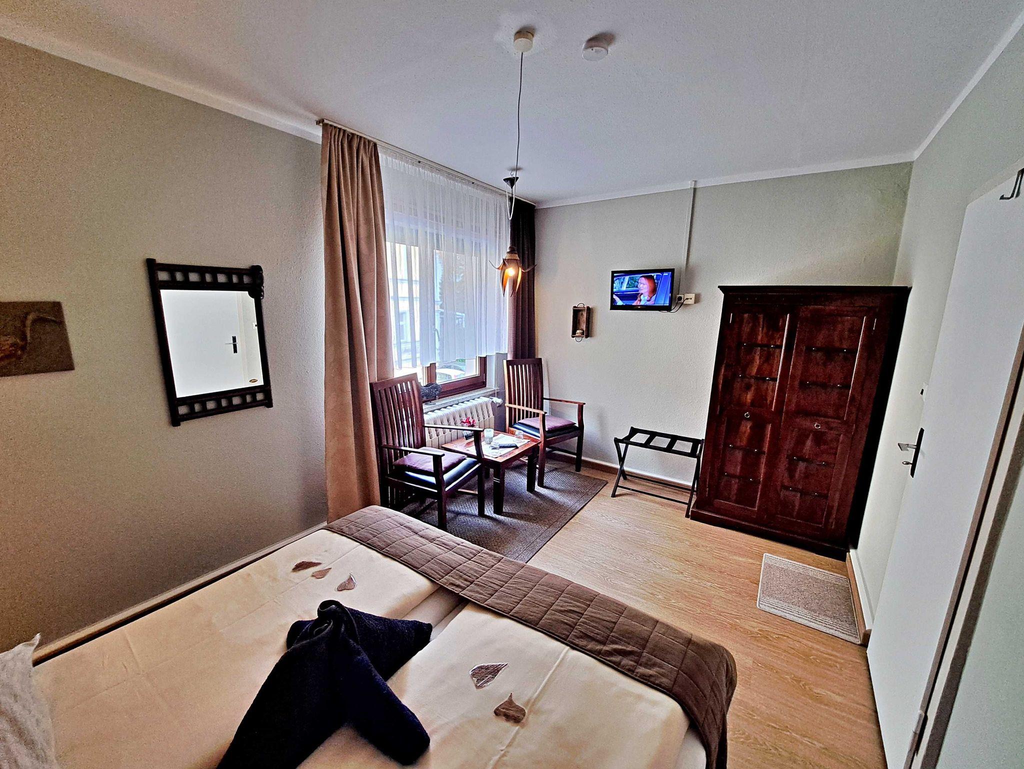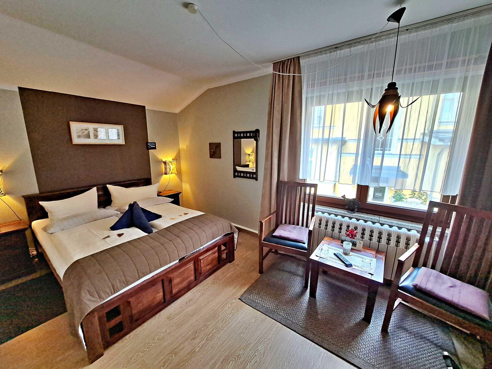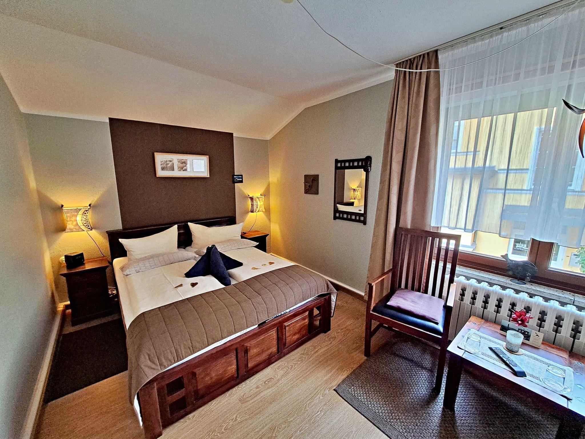 Herzlich willkommen in unserem liebevoll eingerichteten Doppelzimmer im ersten Obergeschoss der Pension. Hier erwartet Sie eine gemütliche Atmosphäre, die durch die warmen Akazienholzmöbel ein leicht afrikanisches Urlaubsgefühl vermittelt. Das Zimmer ist mit einem komfortablen Doppelbett, einladenden Sitzgelegenheiten, einem TV sowie einem modernen Bad mit Dusche/WC und Fön ausgestattet. Für Ihren Aufenthalt steht Ihnen unser kostenloses W-LAN zur Verfügung, damit Sie jederzeit online bleiben können. Ihr Auto findet direkt am Haus einen sicheren Parkplatz.