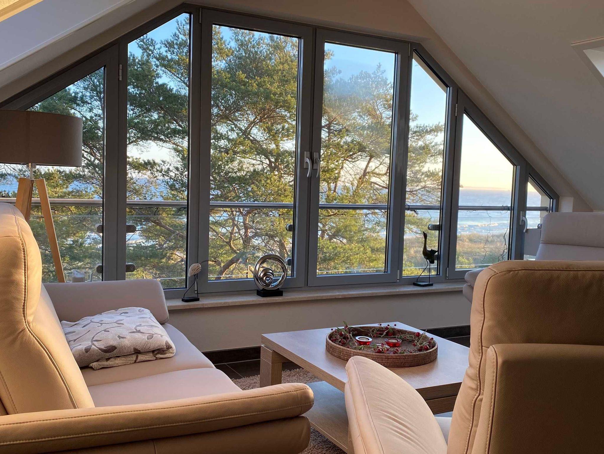 Moderne stilvolle 3 Zimmerferienwohnung für 2 - 4 Personen maximal. Wohnzimmer mit TV, CD, Eßplatz und integrierter Vollküche mit Geschirrspüler. Wohnung mit Duschbad Die Wohnung besitzt ein Balkon und großes Panoramafenster mit Blick zum Meer.