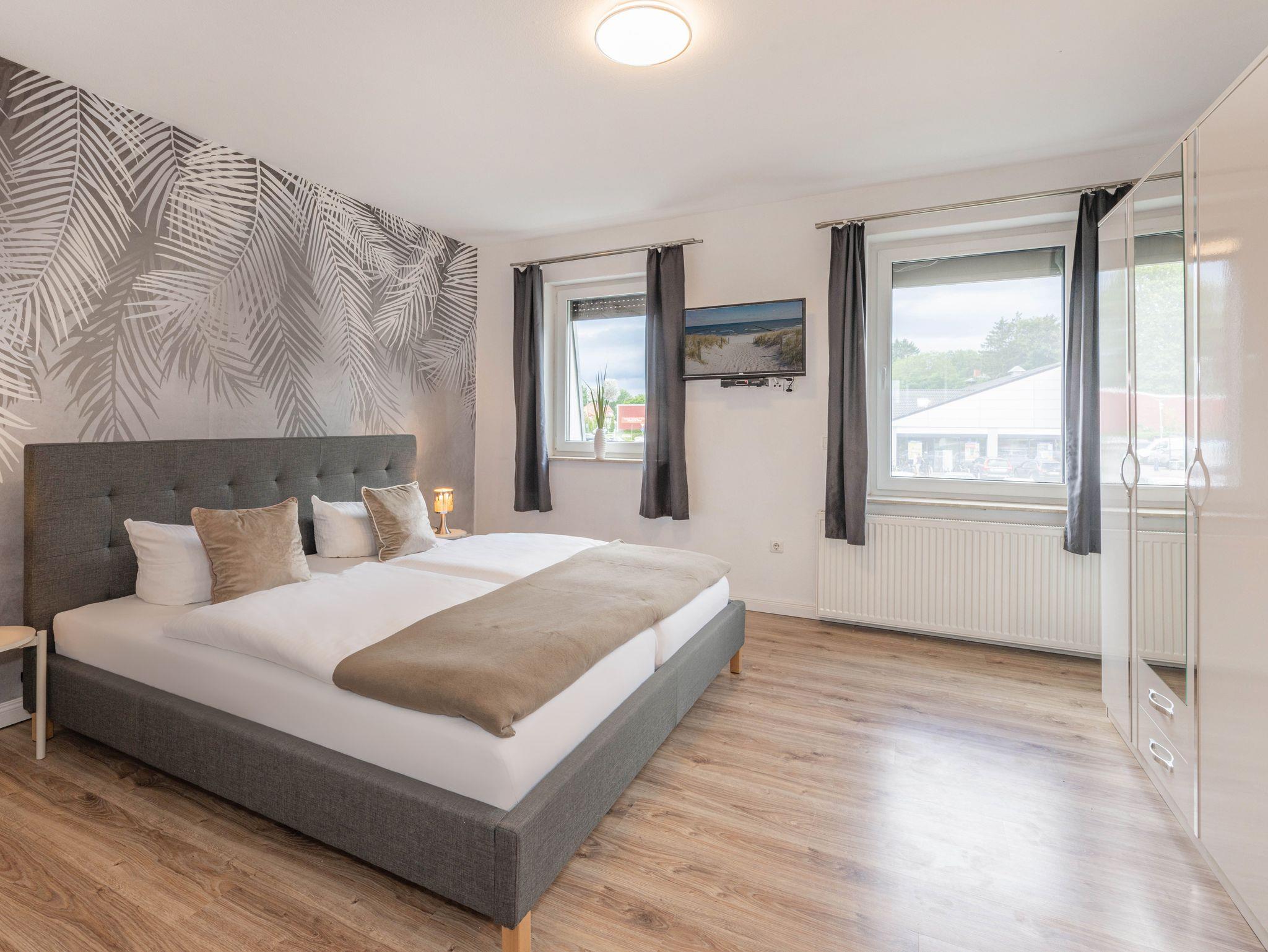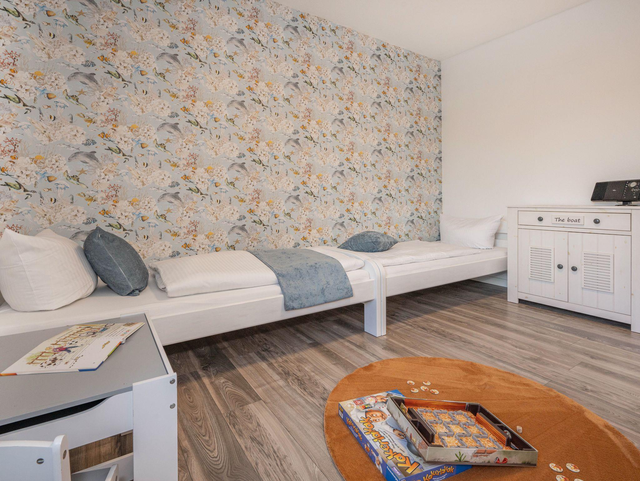 Ein zentraler Flur verbindet die drei Zimmer und das Badezimmer. Die Wohnung bietet Platz für bis zu vier Personen mit Kleinkind und verfügt über ein Schlafzimmer für die Eltern mit einem 180 x 200 cm großen Polsterbett und eigenem TV sowie ein separates Kinderzimmer mit zwei 90 x 200 cm großen Einzelbetten, sowie einer Spielecke mit Kinderküche, einem Spieltischmit LEGO sowie Büchern für Groß und Klein. Für kleinere Kinder stehen ein Kinderbett, ein Kinderstuhl und kindgerechte Ausstattung zur Verfügung.