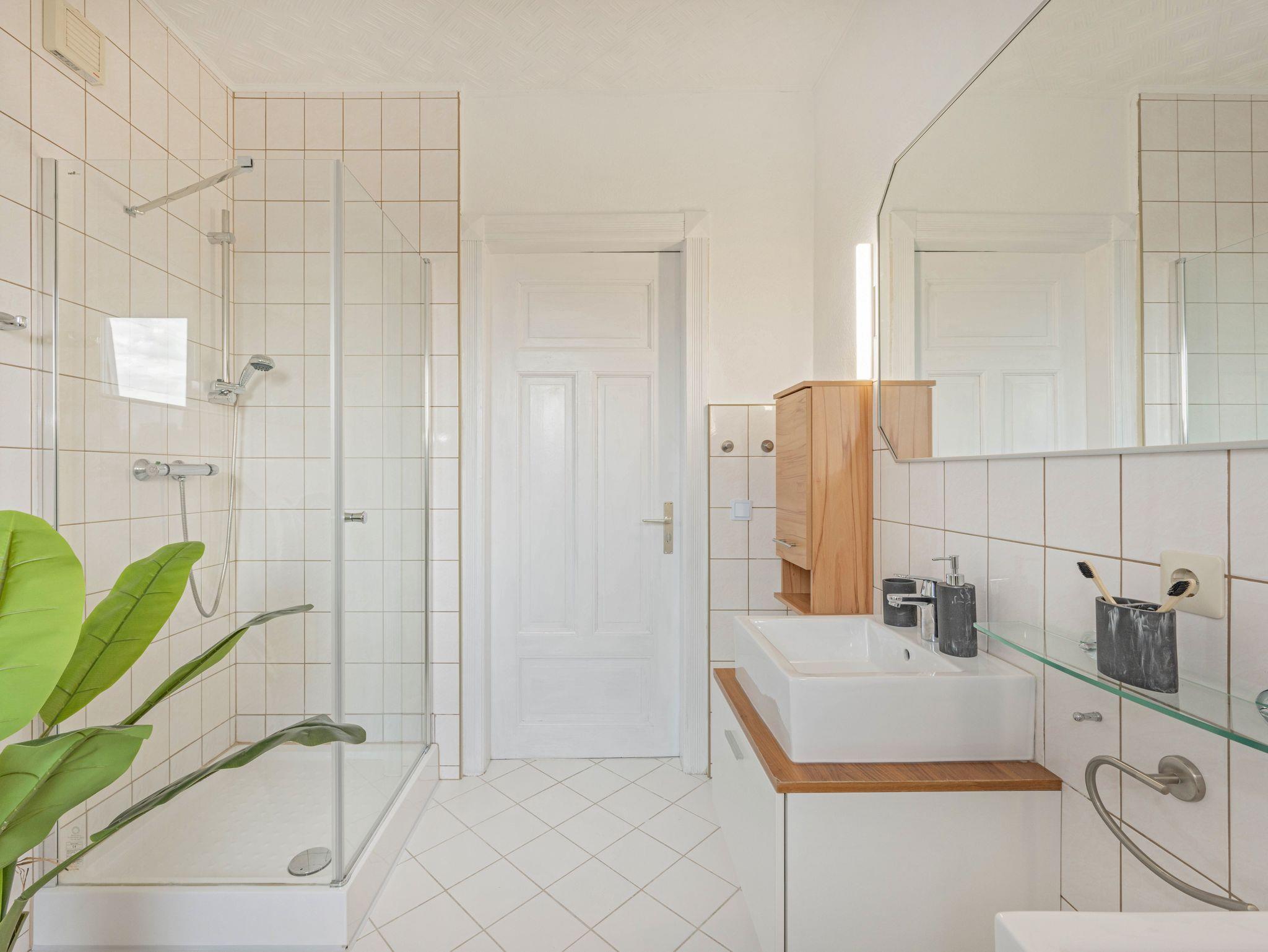 Das moderne Badezimmer ist mit zwei Waschbecken sowie Sitzverkleinerer, Töpfchen und Kindertritt ausgestattet.