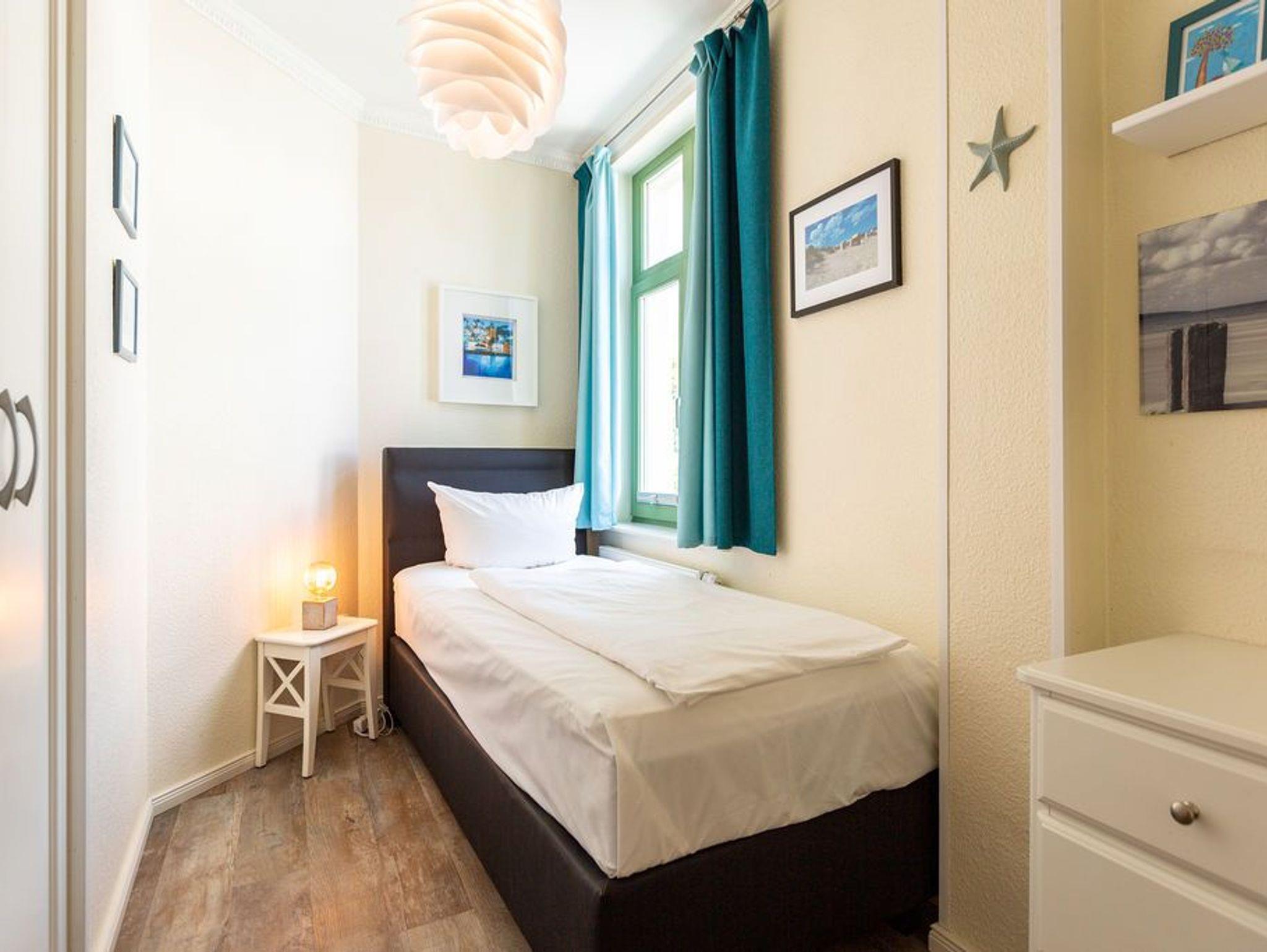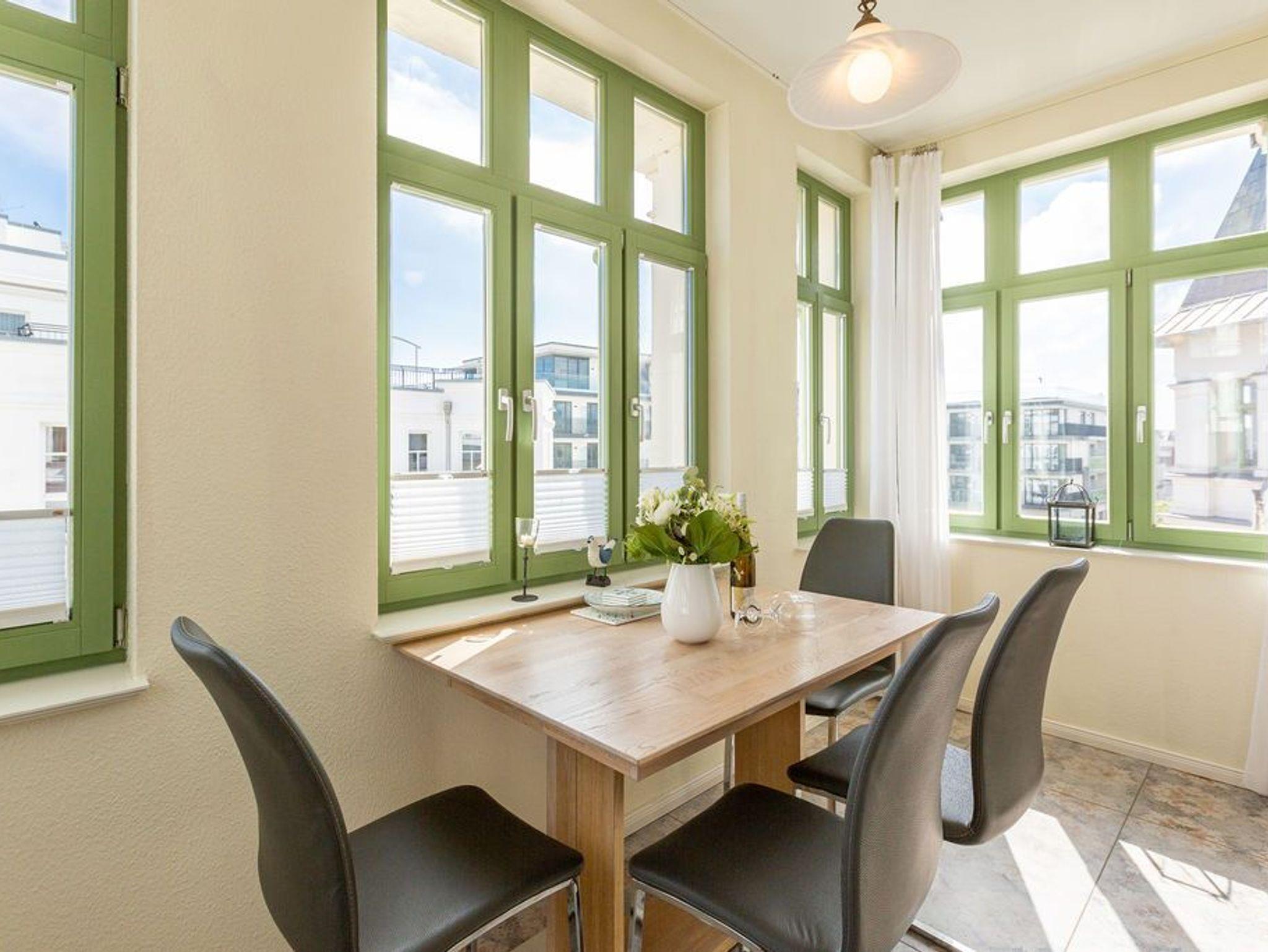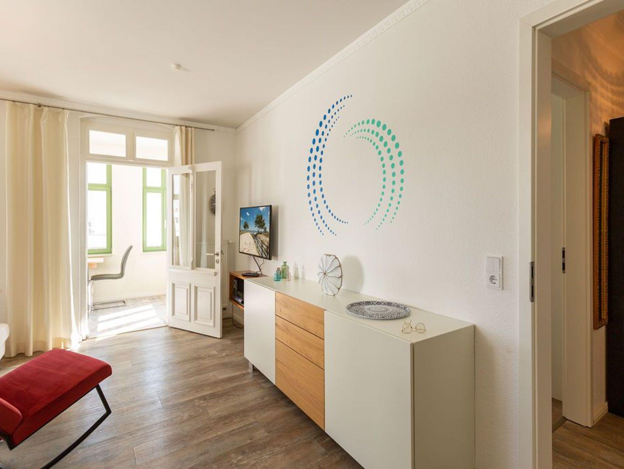 Die stilvolle 3-Raum-Ferienwohnung (58 qm) im 2. Obergeschoss der Villa Frohsinn bietet bis zu 3 Personen Platz zum Wohlfühlen und Entspannen. Hier finden Sie ein Wohnzimmer mit neuer Küchenzeile ( Cerankochfeld, Spülmaschine, Mikrowelle, Backofen), eine schöne verglaste Veranda mit Essbereich, ein Schlafzimmer mit Doppelboxspringbett ( 1,80 m x 2,00 m ), ein Kinderzimmer mit Einzelboxspringbett ( 1,00 m x 2,00 m) und ein Duschbad.
