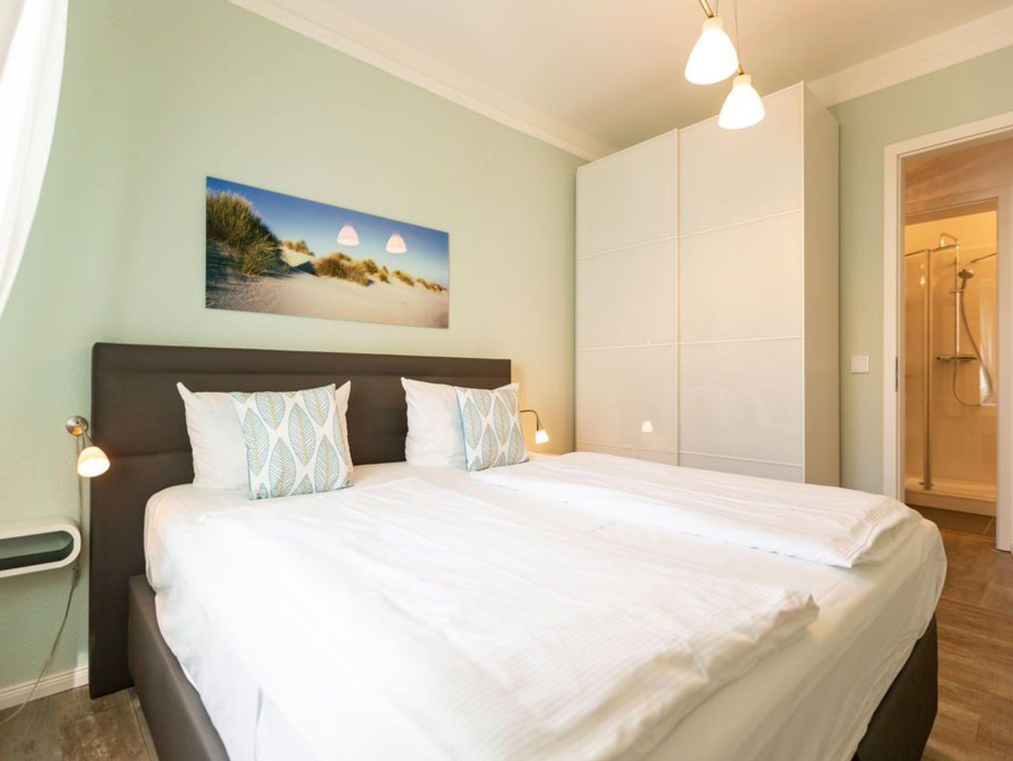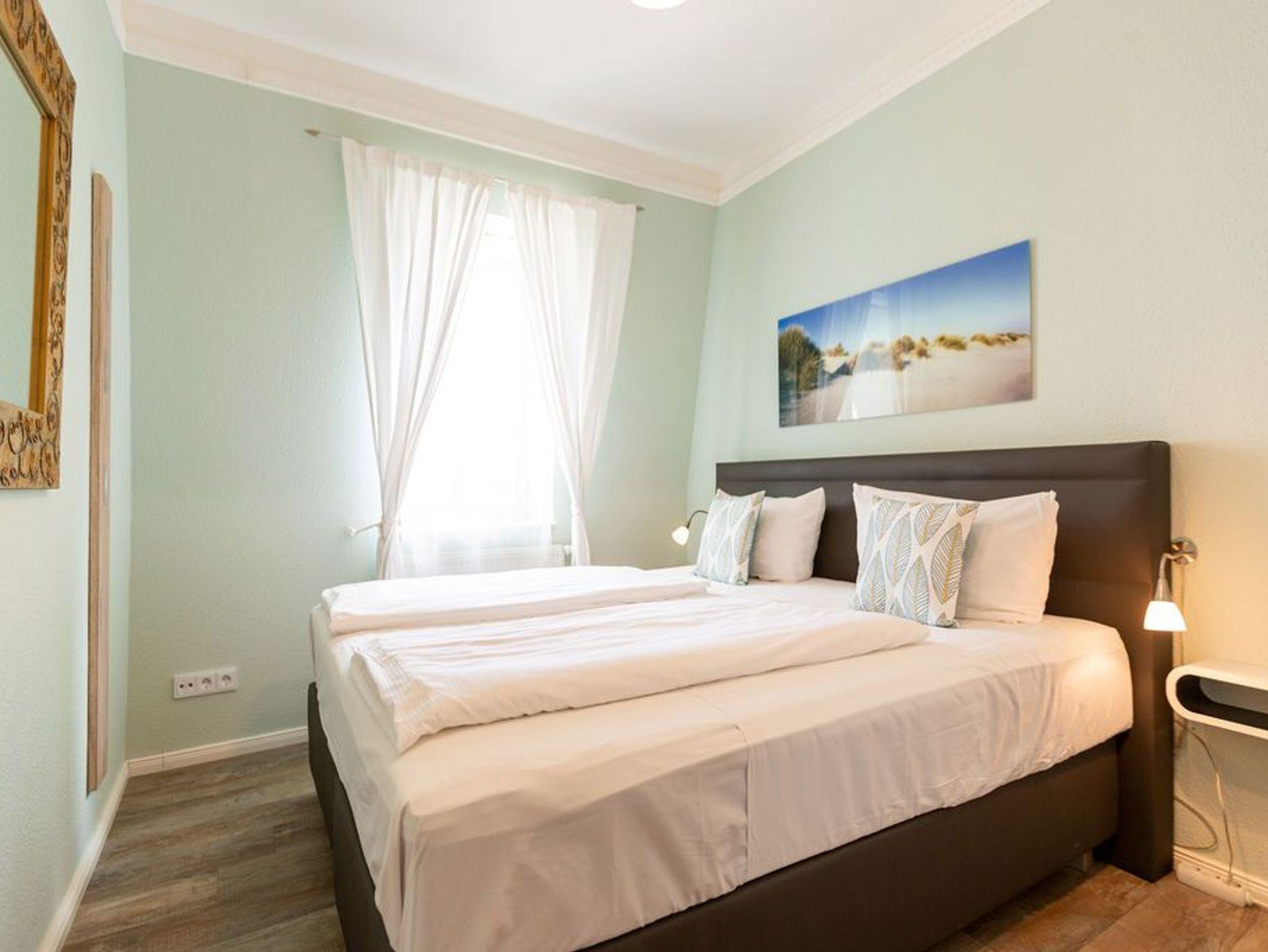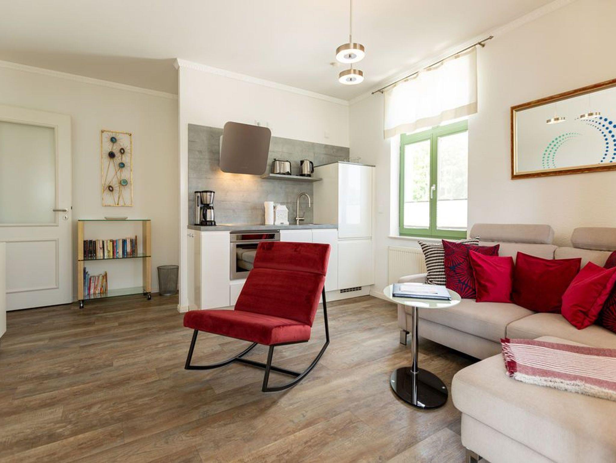 Die stilvolle 3-Raum-Ferienwohnung (58 qm) im 2. Obergeschoss der Villa Frohsinn bietet bis zu 3 Personen Platz zum Wohlfühlen und Entspannen. Hier finden Sie ein Wohnzimmer mit neuer Küchenzeile ( Cerankochfeld, Spülmaschine, Mikrowelle, Backofen), eine schöne verglaste Veranda mit Essbereich, ein Schlafzimmer mit Doppelboxspringbett ( 1,80 m x 2,00 m ), ein Kinderzimmer mit Einzelboxspringbett ( 1,00 m x 2,00 m) und ein Duschbad.