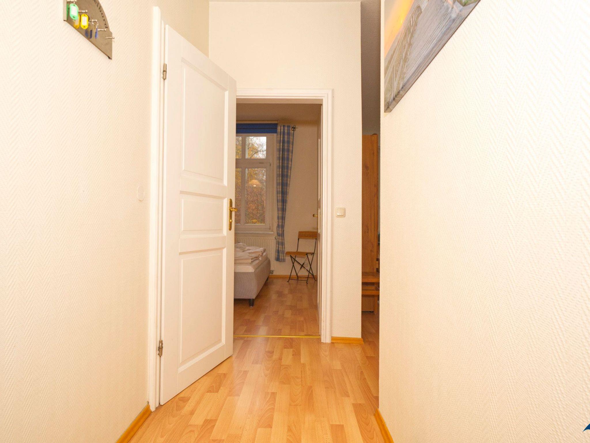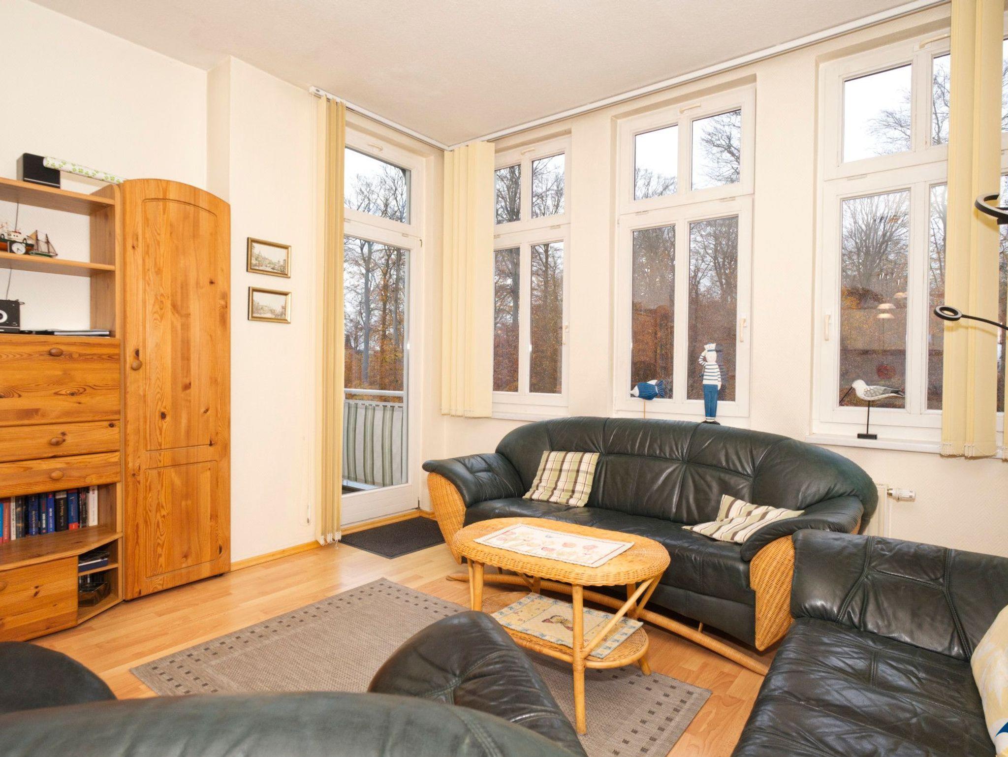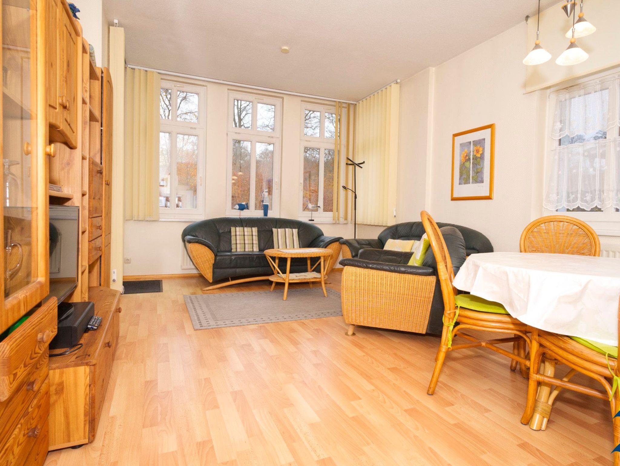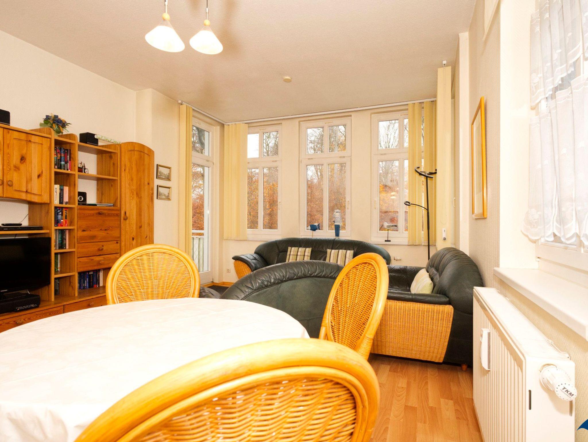 Die 3-Raum-Nichtraucher-Ferienwohnung befindet sich im 1. Obergeschoss des Gartenhauses der denkmalgeschützten Jugendstilvilla “Frieda“. Sie bietet mit 54 m² ausreichend Platz für bis zu 4 Personen. Die Wohnung verfügt über 2 separate Schlafzimmer, ein geräumiges Wohnzimmer mit Essbereich und einer voll ausgestatteten Küchenzeile mit Cerankochfeld, Geschirrspüler, Kühlschrank und Gefrierfach, die offen in den Wohnbereich integriert ist. Ein Badezimmer mit Dusche & WC und ein Balkon in Süd-West Ausrichtung mit Blick auf den weitläufigen Buchenpark, machen diese Ferienwohnung zu Ihrem Feriendomizil.