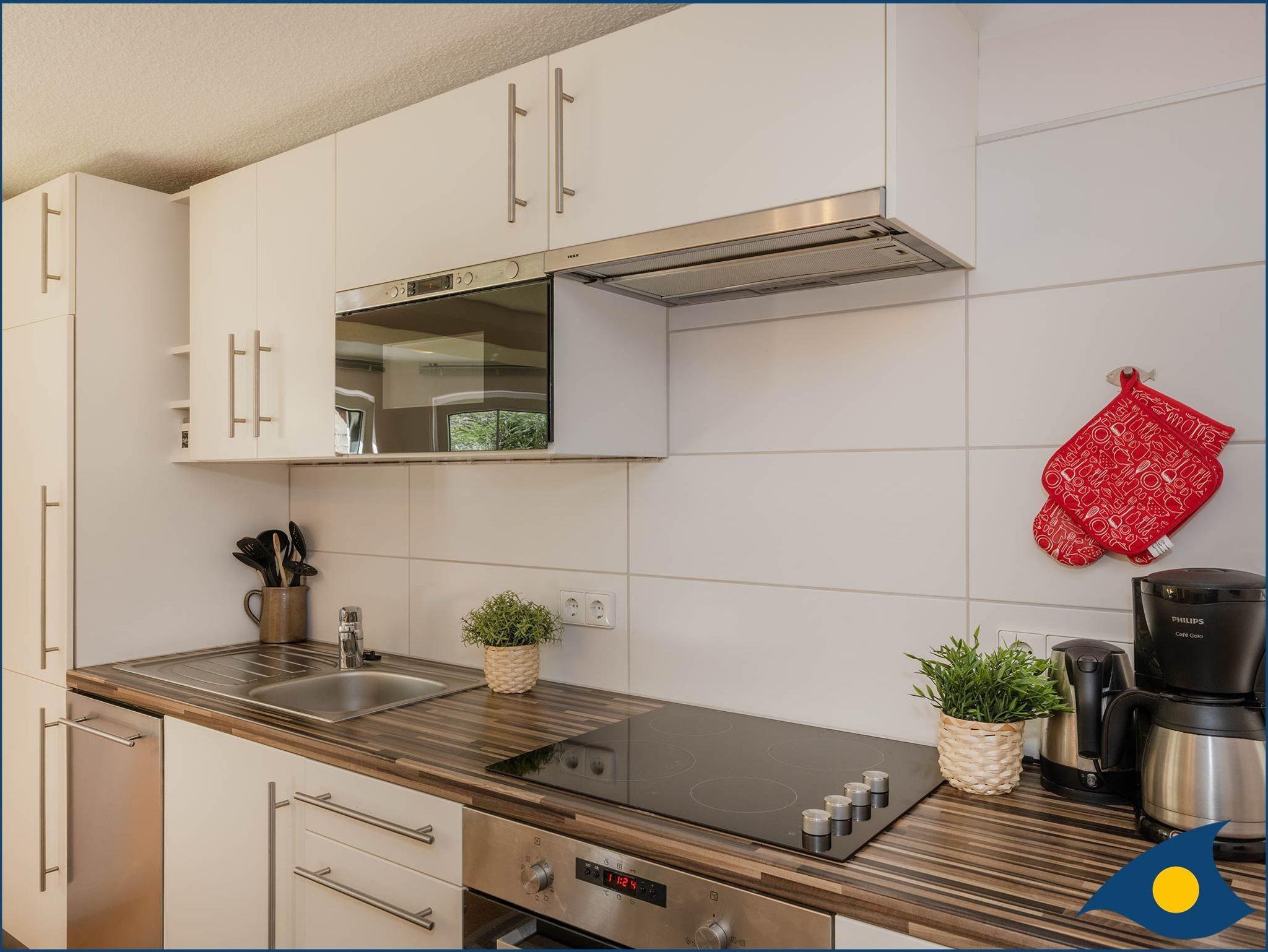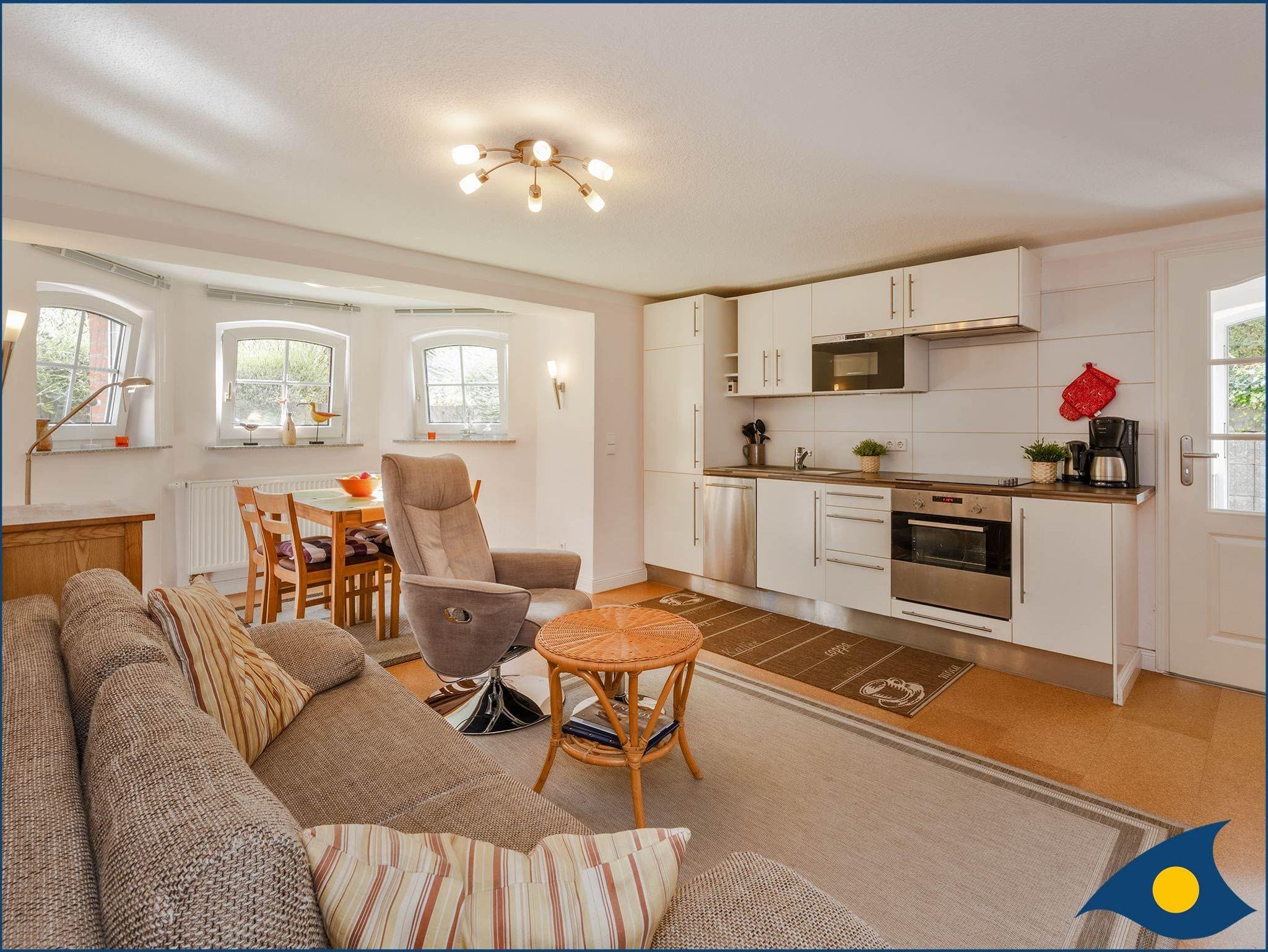 Der freundlich und hell eingerichtete Wohnraum lädt mit seiner Küchenzeile zum gemeinsamen Kochen und einem entspannten Abend auf dem gemütlichen Sofa ein.