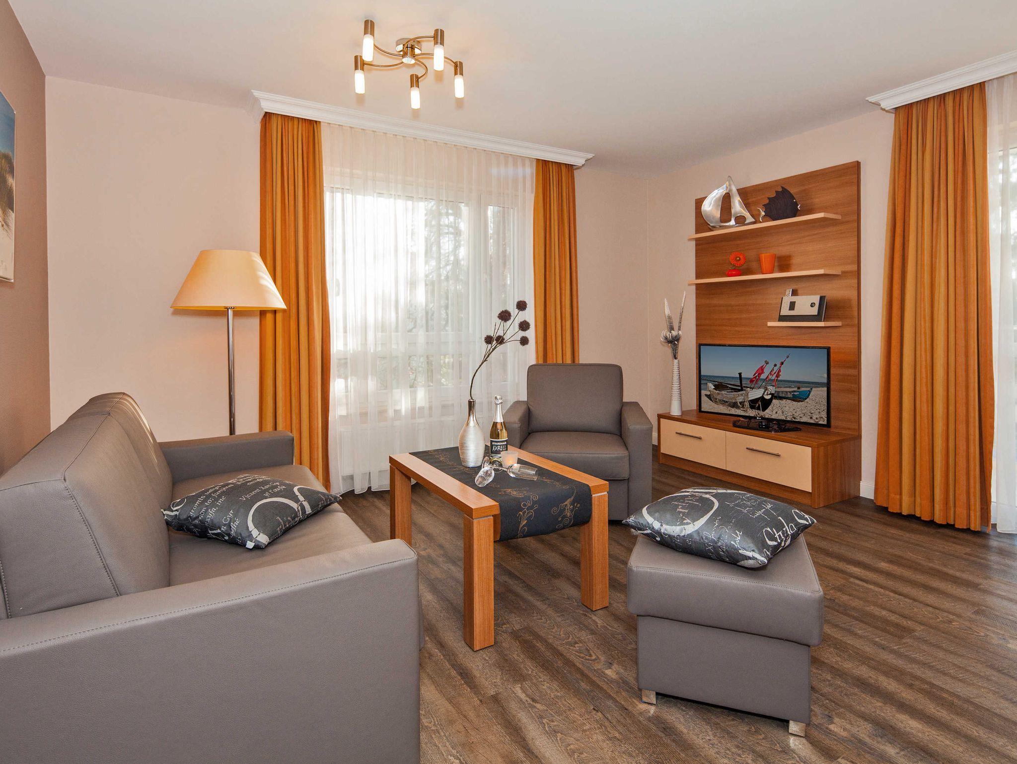 Moderne stilvolle 2 Zimmerferienwohnung ca. 2 - 4 Personen. Wohnzimmer mit TV, CD Eßplatz und integrierter Vollküche mit Geschirrspüler. Die Wohnung besitzt eine sonnige Terrasse mit Bestuhlung und Strandkorb.