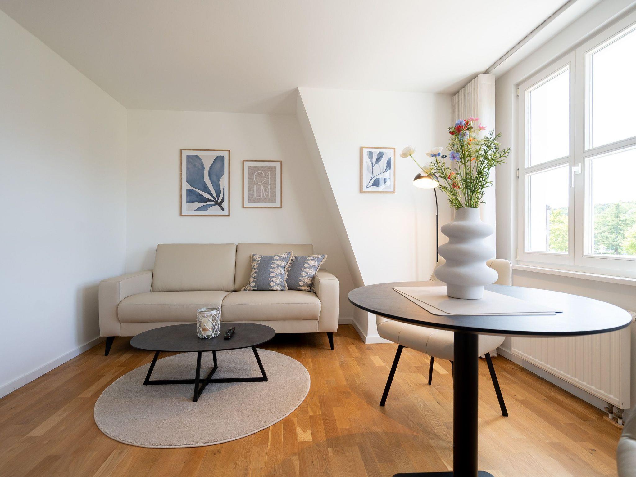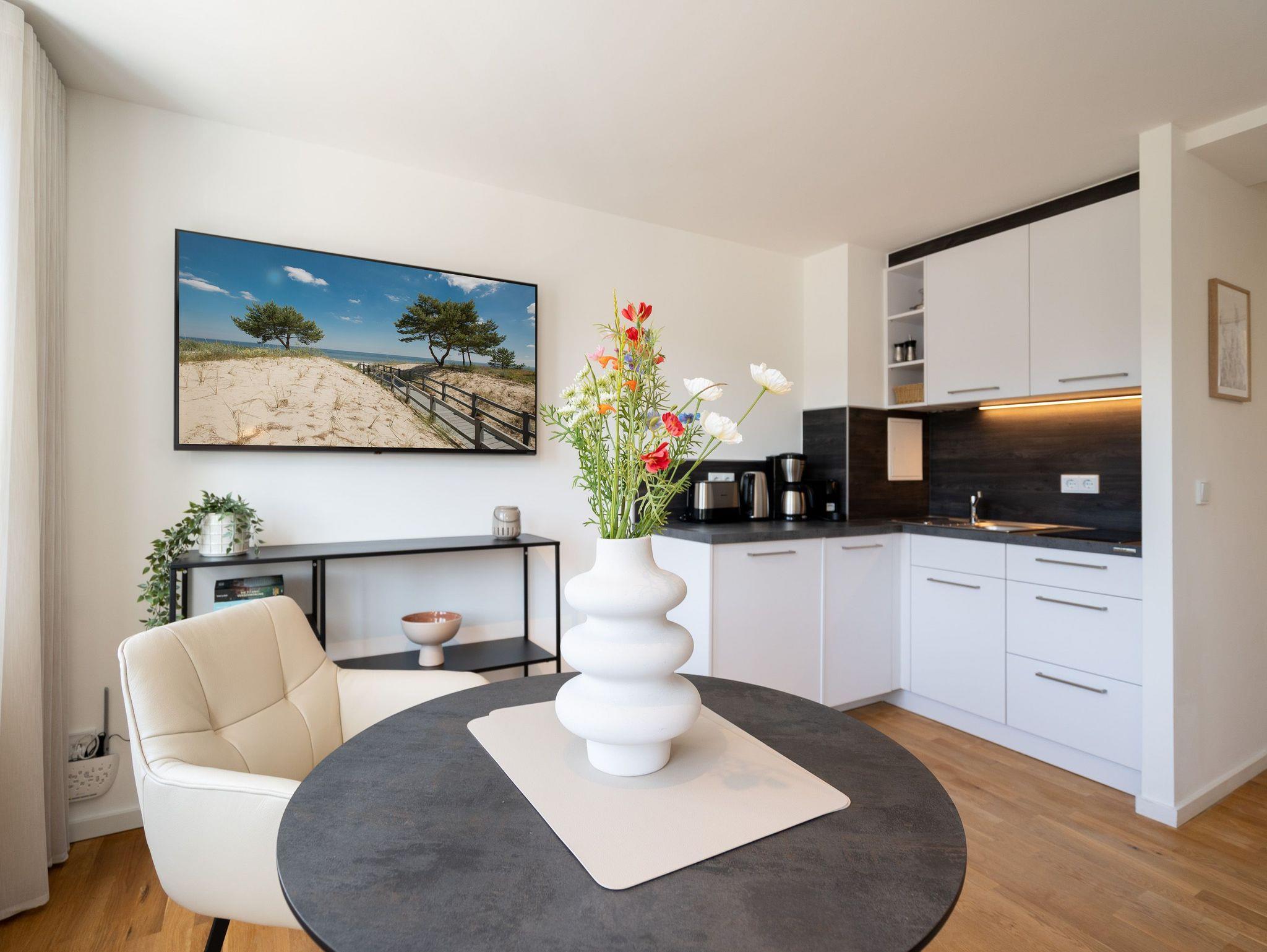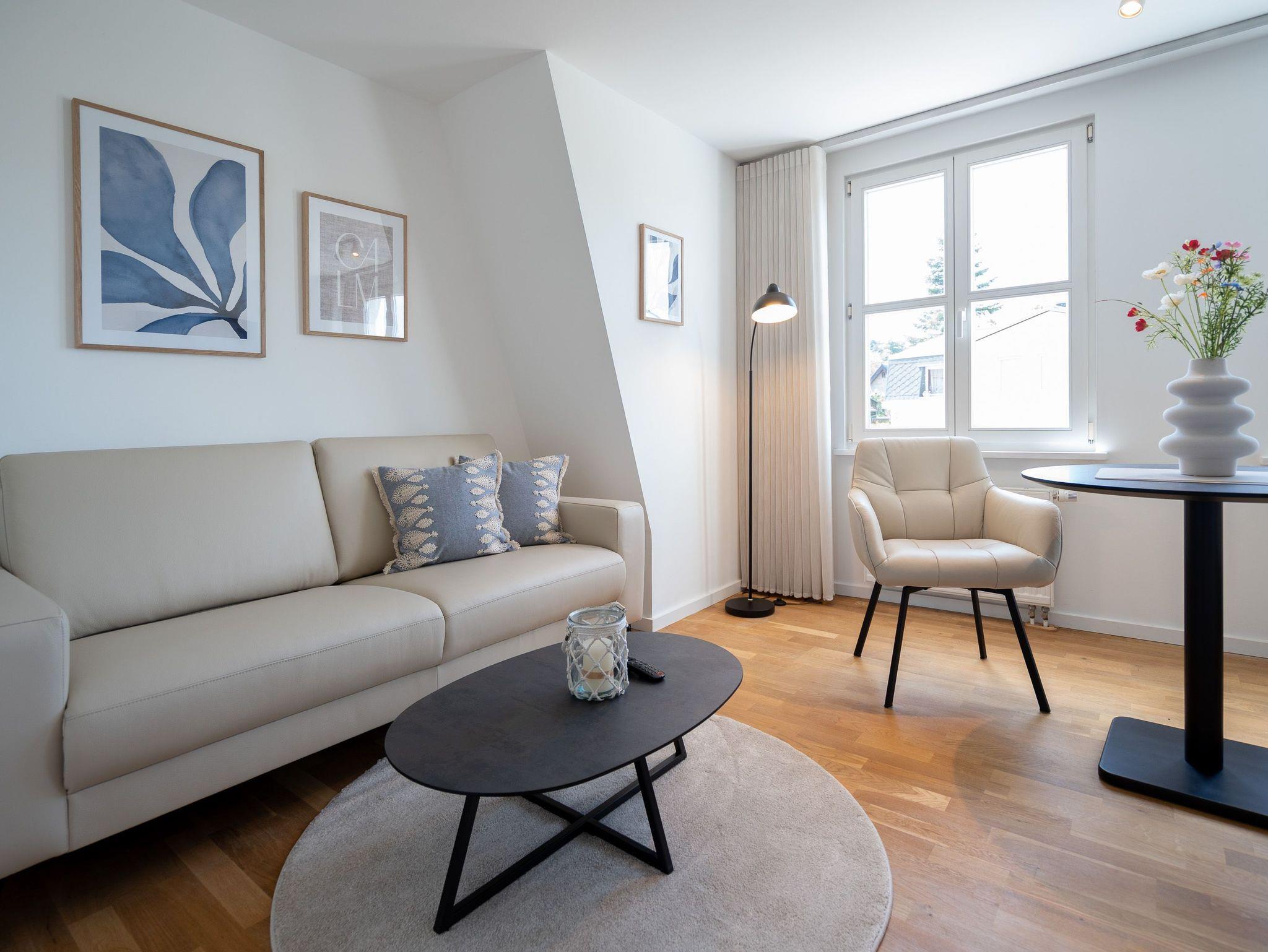 Gemütliches 2-Raum-Appartement Nr. 7 im Dachgeschoss ? Rückzugsort mit Aussicht. Dieses charmante 2-Raum-Appartement Nr. 07 im Dachgeschoss der Villa Elisabeth bietet auf 32?m² ein Zuhause für zwei ? mit viel Licht, durchdachter Ausstattung und einer Extraportion Behaglichkeit unterm Dach. Im offenen Wohnbereich finden Sie alles, was das Urlaubsleben angenehm macht: Eine moderne Küchenecke mit 2-Platten-Cerankochfeld, Spülmaschine, Kühlschrank mit Gefrierfach und Nespresso-Kapselmaschine, dazu ein Essplatz für zwei Personen ? ideal für entspannte Frühstücke oder ein Gläschen Wein am Abend. Das gemütliche Sofa und ein 55-Zoll-Flat-TV machen den Wohnbereich zur persönlichen Wohlfühlzone. Das separate Schlafzimmer ist mit einem komfortablen Boxspringbett (1,80?m x 1,95?m) ausgestattet. Ein Kleiderschrank befindet sich im Flur ? praktisch erreichbar und mit ausreichend Platz für Ihre Urlaubsgarderobe. Das Bad ist kompakt, aber funktional gestaltet: mit Dusche (85?cm x 70?cm), Waschtisch und WC ? alles da, was man braucht. Ein fester PKW-Stellplatz (Nr.?7) befindet sich direkt vor dem Haus. Kostenfreies WLAN ist natürlich ebenfalls vorhanden. Ein schöner Rückzugsort für zwei ? mit allem, was Sie für entspannte Tage an der Ostsee brauchen.