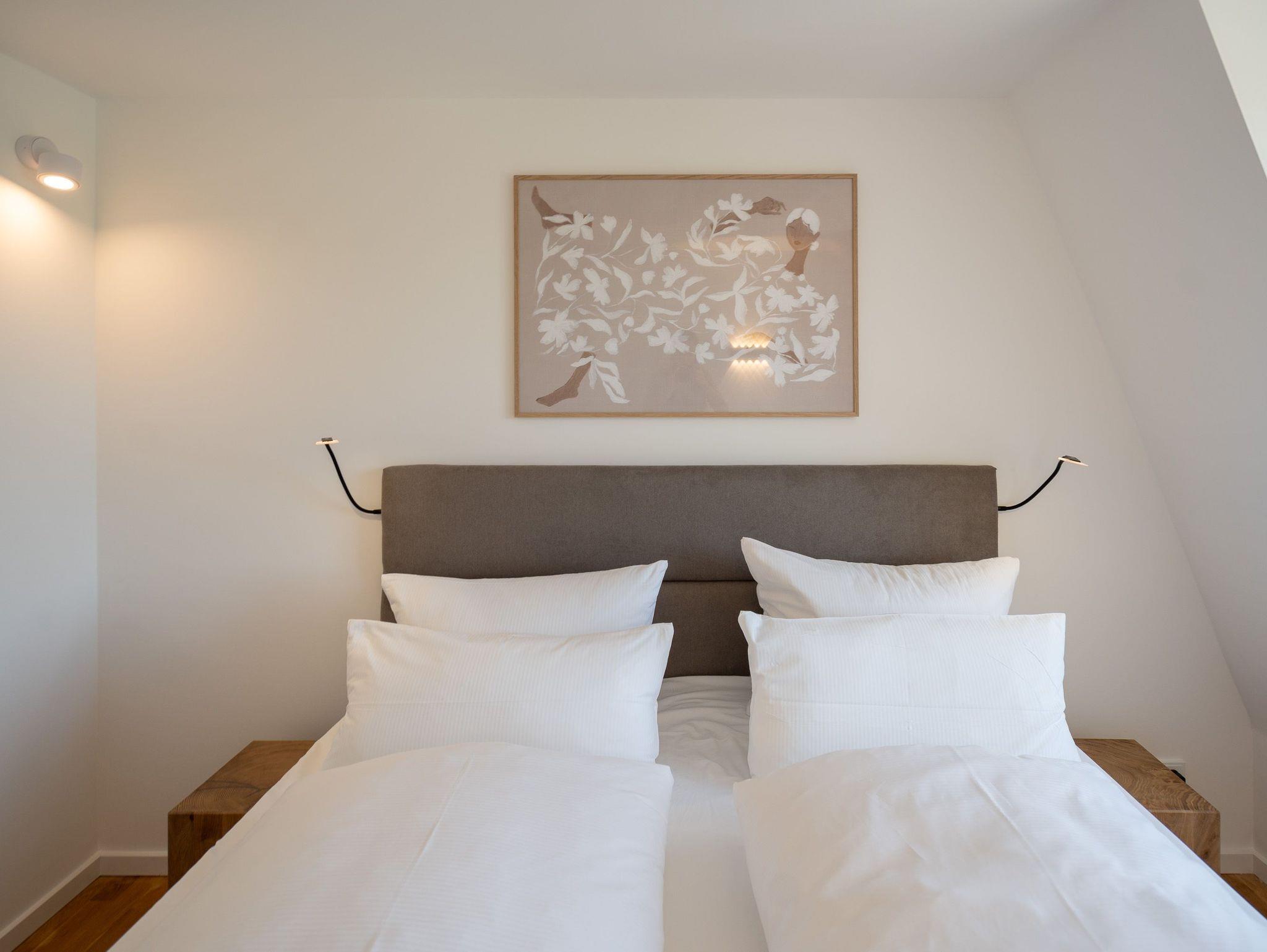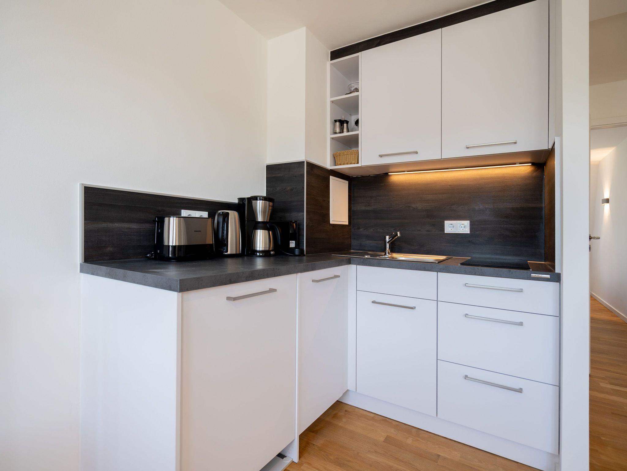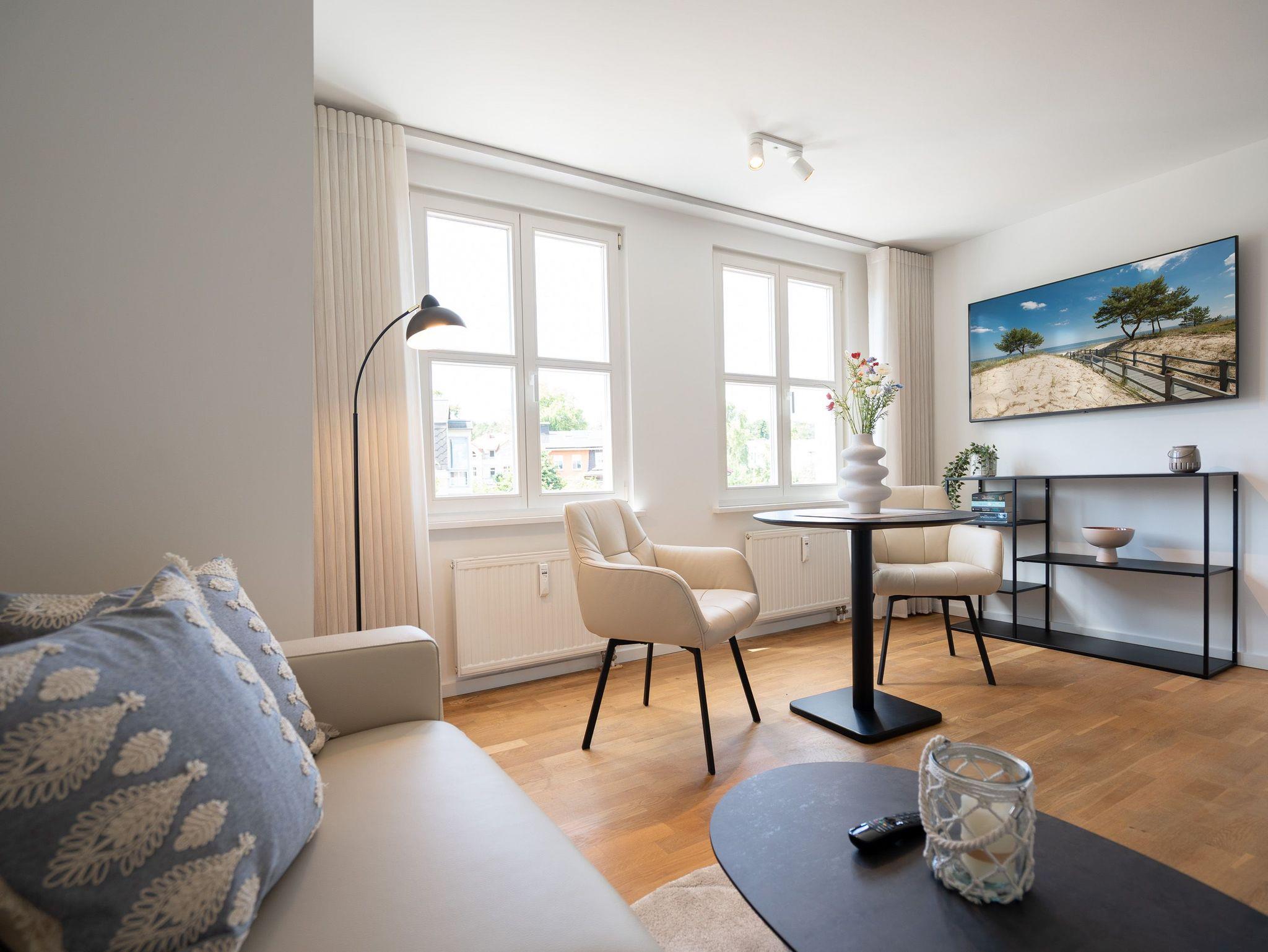 Gemütliches 2-Raum-Appartement Nr. 7 im Dachgeschoss ? Rückzugsort mit Aussicht. Dieses charmante 2-Raum-Appartement Nr. 07 im Dachgeschoss der Villa Elisabeth bietet auf 32?m² ein Zuhause für zwei ? mit viel Licht, durchdachter Ausstattung und einer Extraportion Behaglichkeit unterm Dach. Im offenen Wohnbereich finden Sie alles, was das Urlaubsleben angenehm macht: Eine moderne Küchenecke mit 2-Platten-Cerankochfeld, Spülmaschine, Kühlschrank mit Gefrierfach und Nespresso-Kapselmaschine, dazu ein Essplatz für zwei Personen ? ideal für entspannte Frühstücke oder ein Gläschen Wein am Abend. Das gemütliche Sofa und ein 55-Zoll-Flat-TV machen den Wohnbereich zur persönlichen Wohlfühlzone. Das separate Schlafzimmer ist mit einem komfortablen Boxspringbett (1,80?m x 1,95?m) ausgestattet. Ein Kleiderschrank befindet sich im Flur ? praktisch erreichbar und mit ausreichend Platz für Ihre Urlaubsgarderobe. Das Bad ist kompakt, aber funktional gestaltet: mit Dusche (85?cm x 70?cm), Waschtisch und WC ? alles da, was man braucht. Ein fester PKW-Stellplatz (Nr.?7) befindet sich direkt vor dem Haus. Kostenfreies WLAN ist natürlich ebenfalls vorhanden. Ein schöner Rückzugsort für zwei ? mit allem, was Sie für entspannte Tage an der Ostsee brauchen.