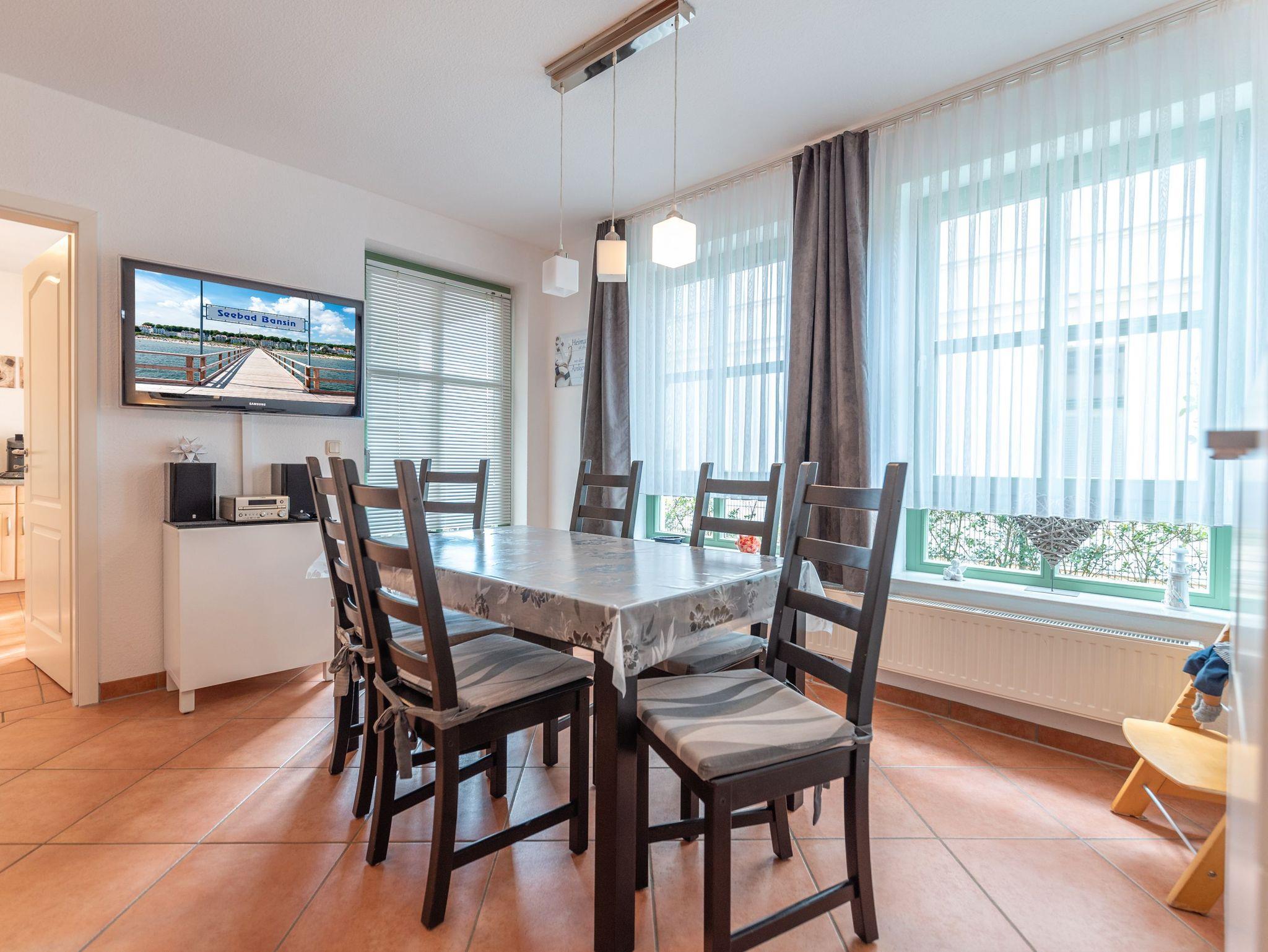 Der gemütliche Wohn- und Essbereich ist mit einer Couch, die sich bei Bedarf in ein zusätzliches Bett verwandeln lässt, einem Esstisch mit sechs Stühlen sowie TV, Radio und DVD-Player ausgestattet. Ein Kinderhochstuhl (Trip Trapp) ist ebenfalls vorhanden, und ein Babyhochstuhl kann auch genutzt werden. Zusätzlich gibt es noch einen Flaschensterilisator, ein Abtropfgestell dazu und einen Babybadewanne. Die Küche lässt keine Wünsche offen und verfügt über eine Spülmaschine, Mikrowelle, Kaffeemaschine, Senseomaschine, Toaster, Eierkocher, Kühl-Gefriergerät und E-Herd.