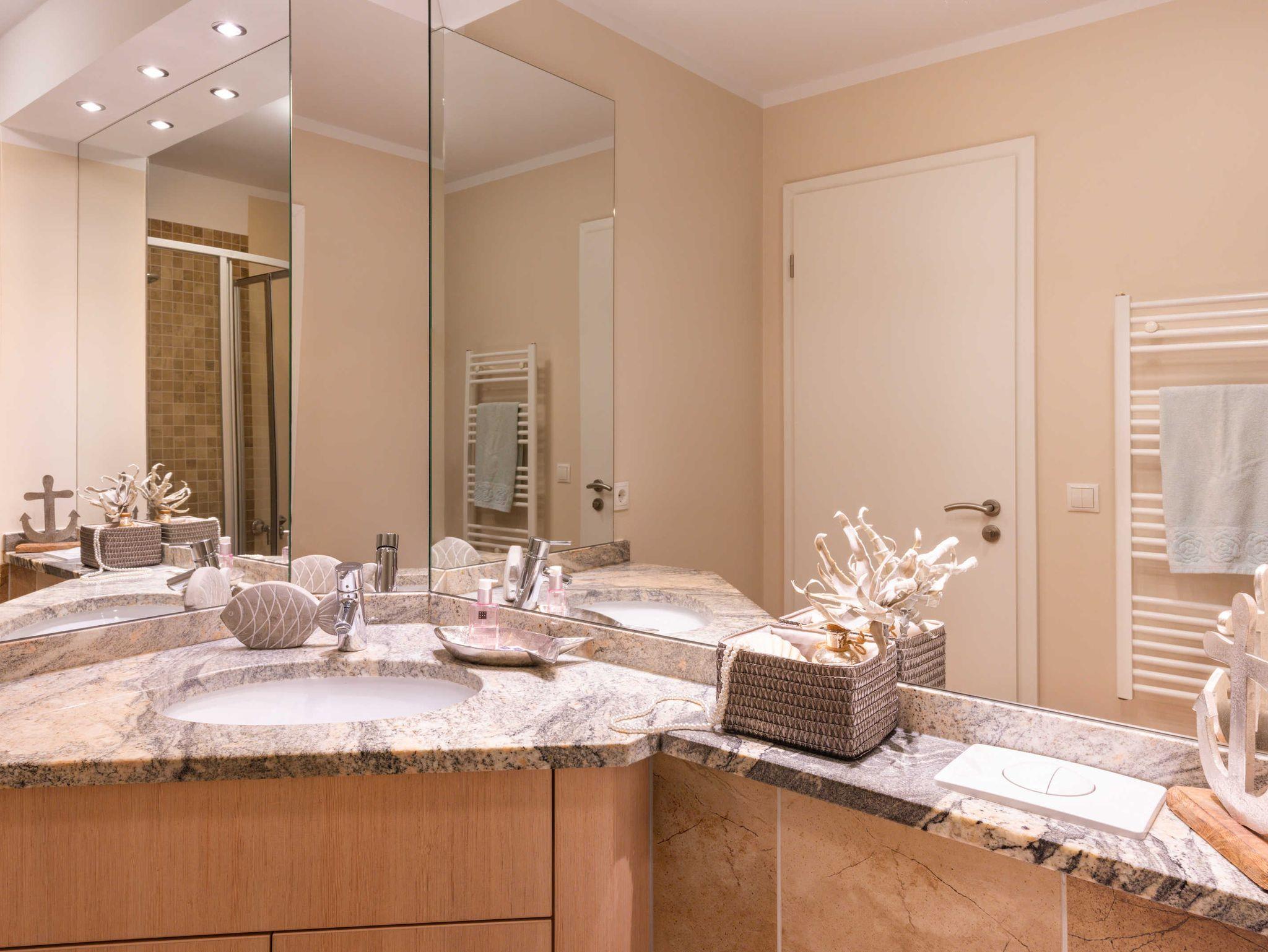 (Meerblick) Stilvolle moderne 3 Zimmer- Ferienwohnung mit ca. 67 qm. Die Wohnung verfügt über zwei Schlafräume mit je einem Doppelbett ( 180 x 200 ) , einem großen Balkon mit Meerblick, sowie ein zusätzliches Gäste WC!! Das Haus bietet die Möglichkeit Fahrräder gegen Gebühr zu leihen. Waschmaschine und Trockner stehen Ihnen im Haus als Münzautomaten zur Verfügung!