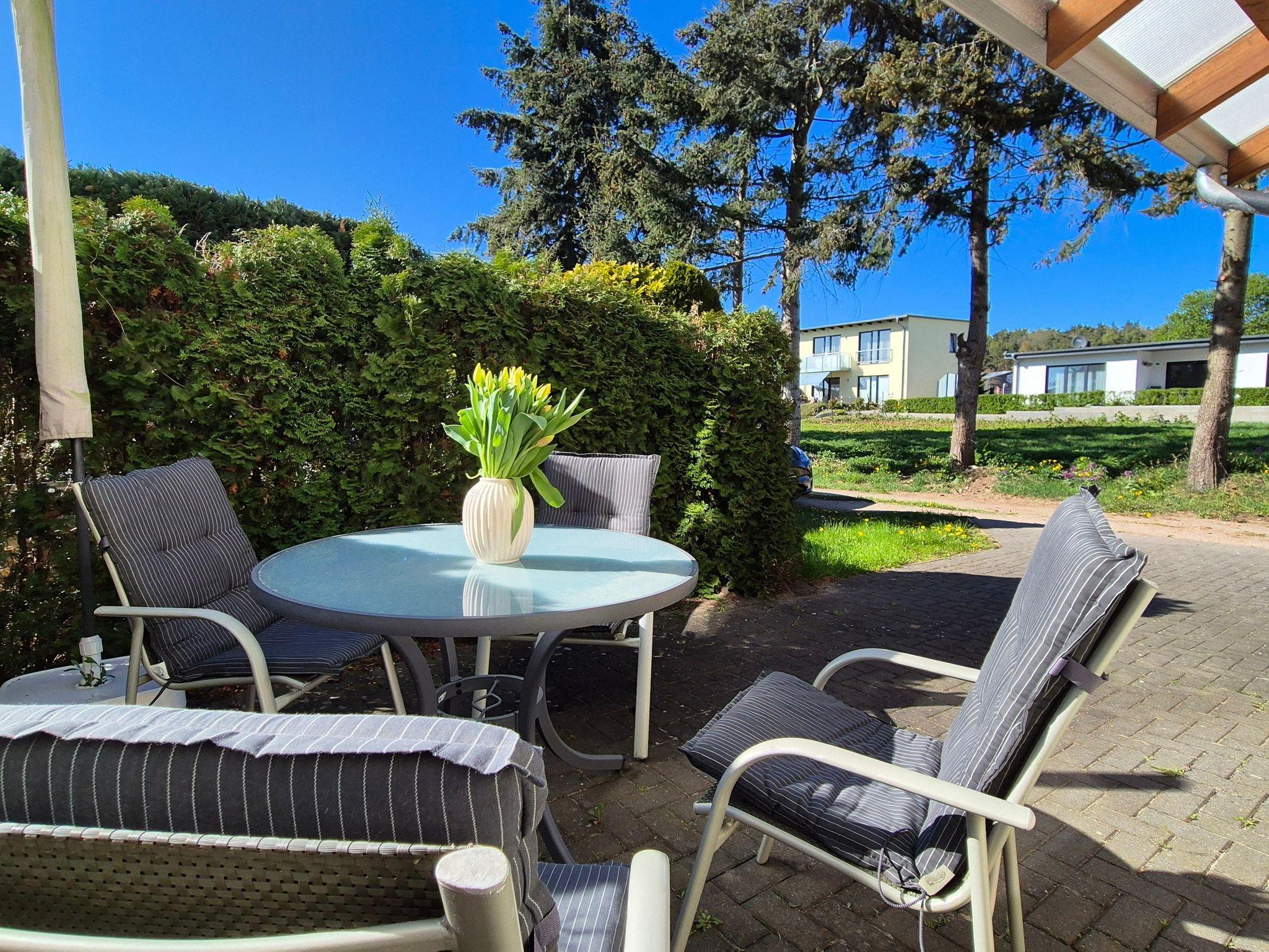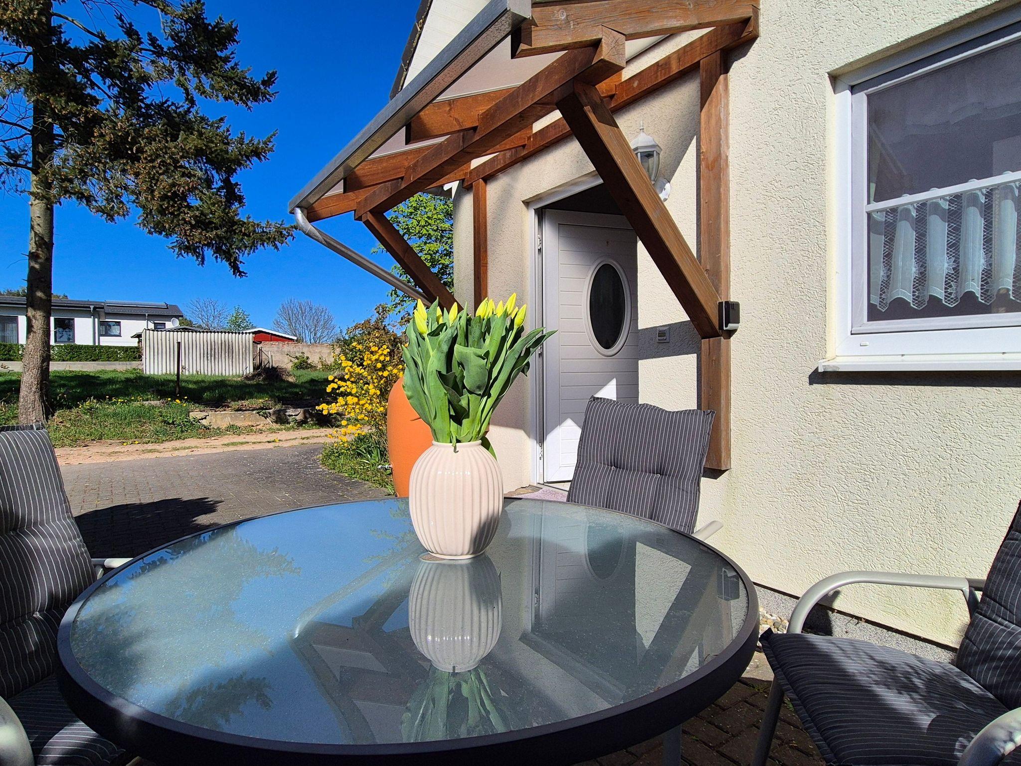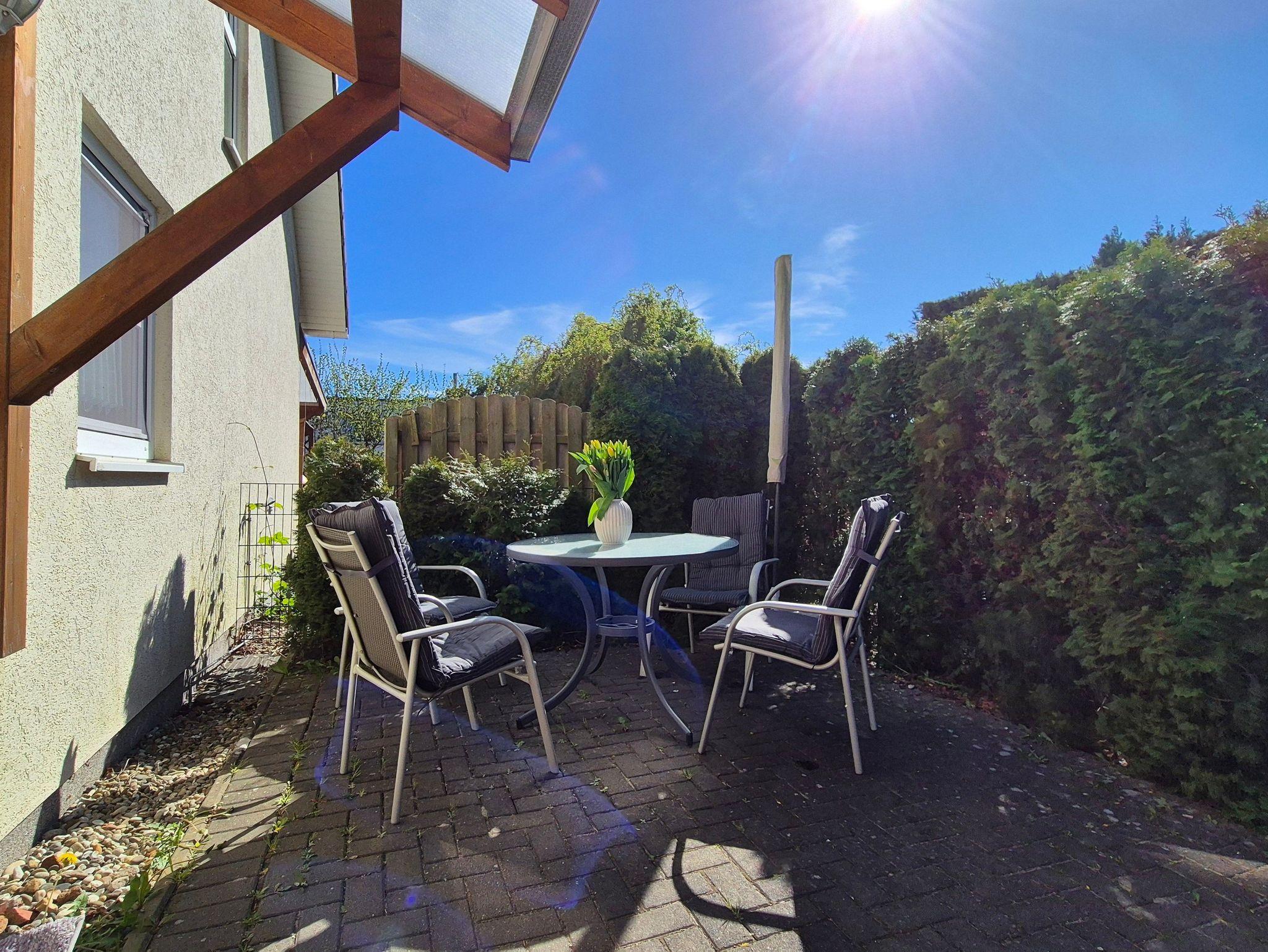 • Neben dem Eingangsbereich der Ferienwohnung befindt sich die Terrasse mit Sitzgelegenheit.
