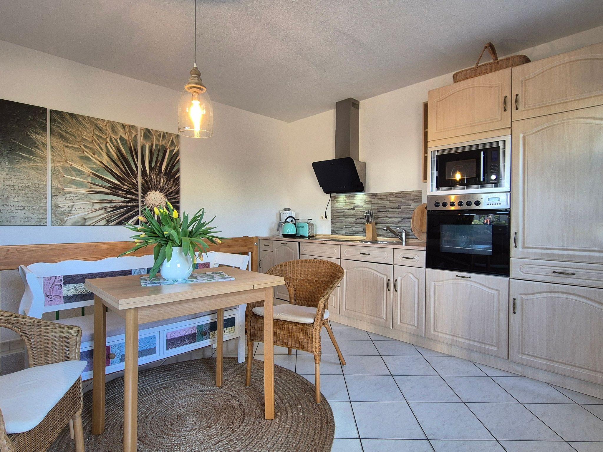 Diese Ferienwohnung erstreckt sich über zwei Etagen und ist ideal für zwei Personen. Zur ebenen Erde befindet sich die offene, voll ausgestattete Küche mit dem hellen Essbereich. Im Souterrain finden Sie das modern eingerichtete Wohnzimmer und das Schlafzimmer sowie das Bad vor. Alle Räume verfügen über Fenster und sind modern eingerichtet. Das Bad ist mit einer flachen Dusche und einem Fenster ausgestattet. Eine möblierte Terrasse gehört zur Wohnung, ebenso wie ein PKW Stellplatz. WLAN ist vorhanden. Die Ferienwohnung befindet sich in 17429 Heringsdorf, Dorf Bansin 3a.