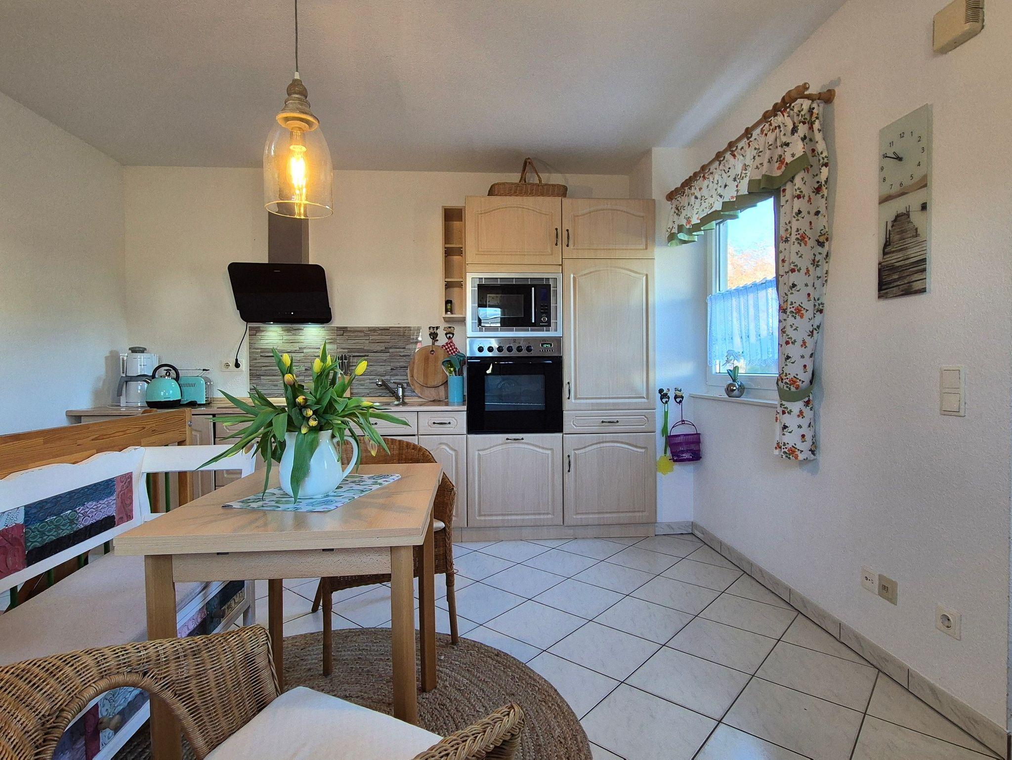 • Die modern eingerichtete Küche (im Erdgeschoss) mit hellem Essbereich verfügt über ein Glaskeramikkochfeld, einen Backofen, eine Mikrowelle, eine Geschirrspülmaschine, einen Kühlschrank, eine kleiner Tiefkühlschrank, eine Kaffeemaschine, einen Toaster, Wasserkocher und Geschirr.