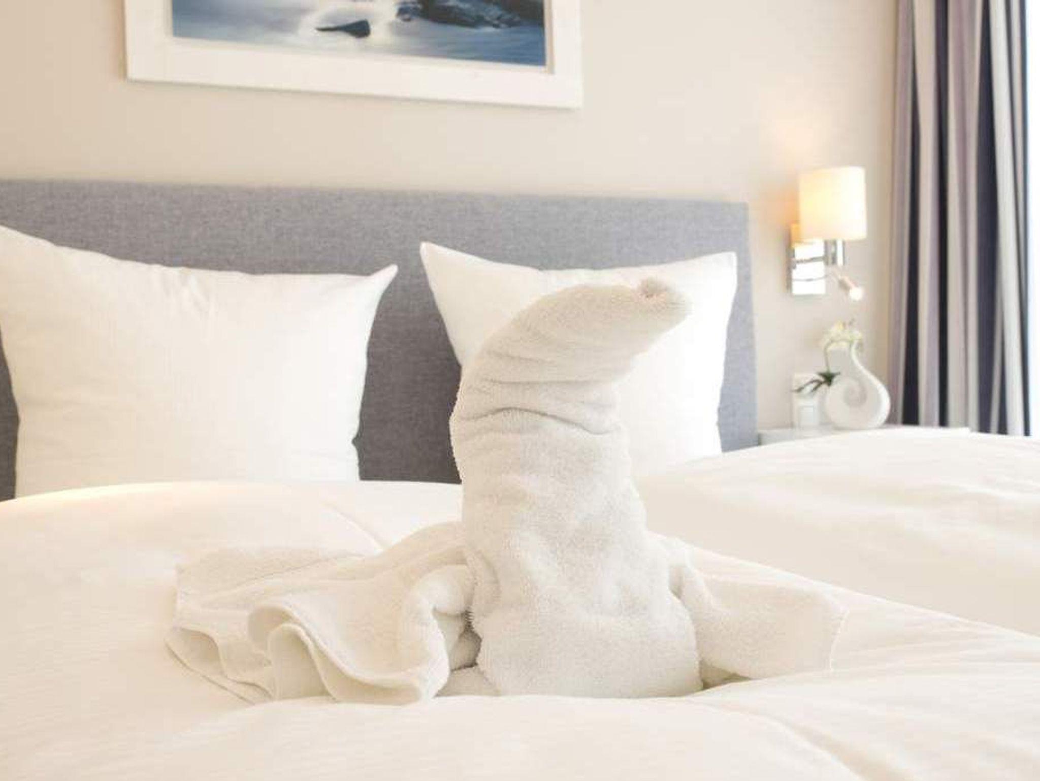 Logieren Sie in unserer neuen Penthouse-Ferienwohnung (108 qm für 4 Personen) direkt in Bansin. Geschmackvoller Lifestyle trifft hier auf großzügiges Wohnen und eine wunderschöne Dachterrasse die aus jedem Zimmer begehbar ist. Der moderne, helle Wohnbereich mit kompletter Fensterfront bietet eine bequeme Ledersitzgruppe, Flat TV mit Heimkinosystem und Blue Ray Player und als zusätzliches Highlight einen Gaskamin, der ganz einfach per Fernbedienung zu nutzen ist. Die offene, komplett ausgestattete Küche mit schöner Kochinsel wird ergänzt durch den angrenzenden, großzügigen Essplatz. Die 2 Schlafzimmer mit hochwertigen Boxspringbetten (1,80 x 2,00m) verfügen jeweils über einen zusätzlichen Flat TV . Im großen Bad mit ebenerdiger Echtglasdusche, Regenwaldbrause und Doppelwaschtisch finden Sie auch die wohnungseigene Sauna. Ein zusätzliches Bad bietet ebenfalls eine ebenerdige Echtglasdusche und WC. Fast umlaufend und zur Ost-, Süd- und Westseite ausgerichtet, ist die die riesige Dachterrasse (mit ausfahrbarer Markise) nicht nur im Sommer ein besonderes Bonbon. Vielfältige Sitzmöglichkeiten (Esstisch, großer Strandkorb, kleiner Sitzbereich [&] geschützter Loungebereich) und der seitliche Blick auf den schönen Schloonsee laden zum Erholen und Entspannen ein. Ein Pkw-Stellplatz (gekennzeichnet mit der Wohnungsnummer) steht am Haus zur Verfügung, für Fahrräder [&] Strandsachen gibt es einen Abstellraum im Keller. Für Ihren Komfort steht die Erstausstattung Wäsche für Sie bereit. Das WLAN-Netz im Haus ist kostenfrei nutzbar.