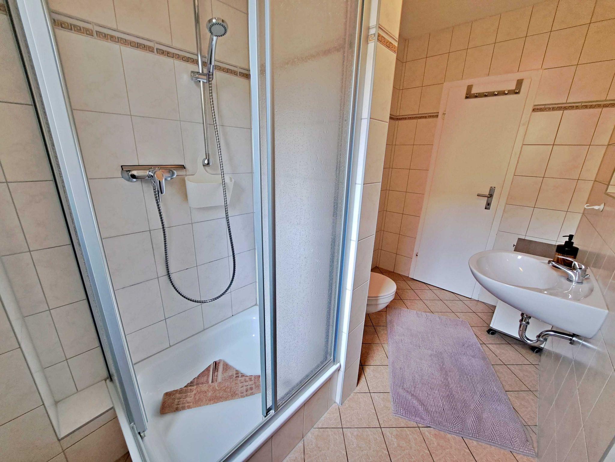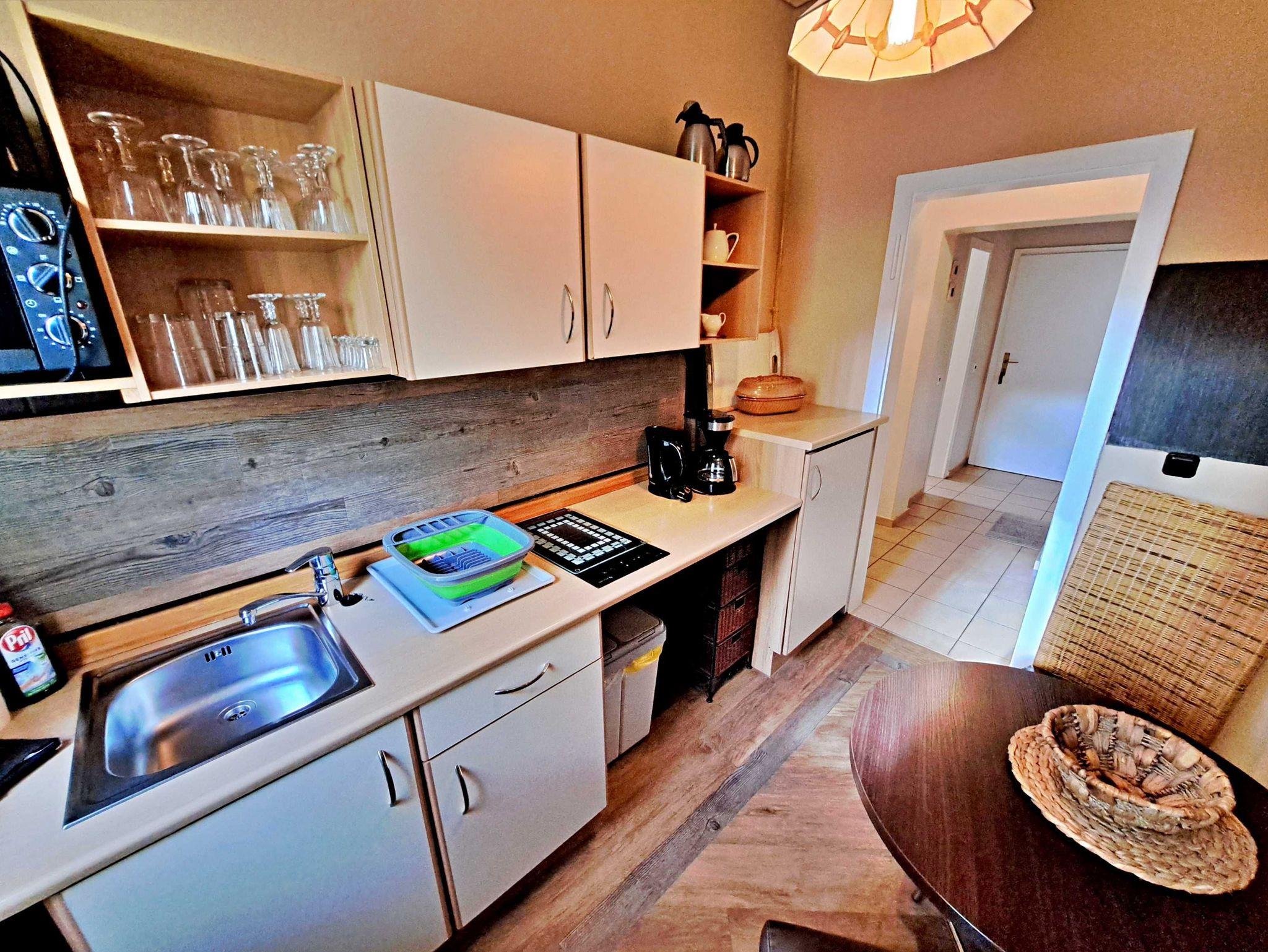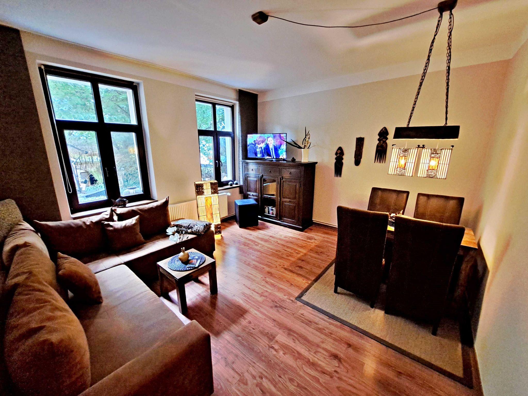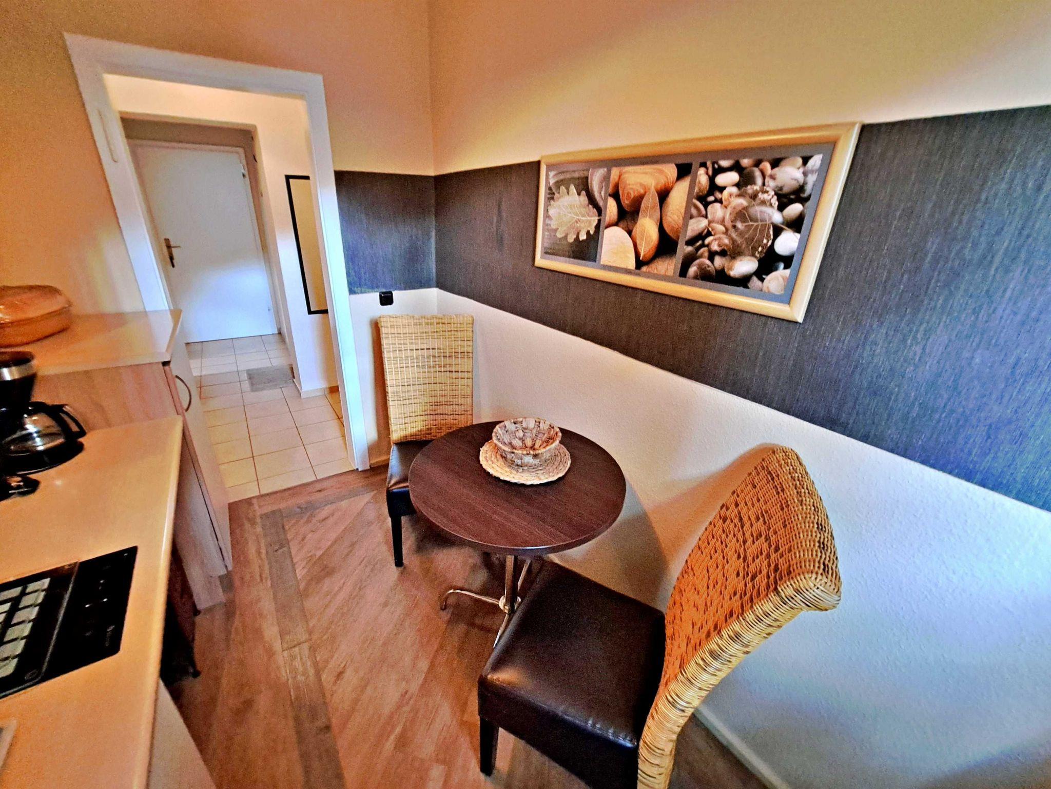 Herzlich willkommen in unserer charmanten 60 qm großen Ferienwohnung im Erdgeschoss! Hier erwartet Sie ein einladendes Wohnzimmer, das mit einer bequemen Sofa-Landschaft (Aufbettung für 1 Person) und Flachbild-TV ausgestattet ist - ideal für entspannte Stunden. Für gesellige Mahlzeiten steht Ihnen ein Esstisch mit vier Stühlen zur Verfügung. Das separate Schlafzimmer lädt mit einem gemütlichen Doppelbett zum Träumen ein. In der praktischen Pantryküche finden Sie alles, was Sie für die Zubereitung kleiner Gerichte benötigen, darunter ein 2-Platten-Ceranherd, Kühlschrank und ein kleiner Backofen. Das Tageslicht-Bad mit Dusche und WC sowie einem Fön rundet das Angebot ab und sorgt für zusätzlichen Komfort. Für Ihre Unterhaltung und Verbindung zur Außenwelt steht Ihnen unser kostenloses W-LAN während Ihres gesamten Aufenthalts zur Verfügung. Ihr Auto findet direkt am Haus einen sicheren Parkplatz.