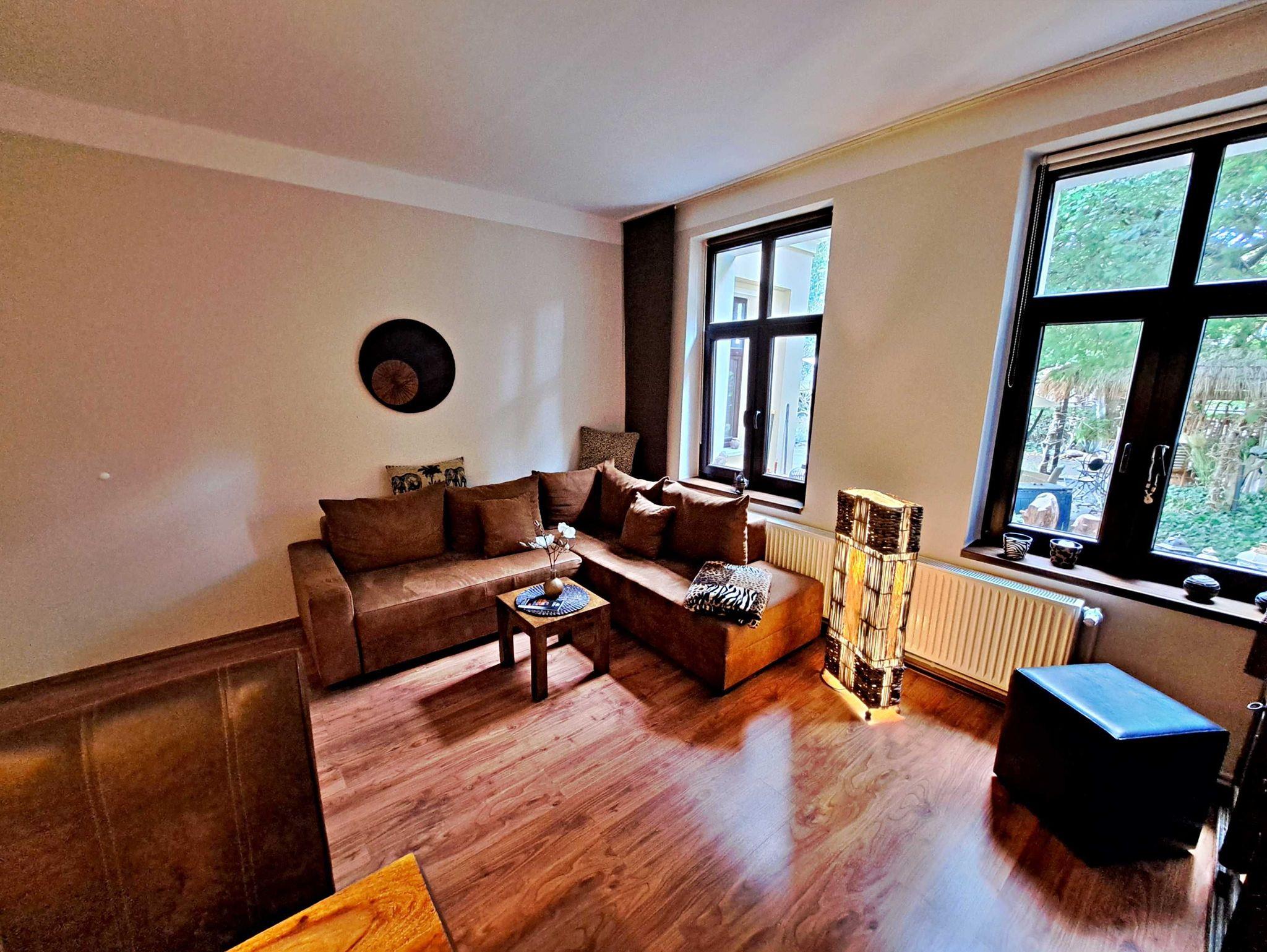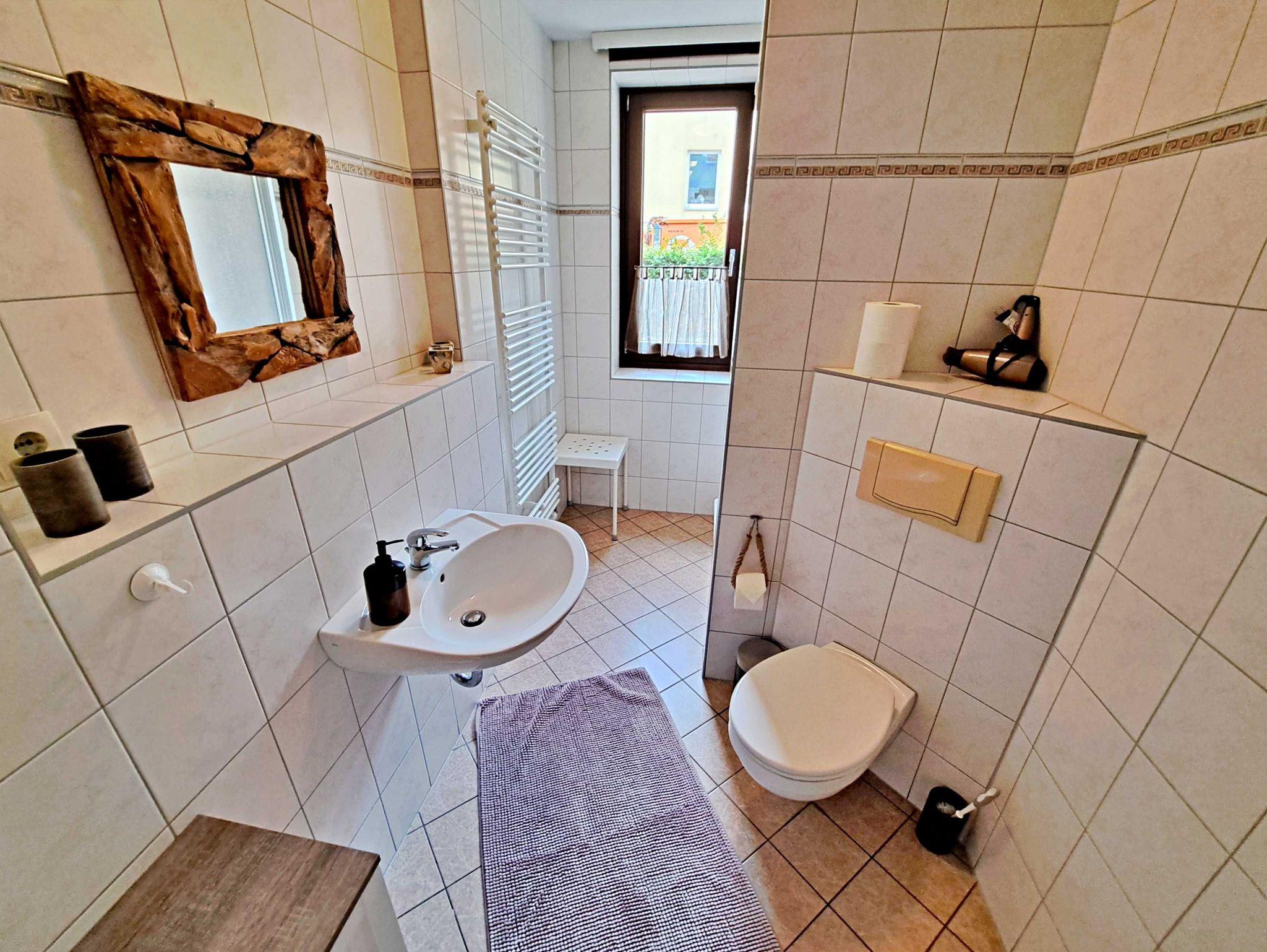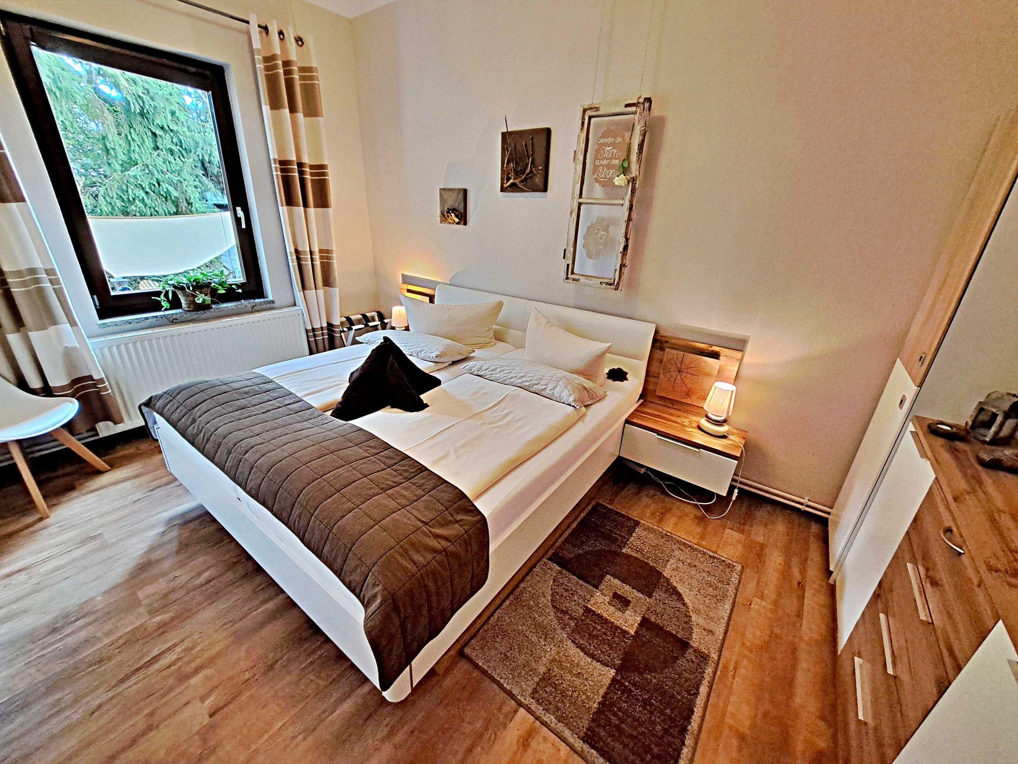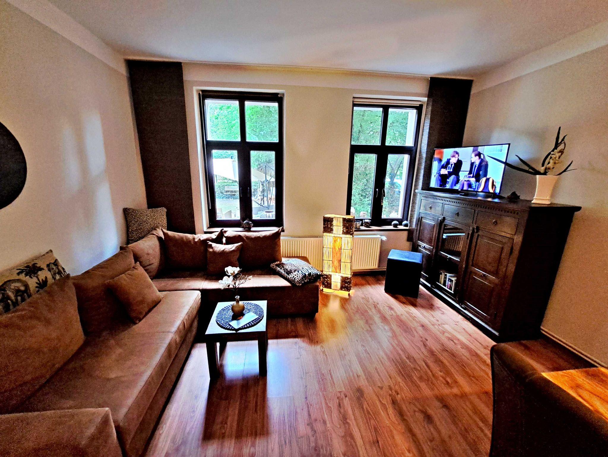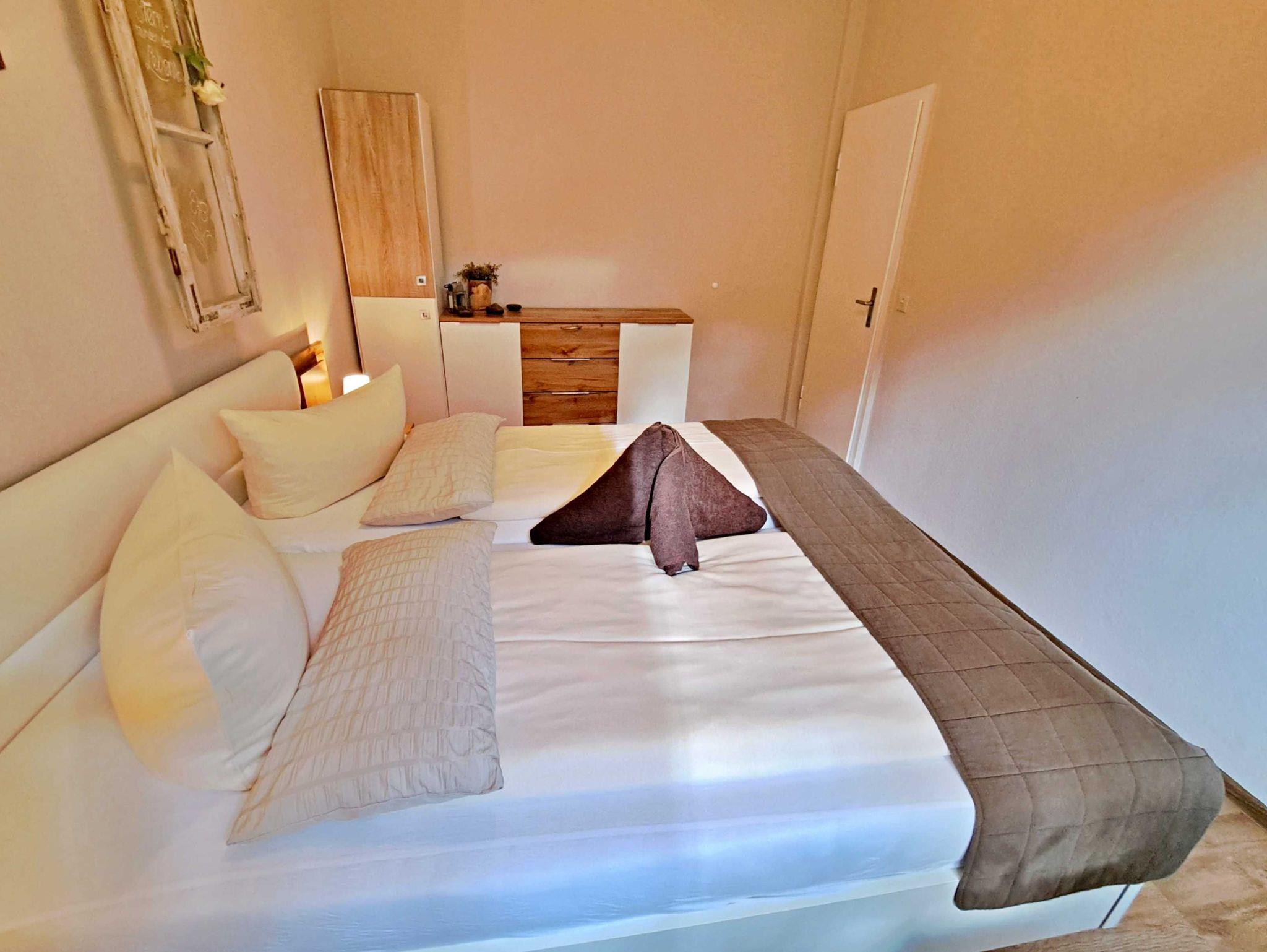 Herzlich willkommen in unserer charmanten 60 qm großen Ferienwohnung im Erdgeschoss! Hier erwartet Sie ein einladendes Wohnzimmer, das mit einer bequemen Sofa-Landschaft (Aufbettung für 1 Person) und Flachbild-TV ausgestattet ist - ideal für entspannte Stunden. Für gesellige Mahlzeiten steht Ihnen ein Esstisch mit vier Stühlen zur Verfügung. Das separate Schlafzimmer lädt mit einem gemütlichen Doppelbett zum Träumen ein. In der praktischen Pantryküche finden Sie alles, was Sie für die Zubereitung kleiner Gerichte benötigen, darunter ein 2-Platten-Ceranherd, Kühlschrank und ein kleiner Backofen. Das Tageslicht-Bad mit Dusche und WC sowie einem Fön rundet das Angebot ab und sorgt für zusätzlichen Komfort. Für Ihre Unterhaltung und Verbindung zur Außenwelt steht Ihnen unser kostenloses W-LAN während Ihres gesamten Aufenthalts zur Verfügung. Ihr Auto findet direkt am Haus einen sicheren Parkplatz.
