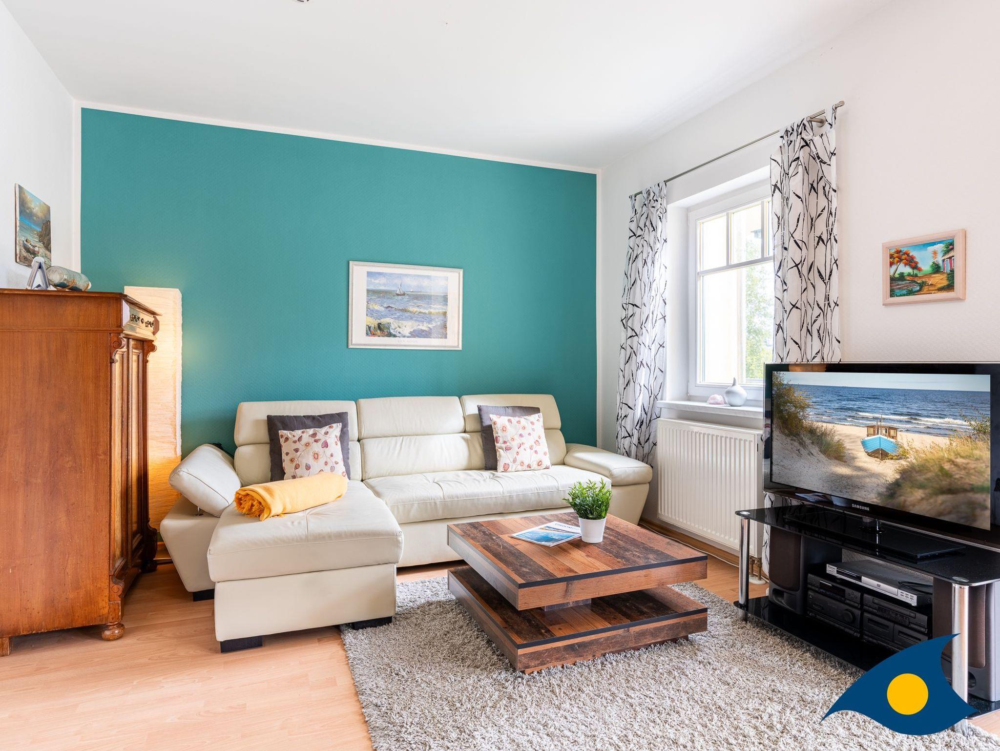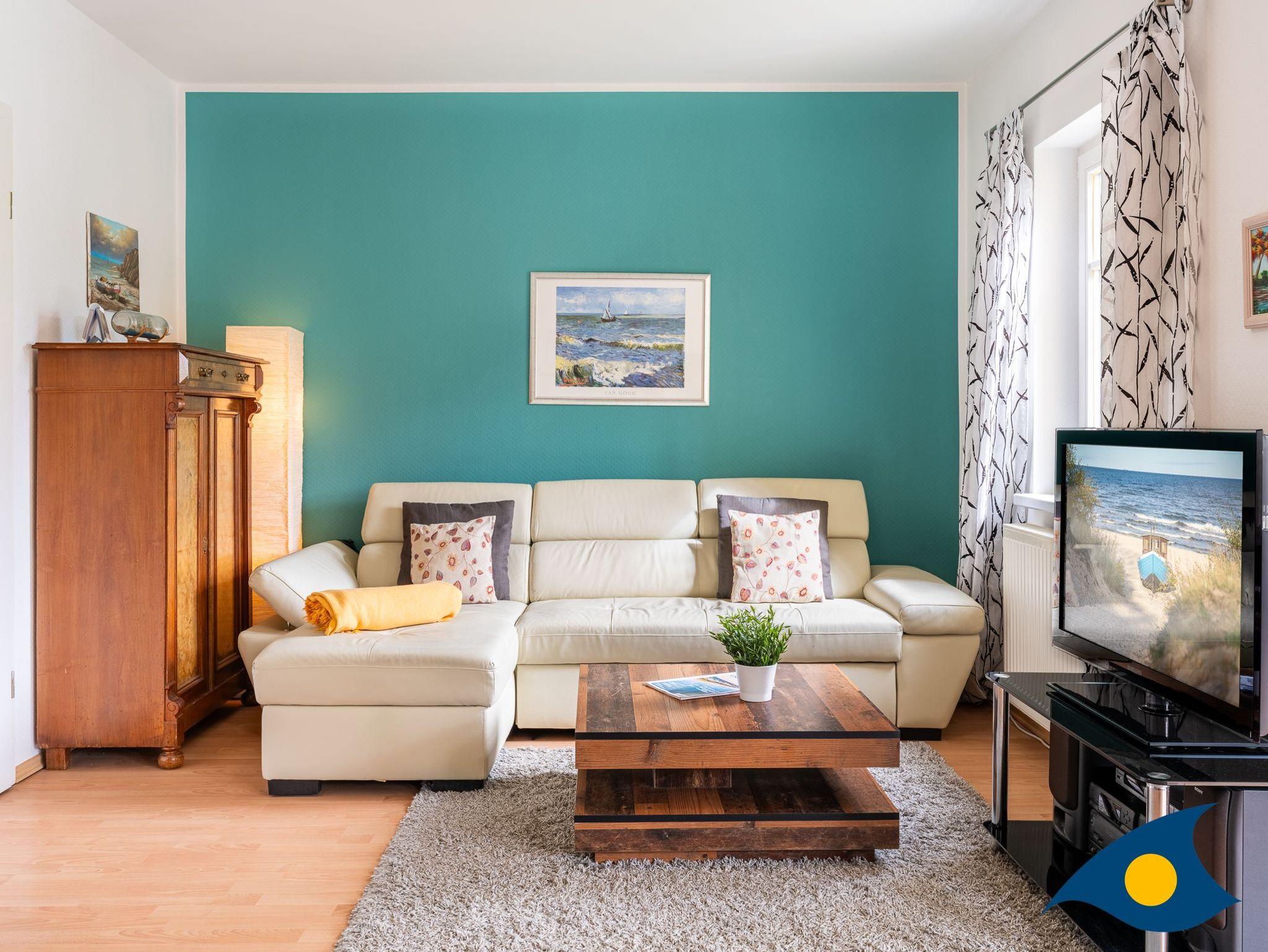 Das Sofa im Wohnzimmer kann gerne für Kinder bis 6 Jahre in diesem familienfreundlichen Appartement kostenfrei genutzt werden.