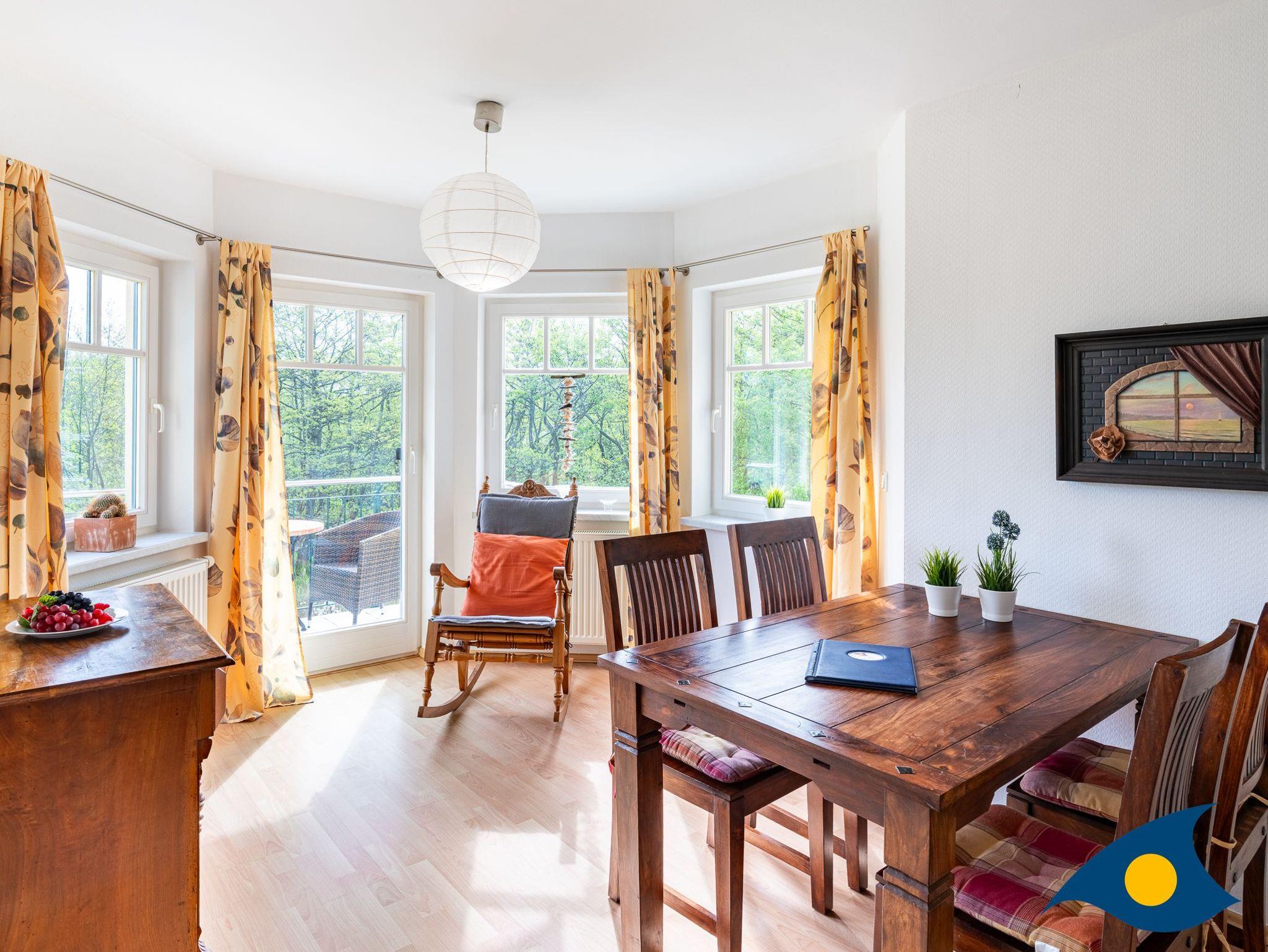 Der Glaserker lädt zum Entspannen in einem Schaukelstuhl ein und bietet Ihnen Zugang zum sonnigen Balkon. Von hier aus blicken Sie auf die Parkanlagen des naheliegenden Sees.