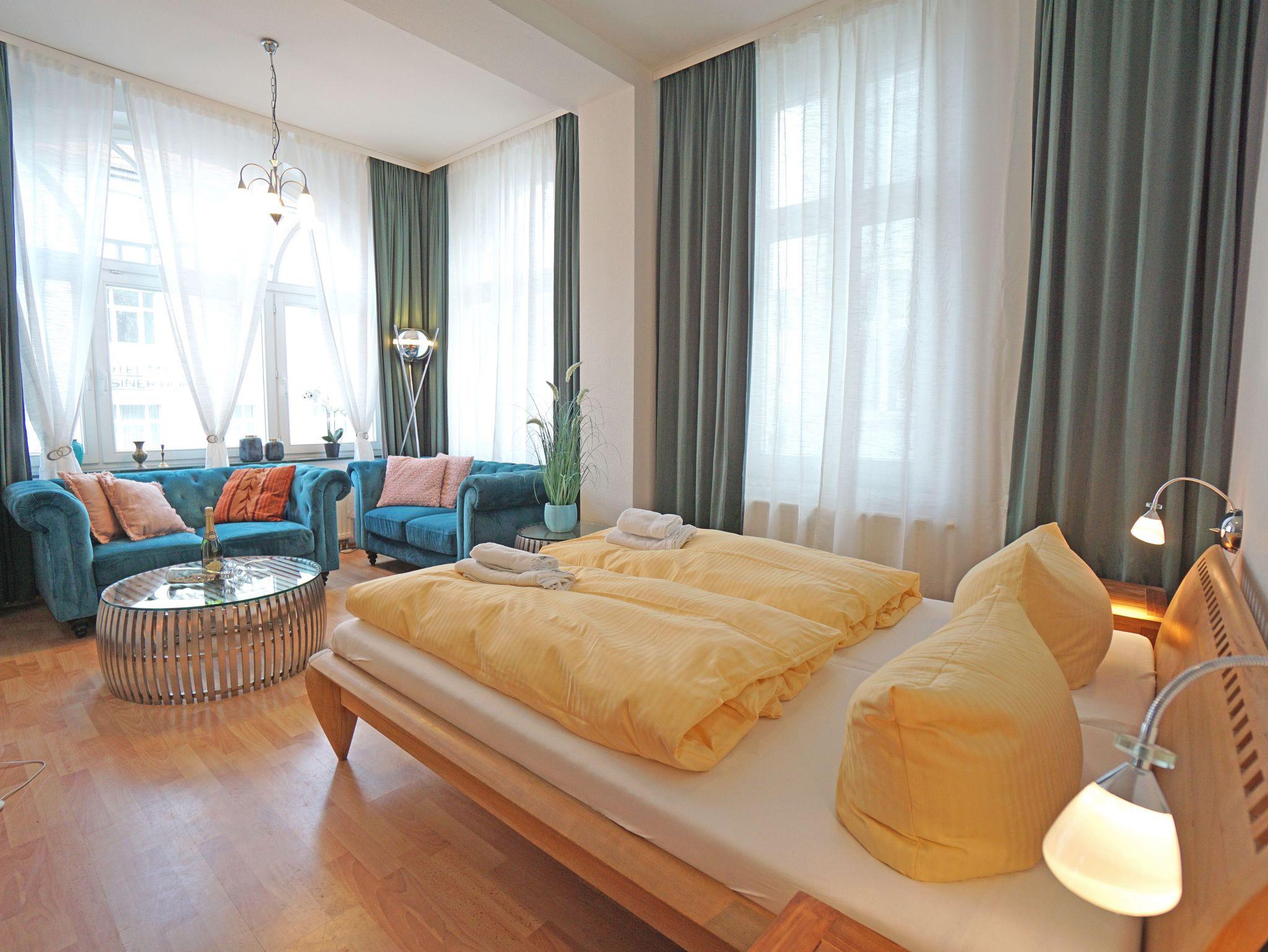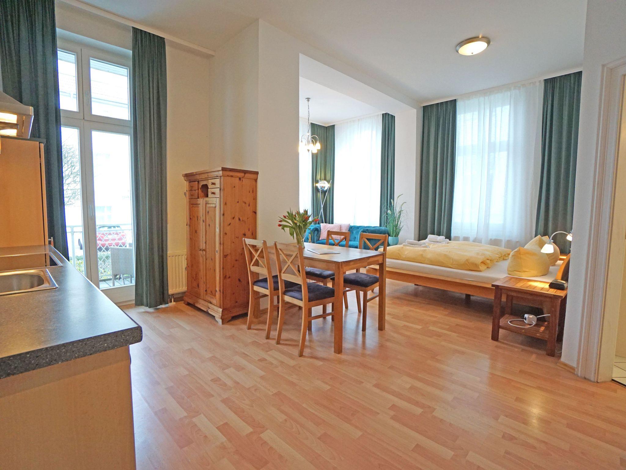 Vom kombinierten Wohn- Schlafbereich (Doppelbett 160x200 cm) gelangt man auf den Balkon und ins Badezimmer (Duschbad).