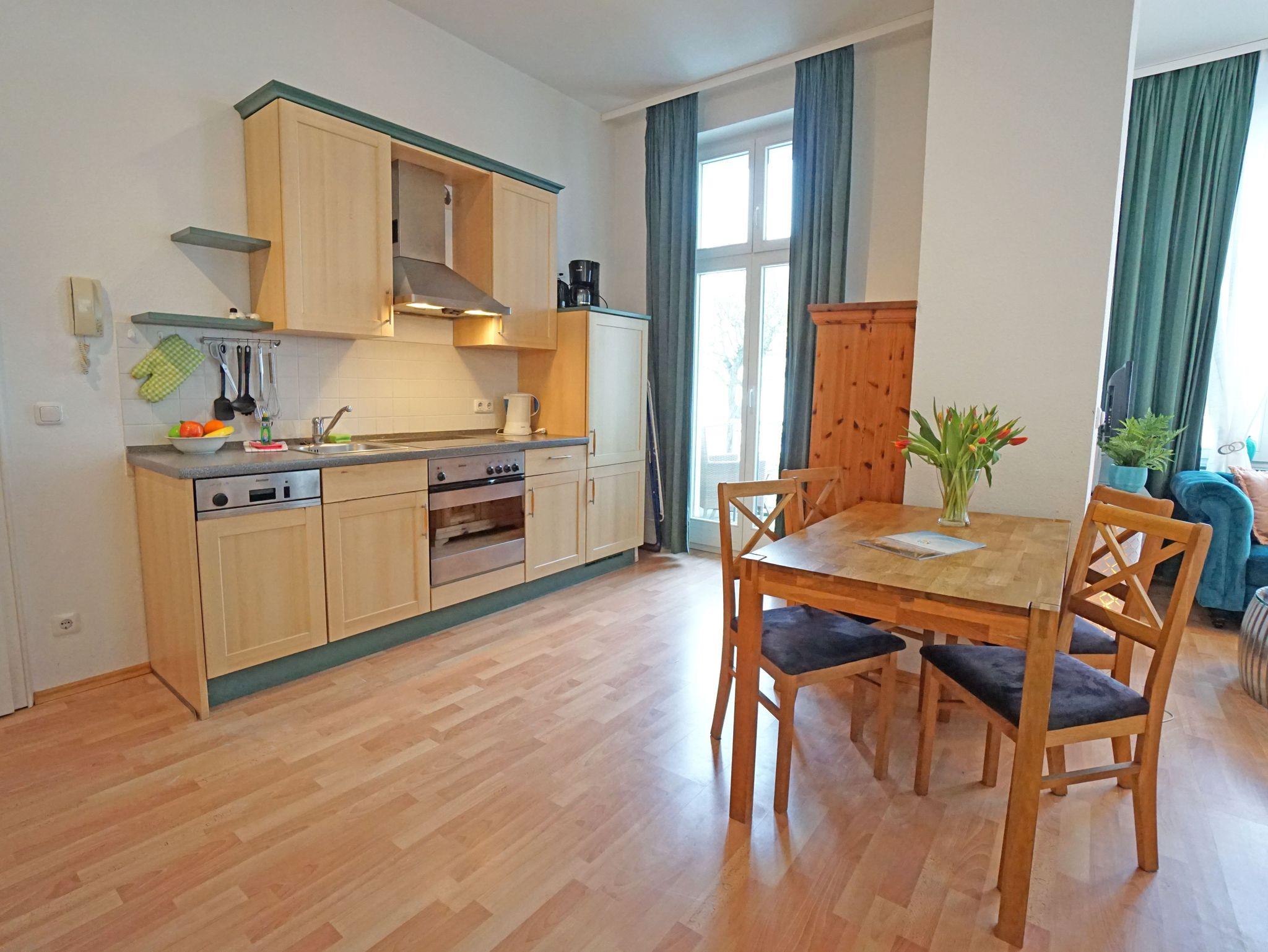 Die Küchenzeile ist mit einem Kühlschrank, einem Backofen und einem Geschirrspüler ausgestattet. Kaffeemaschine, Wasserkocher und Toaster sind vorhanden.