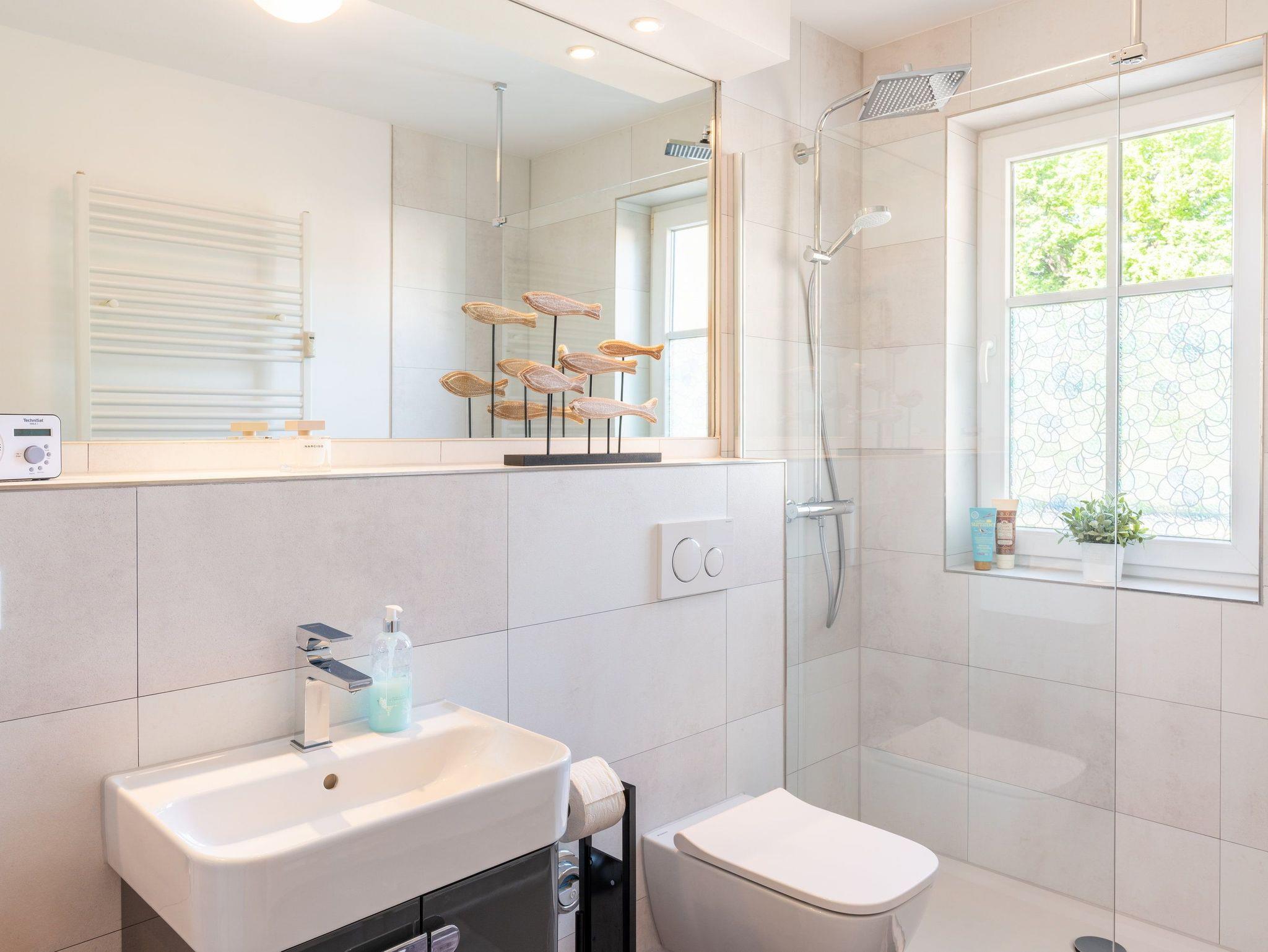 Damit Sie Ihre wohlverdiente Urlaubszeit bereits am Anreisetag in vollen Zügen genießen können, haben wir das Bett für Sie und das für Ihre lieben Mitreisenden bereits bezogen und ein Duschtuch sowie ein kleines Handtuch bereitgelegt. Das Bad unterstreicht die Annehmlichkeiten dieses Appartements mit XXL-Dusche, WC und Haarfön.