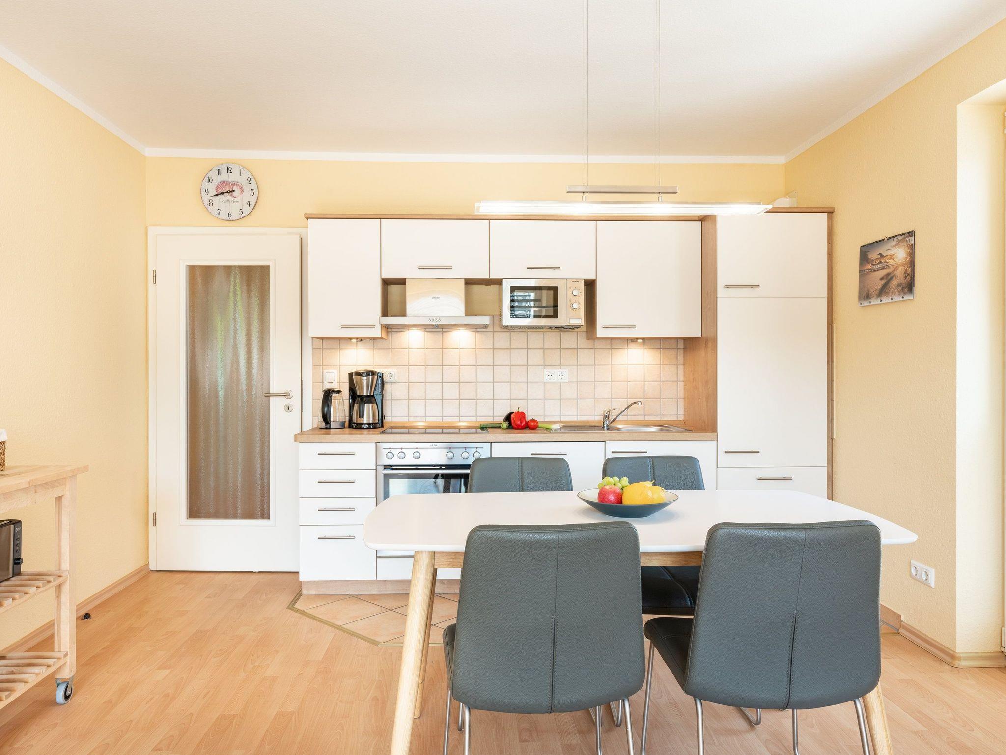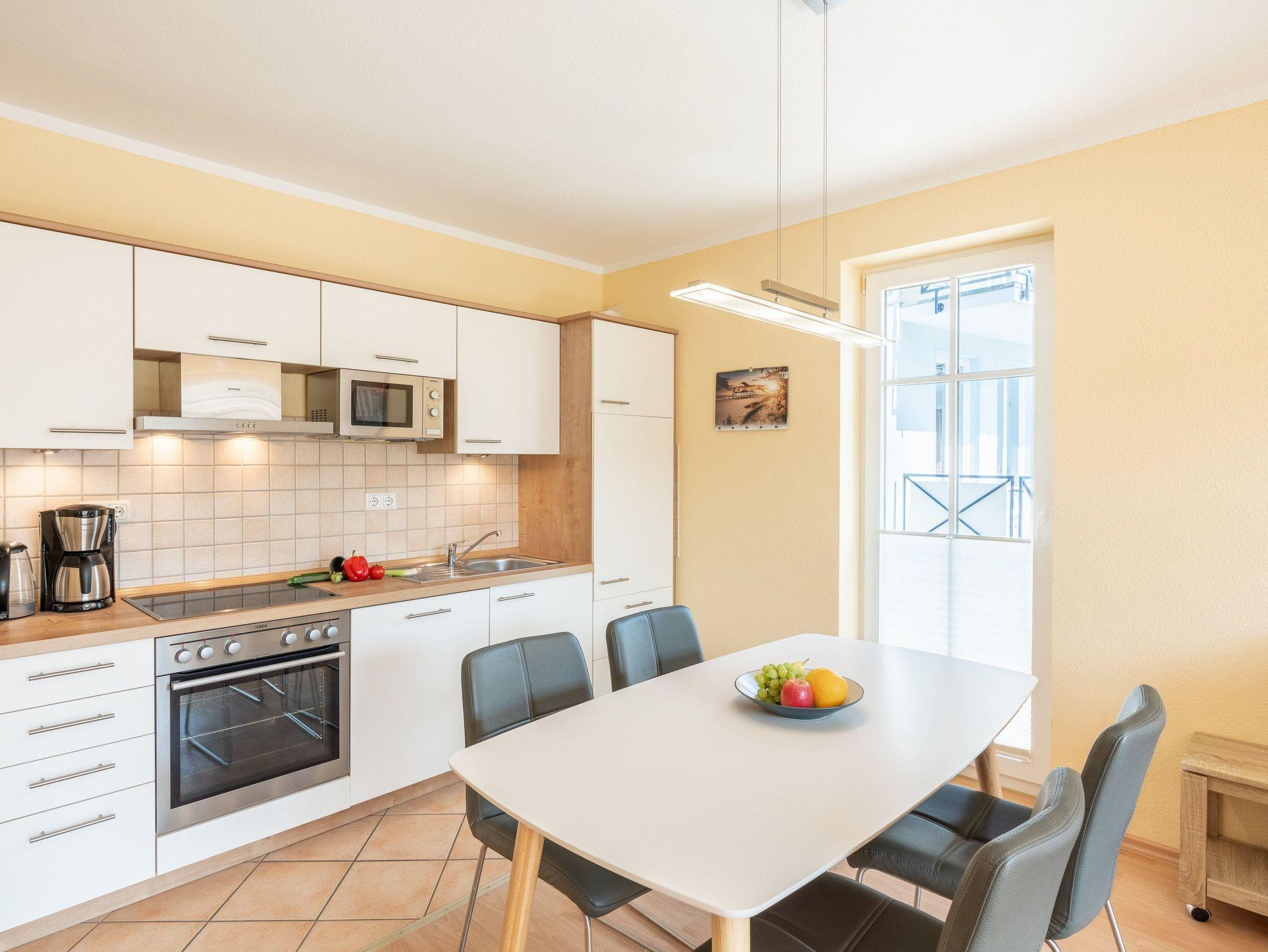 Auch im 2. Domizil unserer Residenz erwartet unsere Gäste ein modern eingerichtetes Urlaubsquartier im schönen Seebad Bansin. In unserem 3-Raum-Appartement Nr. 30 im 1. Obergeschoss können bis zu 4 Personen auf 62 Quadratmetern gemeinsam ihren Urlaub verbringen. Ein bequemes Sofa, Flat TV sowie ein Esstisch für vier Personen laden zum Entspannen und geselligem Beisammensein im gemütlichen Wohn- und Essbereich ein. Die integrierte Küchenzeile lässt Dank Geschirrspüler, Kühlschrank mit Gefrierfach, Backofen, Mikrowelle, Wasserkocher, Toaster, Kaffeemaschine und vielen Extras keine Wünsche offen.