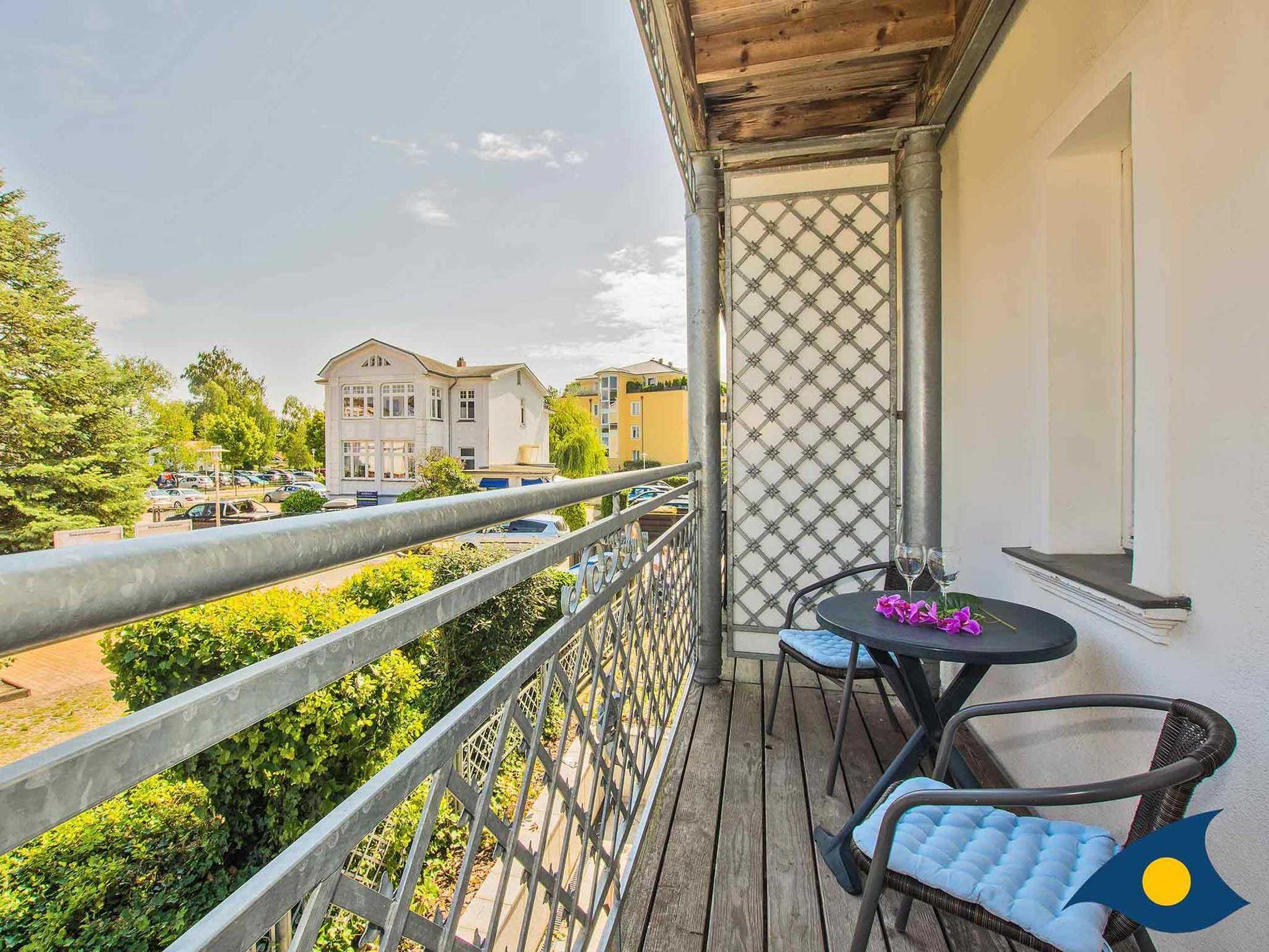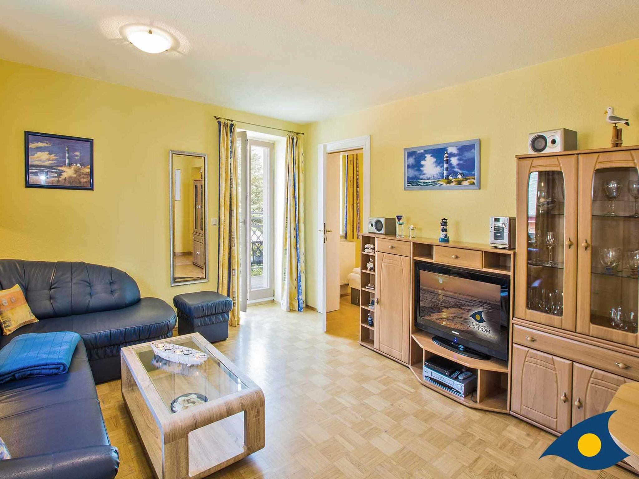 Das Wohnzimmer beherbergt neben der Küchenzeile samt Esstisch eine bequeme Sofalandschaft. Hier genießen Sie das morgendliche Frühstück, gemütliche Fernsehabende zu zweit und den Ausblick von dem angrenzenden Balkon über die Dächer von Bansin.