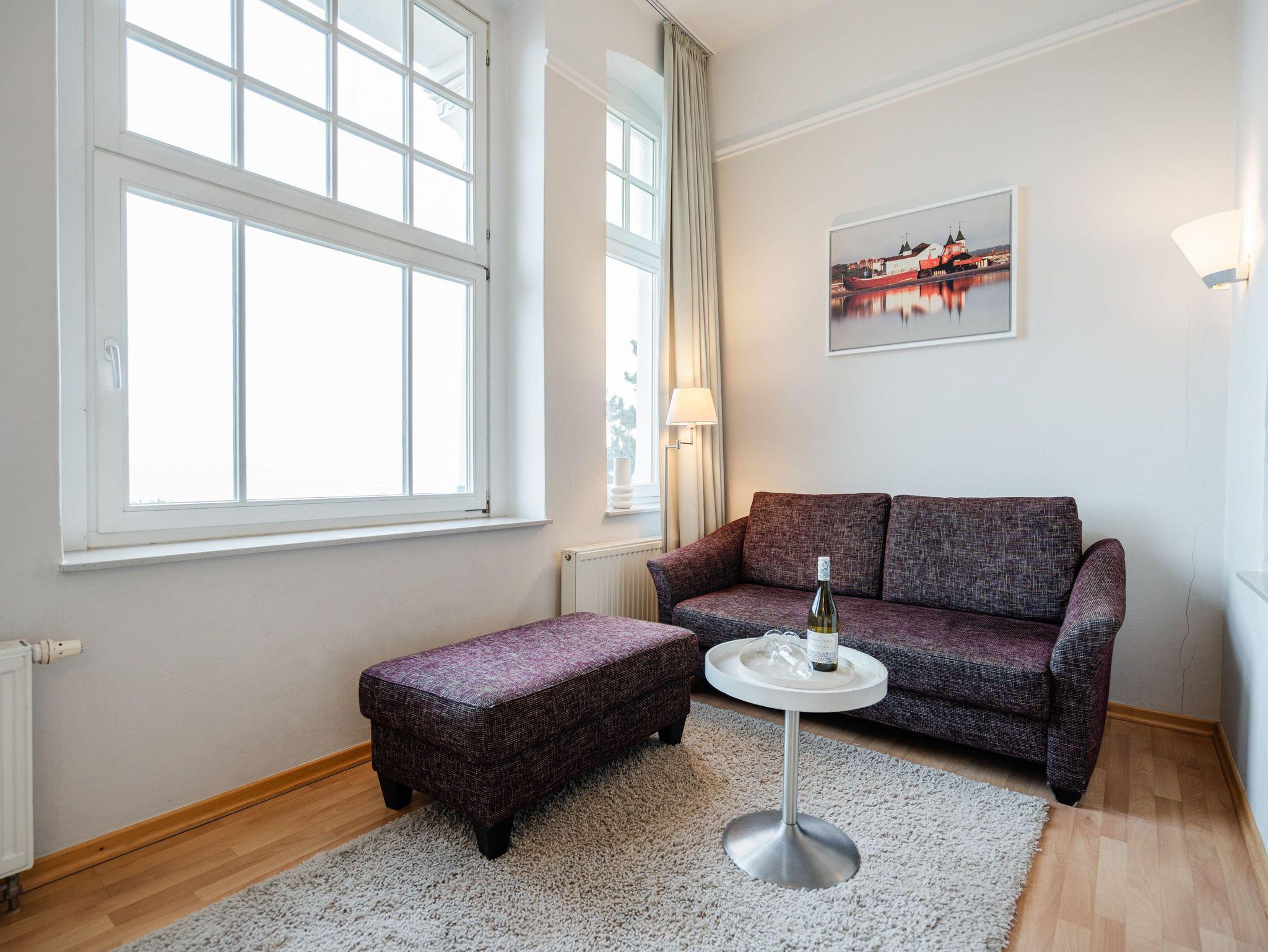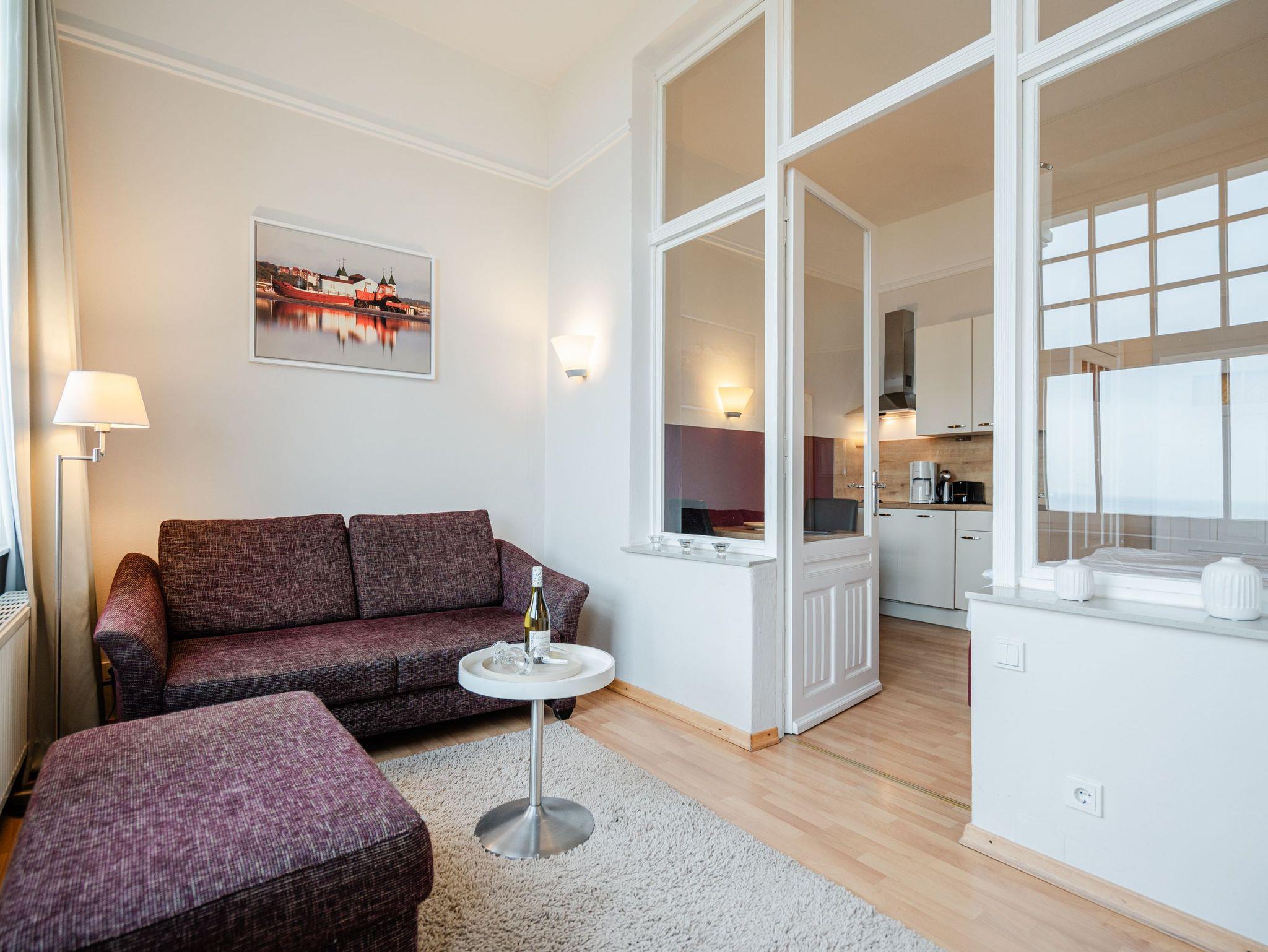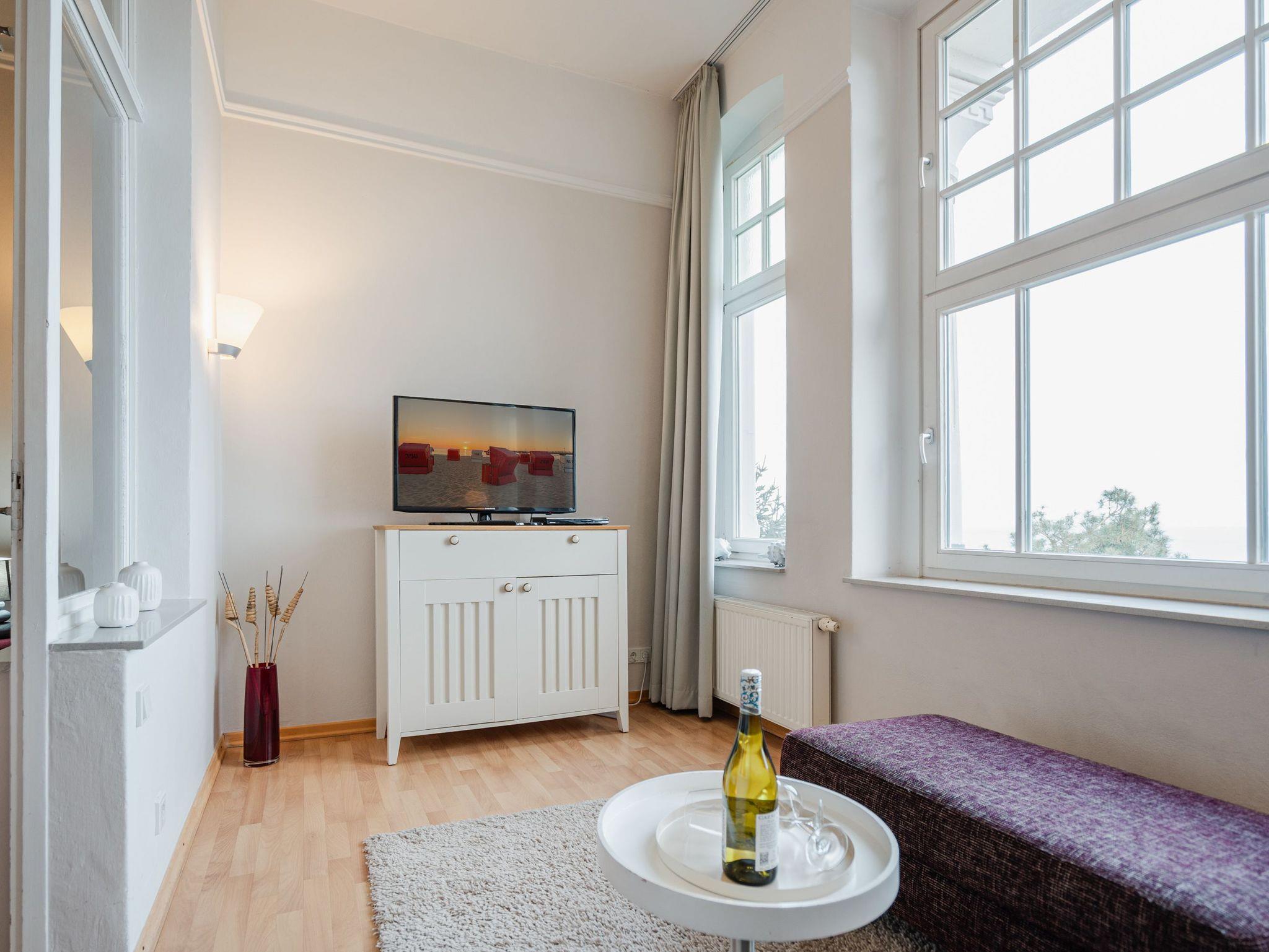 Panorama mit Meerblick! Die Ferienwohnung 8 begrüßt Sie im 2. Obergeschoss der Villa Dora und besticht neben seinem traumhaften Blick auf die Ostsee, auch mit seiner modernen und sehr geschmackvollen Einrichtung. Das gemütliche Einraumdomizil ist ideal für zwei Personen (zusätzlich Kleinkind bis 3 Jahre im Babyreisebett möglich). Sie finden hier auf 35 qm einen Schlafbereich mit bequemen Boxspringbett (1,80m x 2,00m). Die vorgelagerte Veranda ist als Wohnbereich mit Sitzgruppe und Flat-TV gestaltet. Lassen Sie die Seele baumeln beim Blick auf das Meer! Zusätzlich ist das Appartement mit einer Küchenzeile (2 Platten-Cerankochfeld und Geschirrspüler) ausgestattet. Das Bad mit Dusche und WC ergänzt dieses Appartement. Für Ihren Komfort sind die Betten bei der Anreise bezogen und Handtücher liegen bereit. Für Ihren PKW steht Ihnen ein Parkplatz vor dem Haus zur Verfügung.