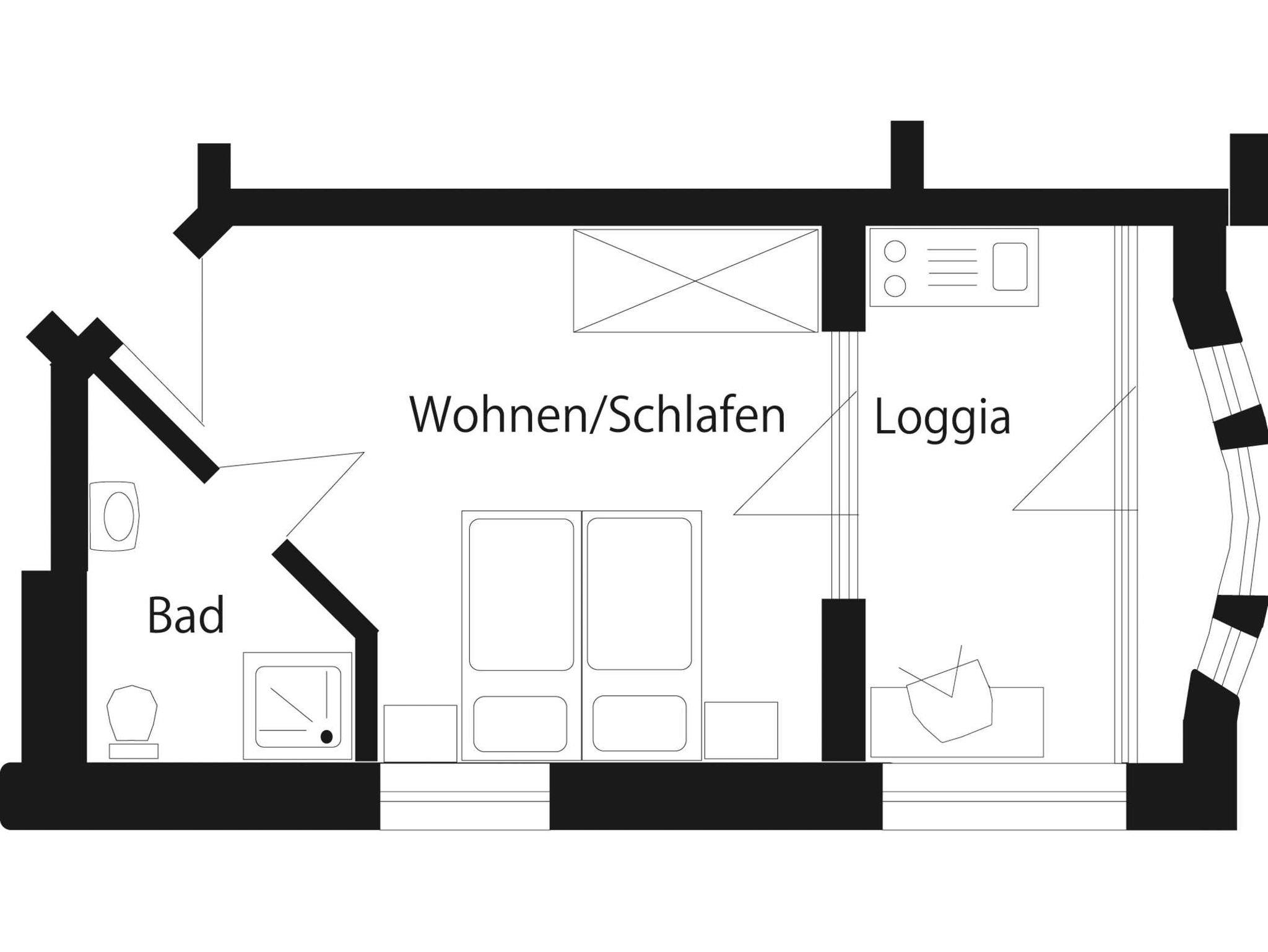 Für 1-2 Personen, 26 qm, Mini-Küche, DU/WC, 1./2. OG mit Meerblick und Loggia, teilweise Balkon.