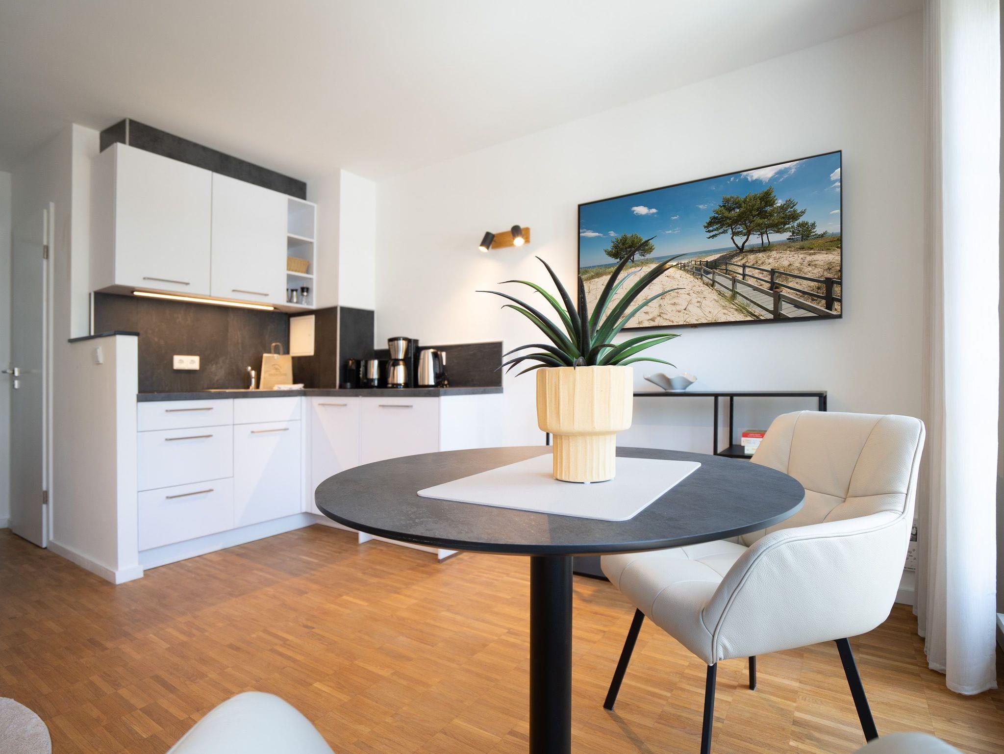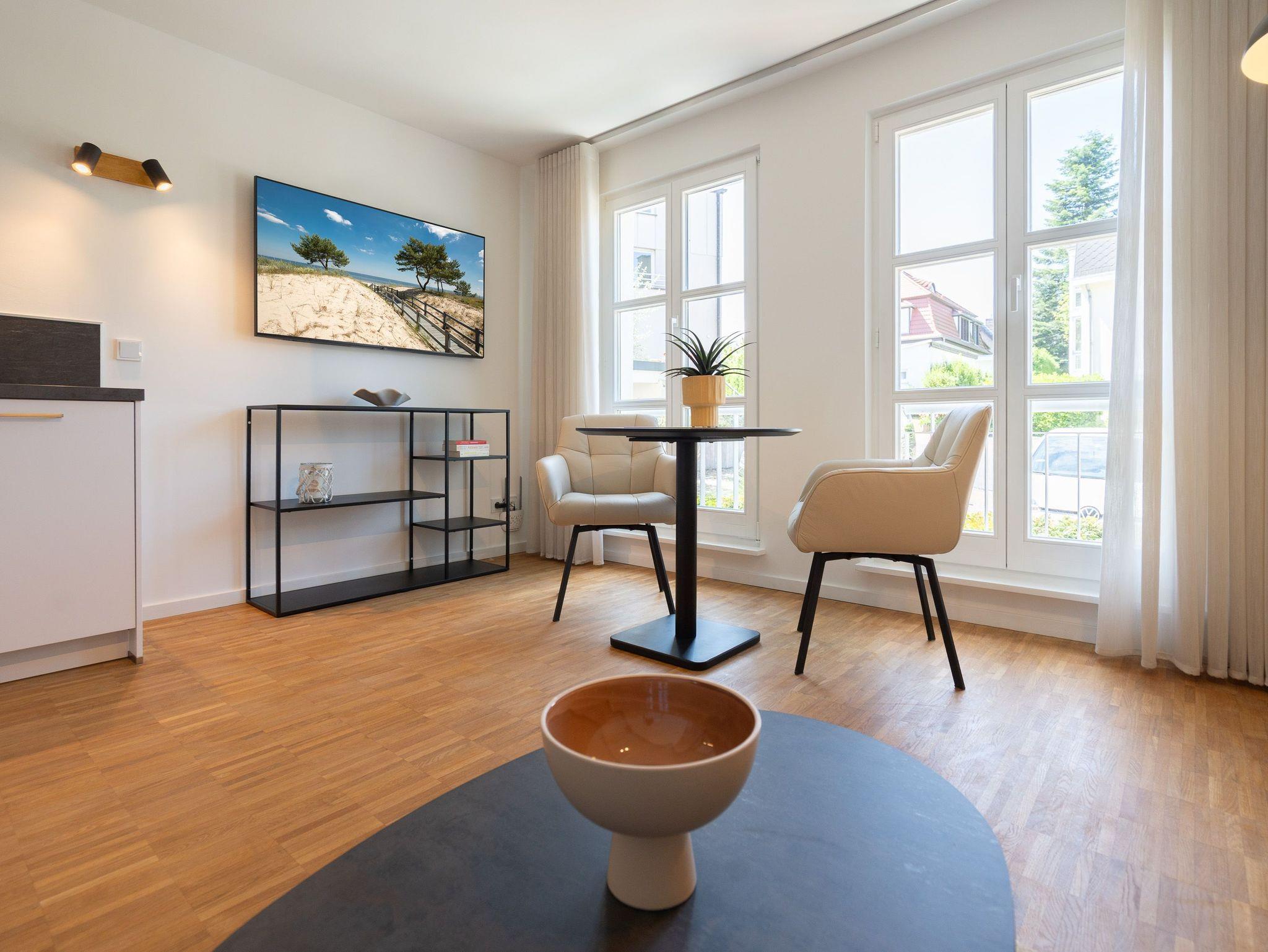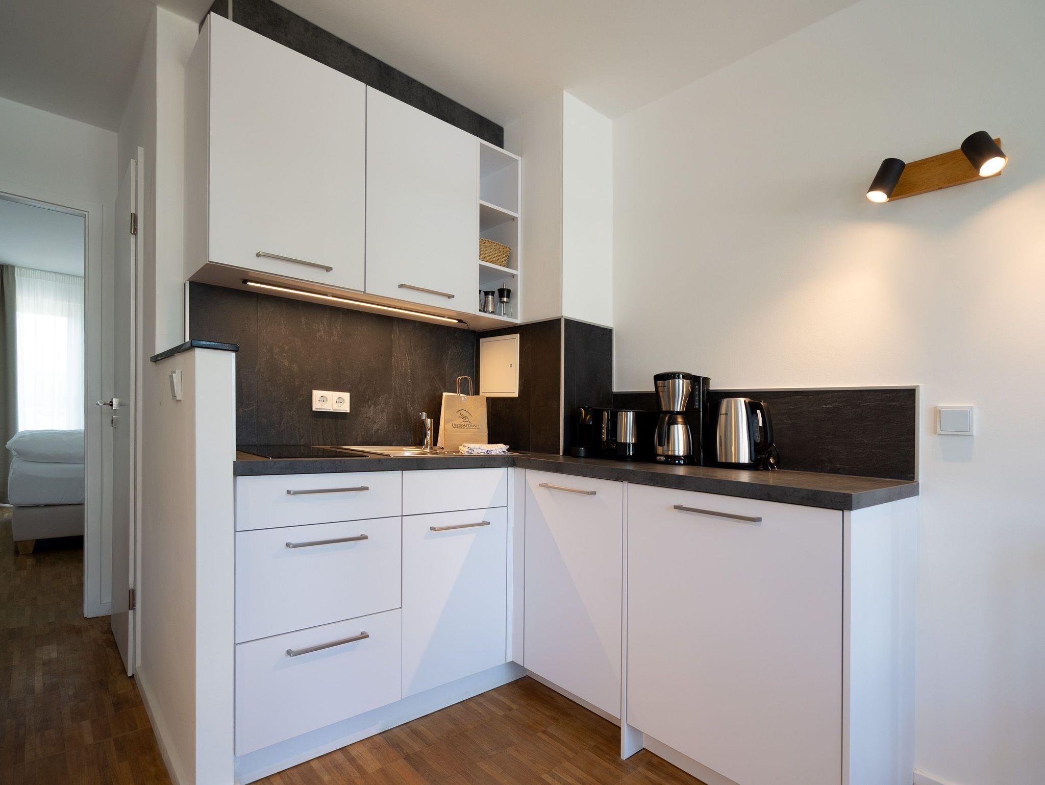 Gemütliches 2-Raum-Appartement mit Balkon ? Ihre stilvolle Auszeit zu zweit. Dieses liebevoll eingerichtete 2-Raum-Appartement im Hochparterre bietet auf 33?m² alles, was Sie für einen komfortablen Aufenthalt zu zweit benötigen ? hell, durchdacht und rundum einladend. Im offenen Wohnbereich erwartet Sie eine moderne Küchenecke mit 2-Platten-Cerankochfeld, Spülmaschine, Kühlschrank mit Gefrierfach und Nespresso-Kapselmaschine ? perfekt für die kleine Auszeit mit frischem Kaffee oder einem gemütlichen Frühstück am Esstisch für zwei. Ein bequemes Sofa und ein 55-Zoll-Flat-TV laden zu entspannten Stunden ein ? ob bei einem Filmabend oder einfach zum Abschalten nach einem aktiven Urlaubstag. Das separate Schlafzimmer ist mit einem komfortablen Boxspringbett (1,80?m x 2,00?m) ausgestattet. Von hier aus gelangen Sie direkt auf den sonnigen Süd-Ost-Balkon (ca. 5?m²) ? ein idealer Ort für die erste Tasse Kaffee oder den ruhigen Tagesausklang. Ein geräumiger Kleiderschrank befindet sich im Flur und bietet ausreichend Platz für Ihre Urlaubsgarderobe. Ein kleines, funktionales Bad mit Dusche ( 85 cm x 70 cm), Waschtisch und WC rundet das Wohlfühlangebot ab. Für Ihren PKW steht der Stellplatz Nr.?3 direkt vor dem Haus zur Verfügung. Natürlich ist kostenfreies WLAN inklusive. Ein stilvoller Rückzugsort für alle, die Ruhe, Komfort und gute Ausstattung schätzen.