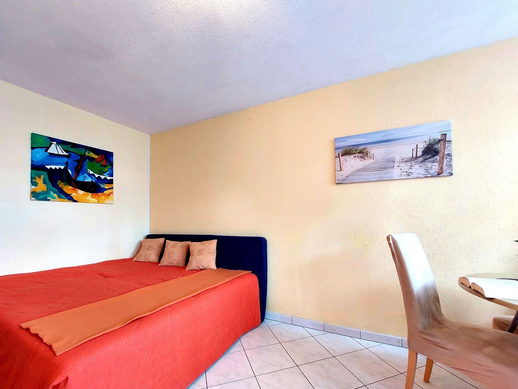 1-Zimmer-Wohnung 25 m², im Erdgeschoss. Zweckmässig eingerichtet: Wohn-/Schlafzimmer mit Doppelbett, Esstisch, Sat-TV und Radio. Ausgang zur Terrasse. Küche (Backofen, Geschirrspüler, 4 Glaskeramikherd Platten, Toaster, Wasserkocher, Mikrowelle, Tiefkühler, elektrische Kaffeemaschine). Dusche/WC. Fussbodenheizung. Zur Verfügung: Internet (Wireless LAN, gratis). Parkplatz (1 Auto) in 25 m. Bitte beachten: Rauchmelder.
