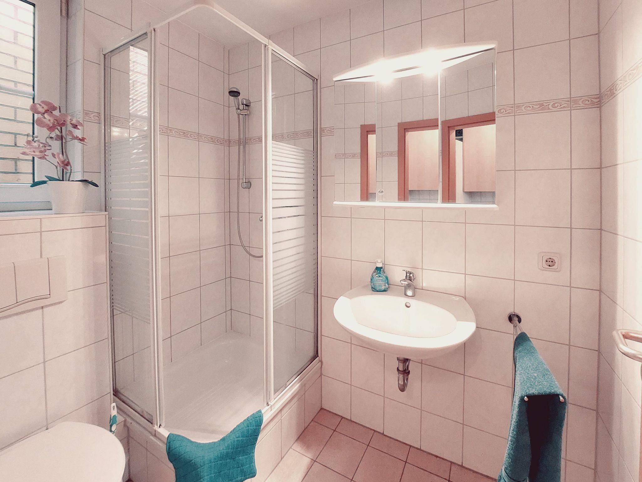 Das Bad verfügt über Dusche und WC. An kühleren Tagen sorgt eine Fußbodenheizung für angenehme Wärme.