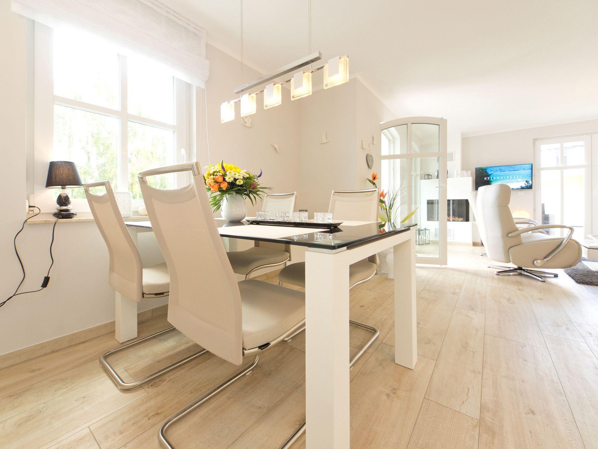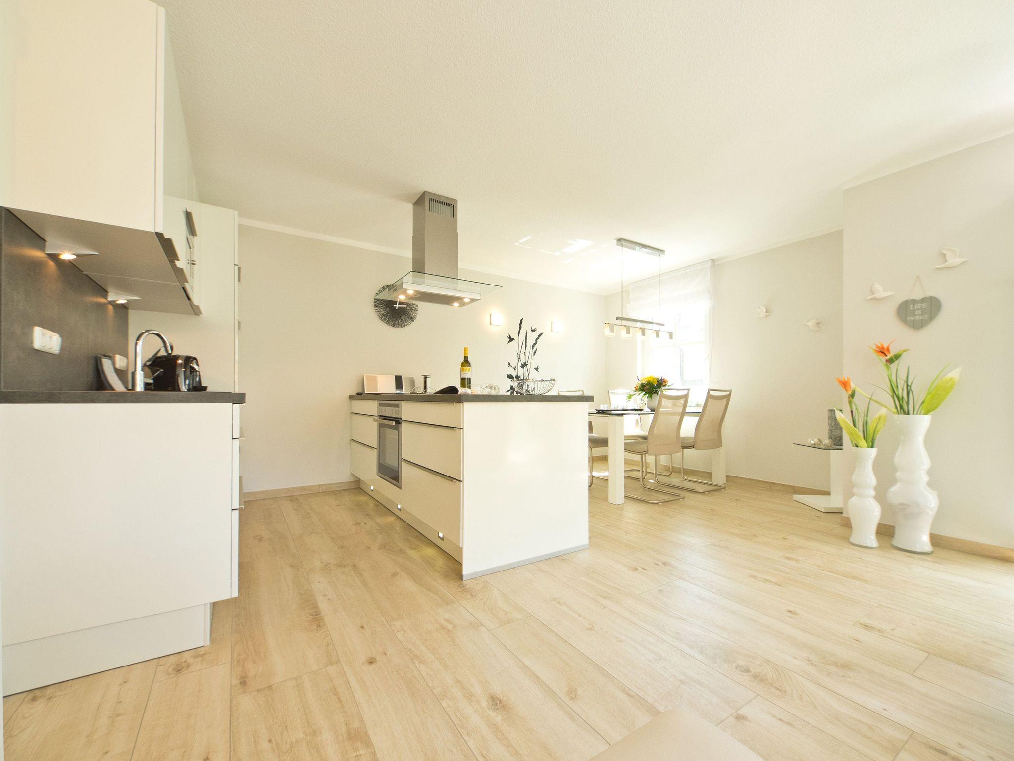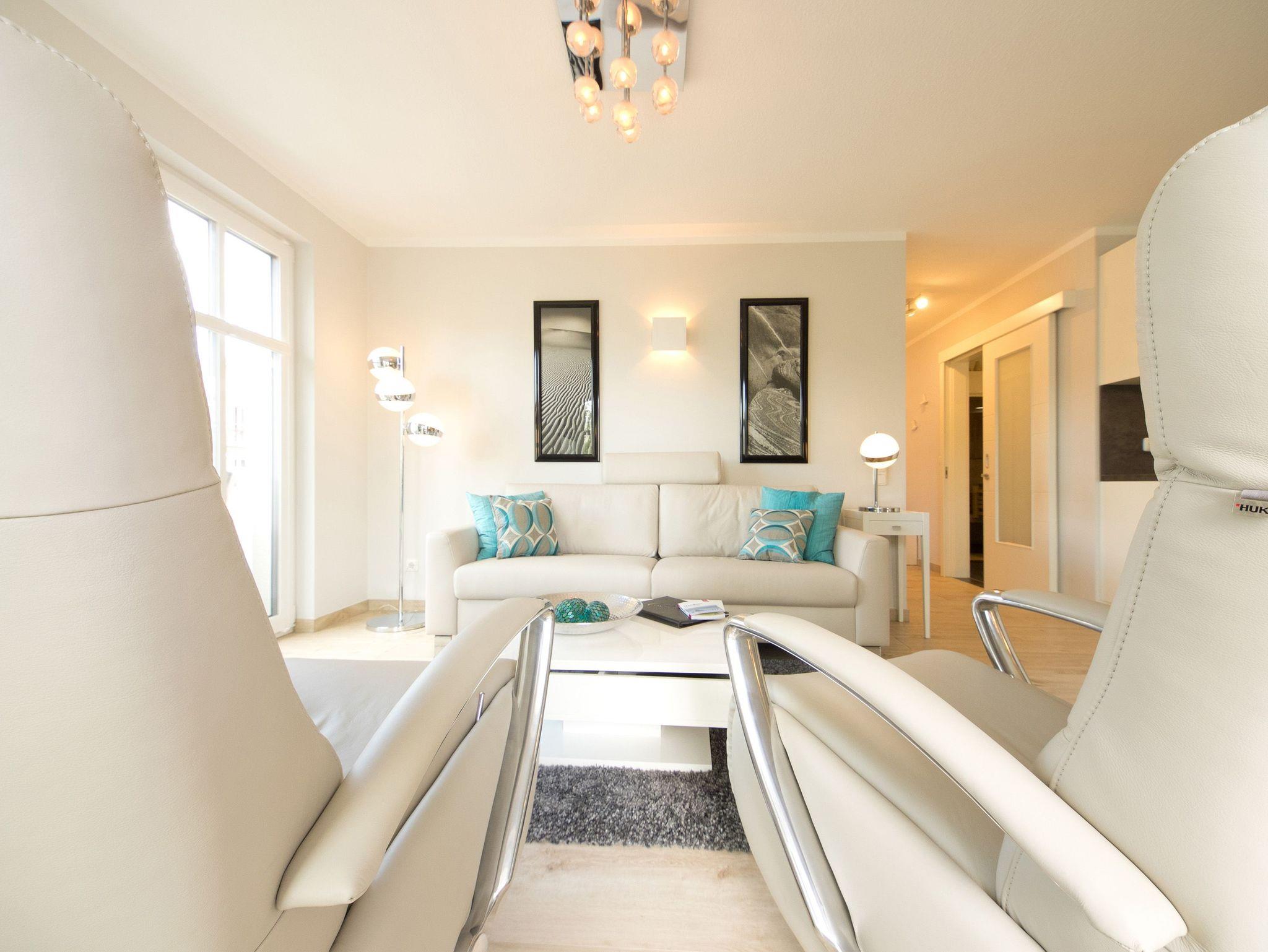 Willkommen in der Ferienwohnung 3.2! Unser wunderschön designtes Domizil wird Sie überzeugen, schon beim Eintreten begeistern Helligkeit, Großzügigkeit und die schöne, wertige Gestaltung. Das 3-Raum-Appartement (75 qm) im 2. Obergeschoss bietet bis zu 4 Personen Platz zum Wohlfühlen. Der offen gestaltete Wohnbereich ist ausgestattet mit einer bequemen Ledersitzgruppe, Flat TV , Blue Ray Player und Musikanlage mit Ipod Docking Station. Der moderne Gaskamin ist ganz einfach per Fernbedienung zu nutzen und verbreitet schnell eine wohlige Gemütlichkeit. Die offene, komplett ausgestattete Küche mit Kochinsel und angrenzendem Essplatz schließt sich hier an. 2 Schlafzimmer mit hochwertigen Boxspringbetten (1,80 x 2,00m) und jeweils Flat TV sorgen für erholsame Nächte. Das Bad ist mit einer ebenerdigen Echtglasdusche, Regenwaldbrause und Doppelwaschtisch ausgestattet. Ein besonderes Highlight ist die Sauna, die hier ebenfalls integriert ist. Zusätzlich gibt es noch ein Gäste-WC. Besonders schön sind auch die 3 Balkone ( sonnige Süd- und Westseite), wovon einer als geschützte Loggia angelegt ist und auch bei schlechterem Wetter sehr gut genutzt werden kann. Für Ihren Komfort steht die Erstausstattung Wäsche für Sie bereit. Ein Pkw-Stellplatz befindet sich am Haus, für Fahrräder gibt es einen separaten Abstellraum. Das WLAN-Netz im Haus ist kostenfrei nutzbar.