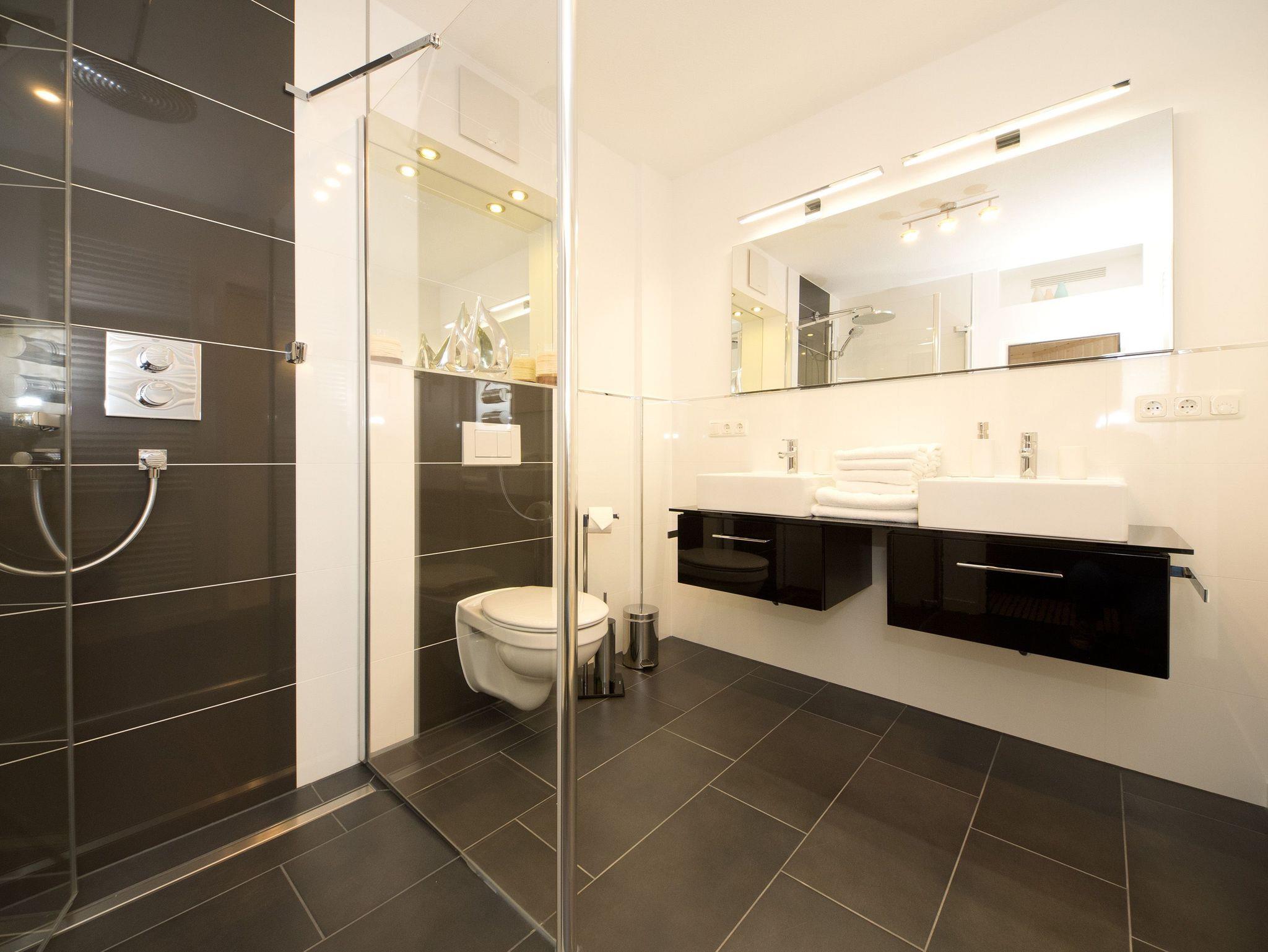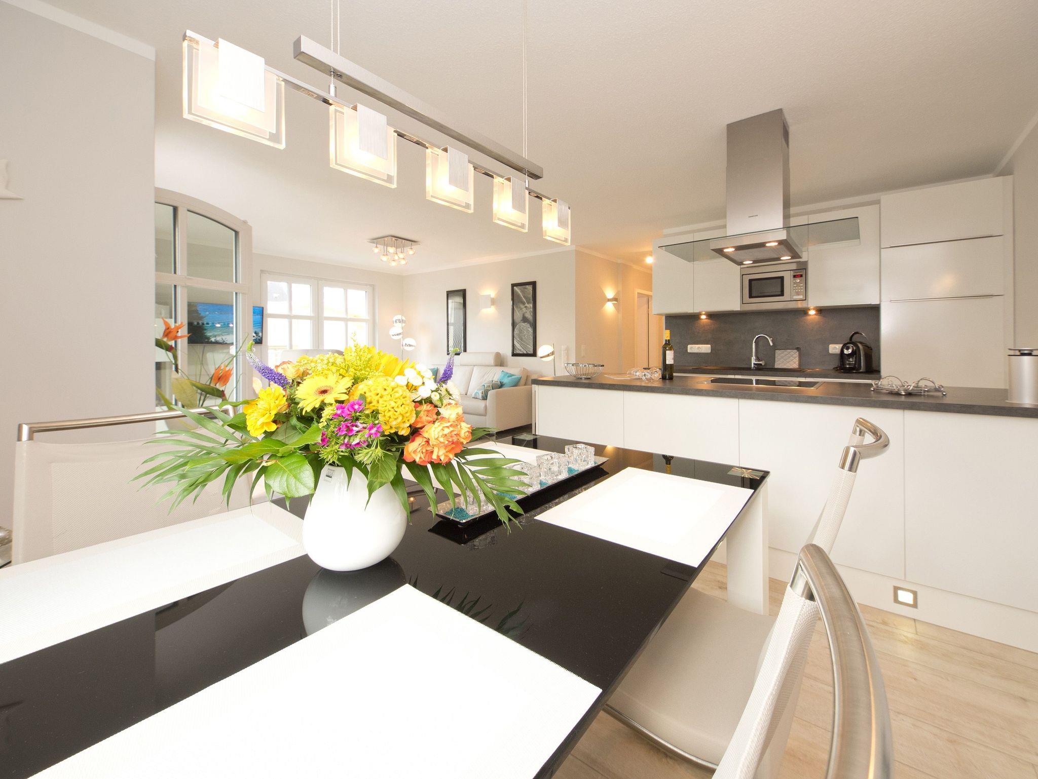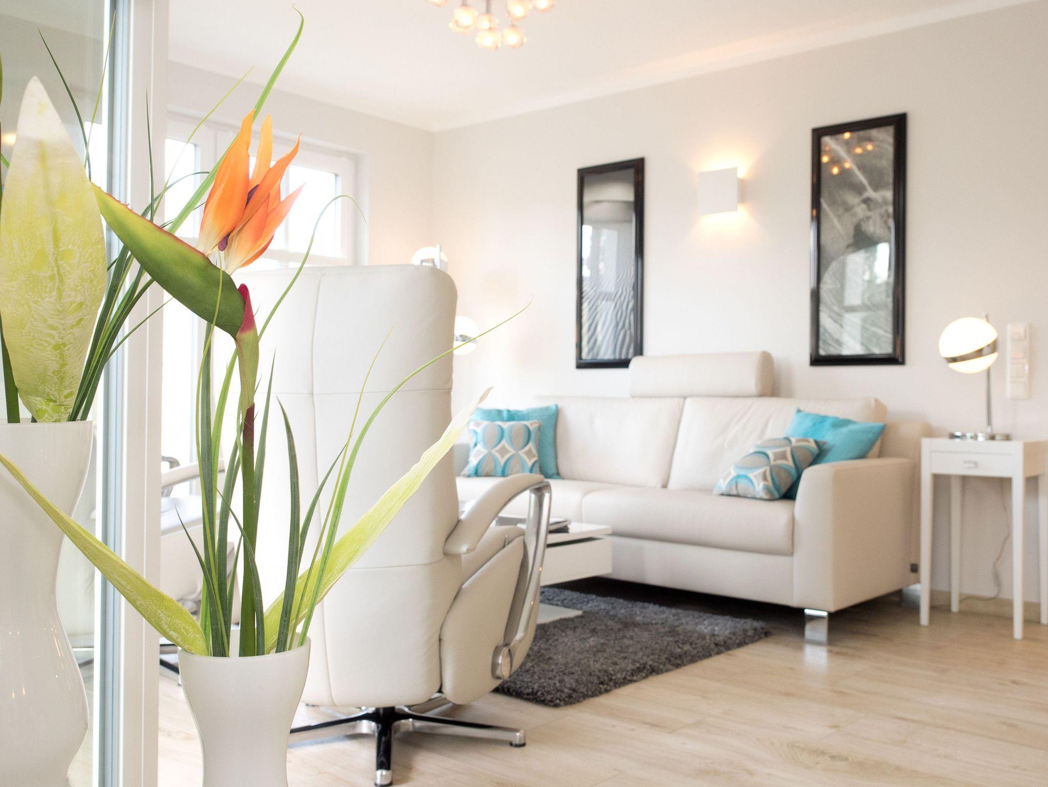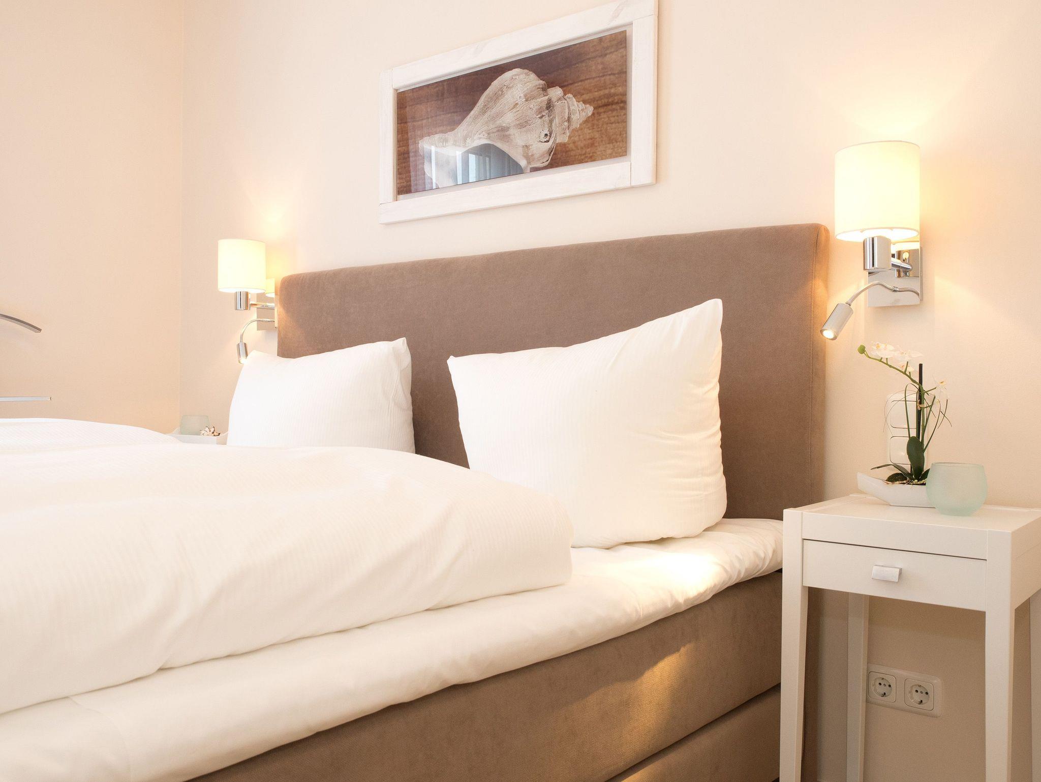 Willkommen in der Ferienwohnung 3.2! Unser wunderschön designtes Domizil wird Sie überzeugen, schon beim Eintreten begeistern Helligkeit, Großzügigkeit und die schöne, wertige Gestaltung. Das 3-Raum-Appartement (75 qm) im 2. Obergeschoss bietet bis zu 4 Personen Platz zum Wohlfühlen. Der offen gestaltete Wohnbereich ist ausgestattet mit einer bequemen Ledersitzgruppe, Flat TV , Blue Ray Player und Musikanlage mit Ipod Docking Station. Der moderne Gaskamin ist ganz einfach per Fernbedienung zu nutzen und verbreitet schnell eine wohlige Gemütlichkeit. Die offene, komplett ausgestattete Küche mit Kochinsel und angrenzendem Essplatz schließt sich hier an. 2 Schlafzimmer mit hochwertigen Boxspringbetten (1,80 x 2,00m) und jeweils Flat TV sorgen für erholsame Nächte. Das Bad ist mit einer ebenerdigen Echtglasdusche, Regenwaldbrause und Doppelwaschtisch ausgestattet. Ein besonderes Highlight ist die Sauna, die hier ebenfalls integriert ist. Zusätzlich gibt es noch ein Gäste-WC. Besonders schön sind auch die 3 Balkone ( sonnige Süd- und Westseite), wovon einer als geschützte Loggia angelegt ist und auch bei schlechterem Wetter sehr gut genutzt werden kann. Für Ihren Komfort steht die Erstausstattung Wäsche für Sie bereit. Ein Pkw-Stellplatz befindet sich am Haus, für Fahrräder gibt es einen separaten Abstellraum. Das WLAN-Netz im Haus ist kostenfrei nutzbar.