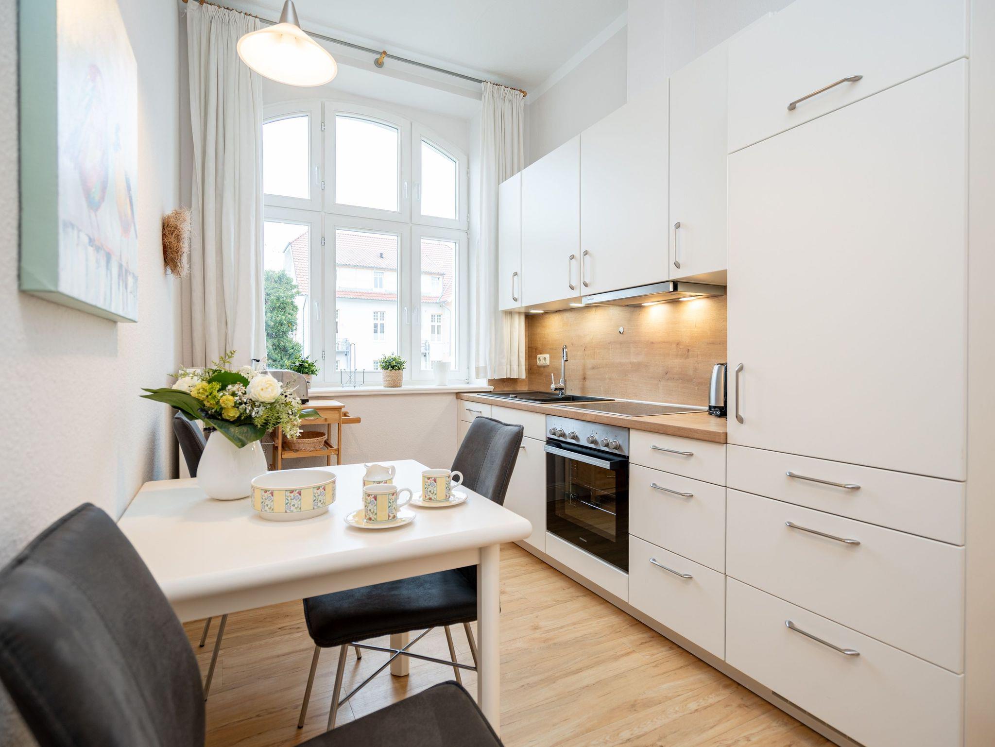 Die stilvoll eingerichtete Ferienwohnung im Hochparterre der Villa Belvedere gestaltet Ihren Urlaub vom Moment Ihrer Ankunft komfortabel und erholsam zugleich. Es verfügt über einen Wohnbereich, eine komplett ausgestattete separate Küche, ein Schlafzimmer mit Doppelbett und ein Bad mit Dusche ( für max. 2 Personen sowie 1 Kleinkind bis 3 Jahre im Kinderreisebett [&] 1 Kind bis 15 Jahre). Ein kostenloser Stellplatz befindet sich direkt an der Villa. Auf Wunsch stellen wir für unsere kleinen Gäste ein Kinderreisebett (ohne zusätzliche Matratze [&] Bettzeug) und einen Kinderhochstuhl ( gegen einen Aufpreis) zur Verfügung. Für Ihren Komfort sind die Betten bei der Anreise bezogen und Handtücher liegen bereit (Erstausstattung).
