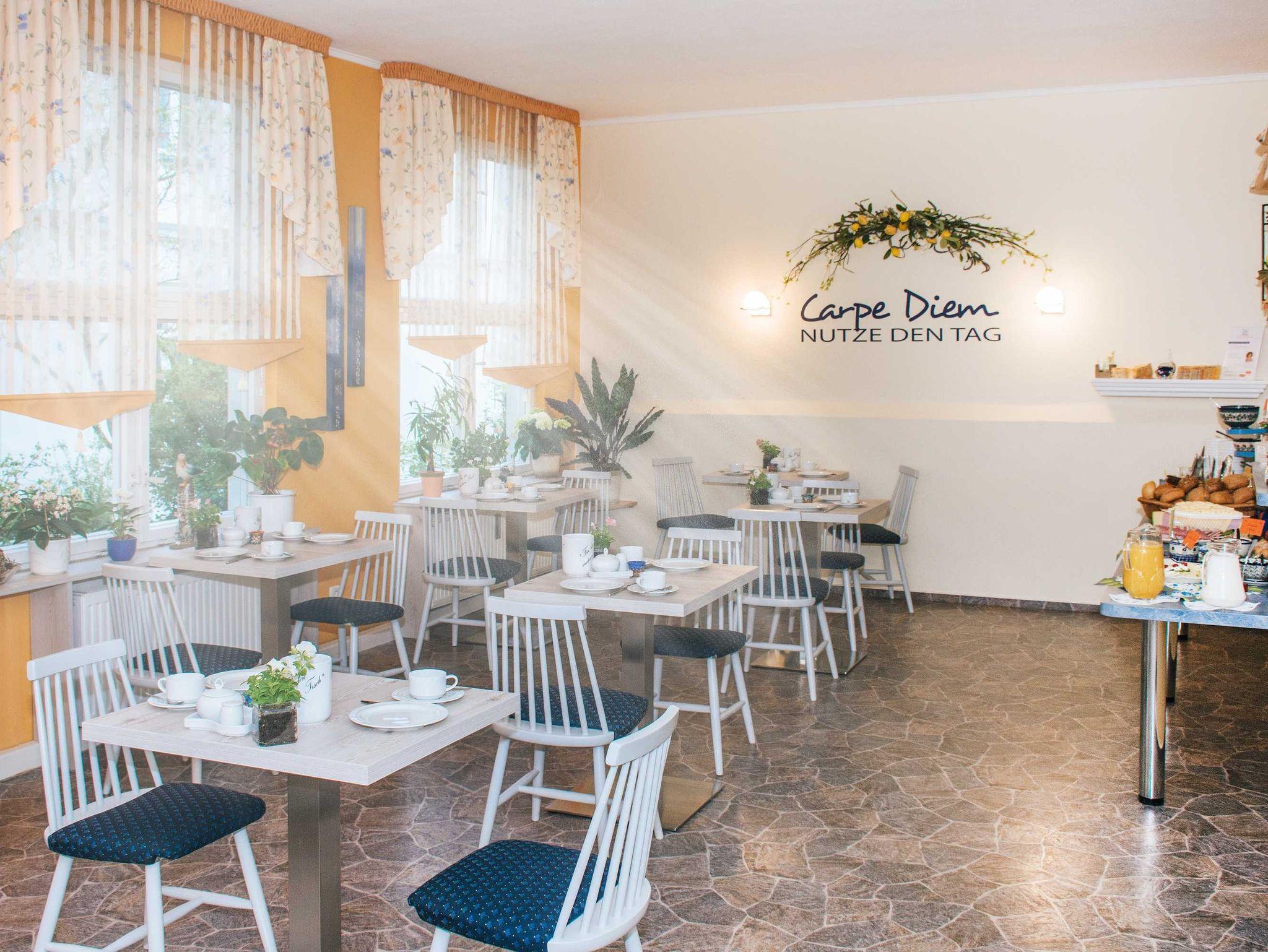 Das Frühstücksbüffet (gesund, regional und auch für Vegetarier genügend Auswahl) können Sie in unserem Frühstücksraum mit angrenzender Terrasse täglich genießen. (in den Hotelzimmern inkl., in den Ferienwohnungen zubuchbar).