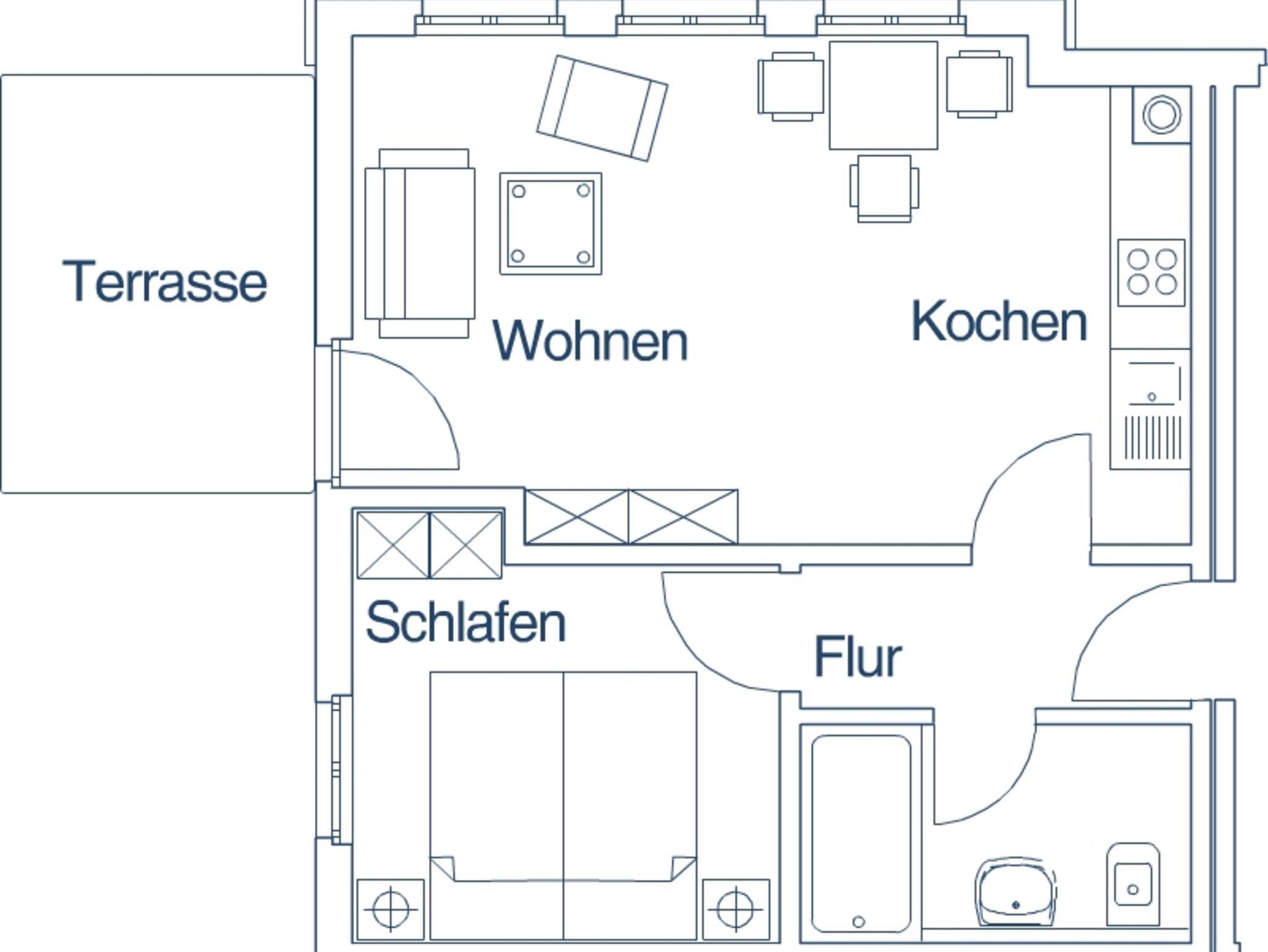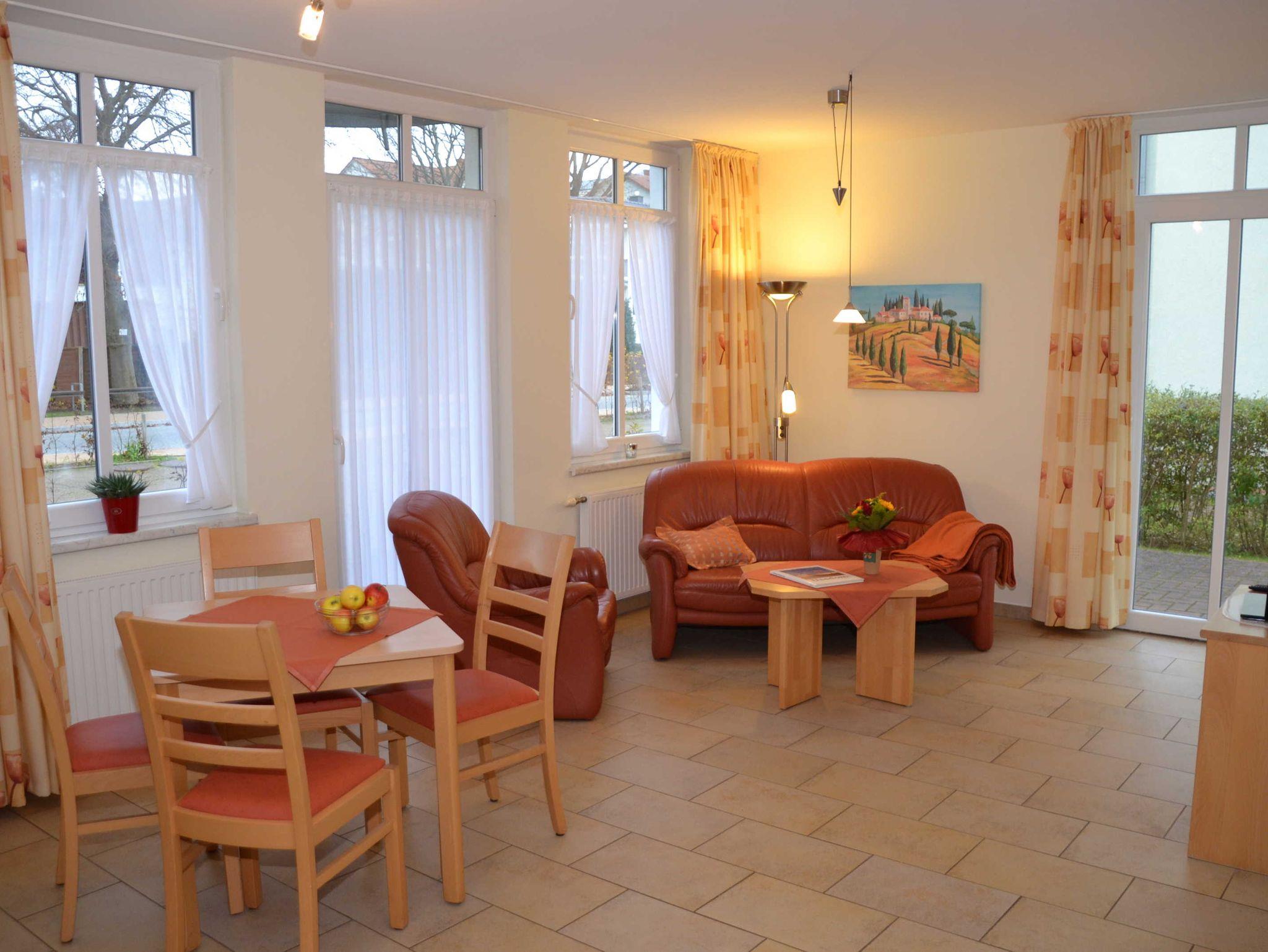 Diese stilvoll eingerichtete Wohnung mit 40² liegt im Erdgeschoss. Es gibt einen Wohnraum mit kompletter, gut ausgestatteter Küchenzeile, ein separates Schlafzimmer mit 1,80 m breitem Doppelbett, ein Bad mit Dusche (Wo. 1) oder Badewanne mit Duschvorrichtung (Wo. 4) sowie eine möblierte Terrasse. Glatte Fußböden, Ledercouch und abwischbare Bezüge kommen Allergikern entgegen. Die Nichtraucherwohnung wirkt durch viele, auch bodentiefe Fenster hell und freundlich.